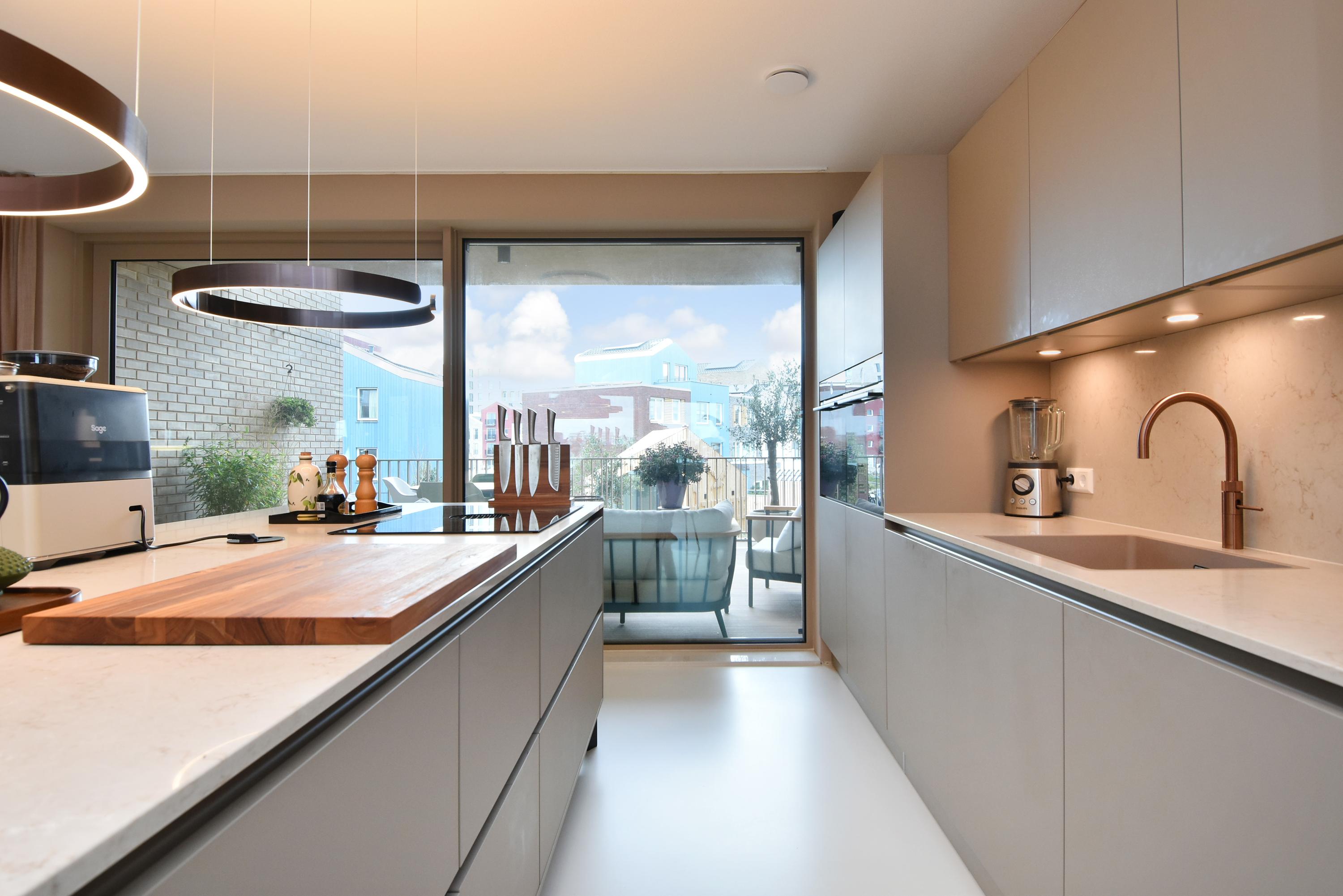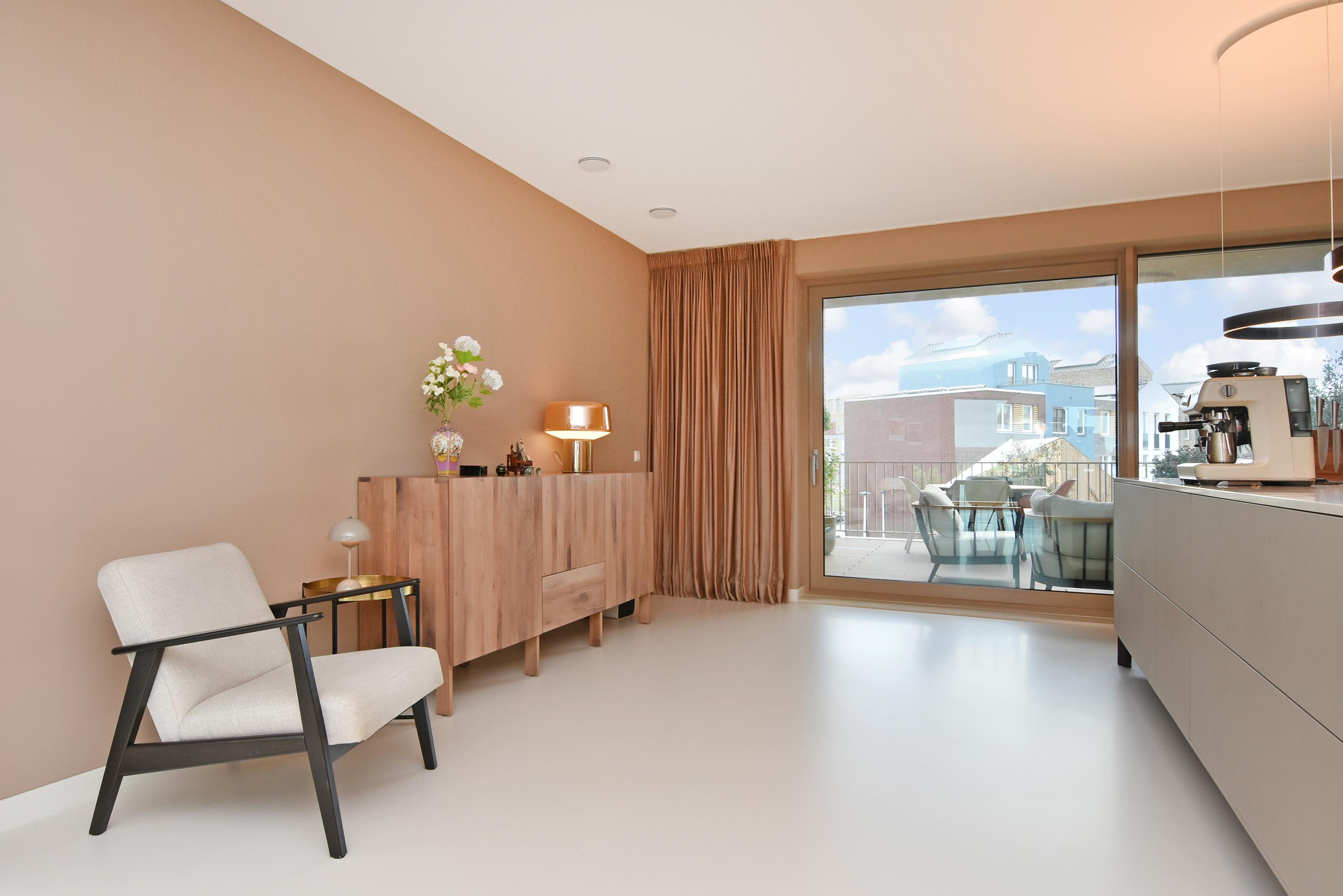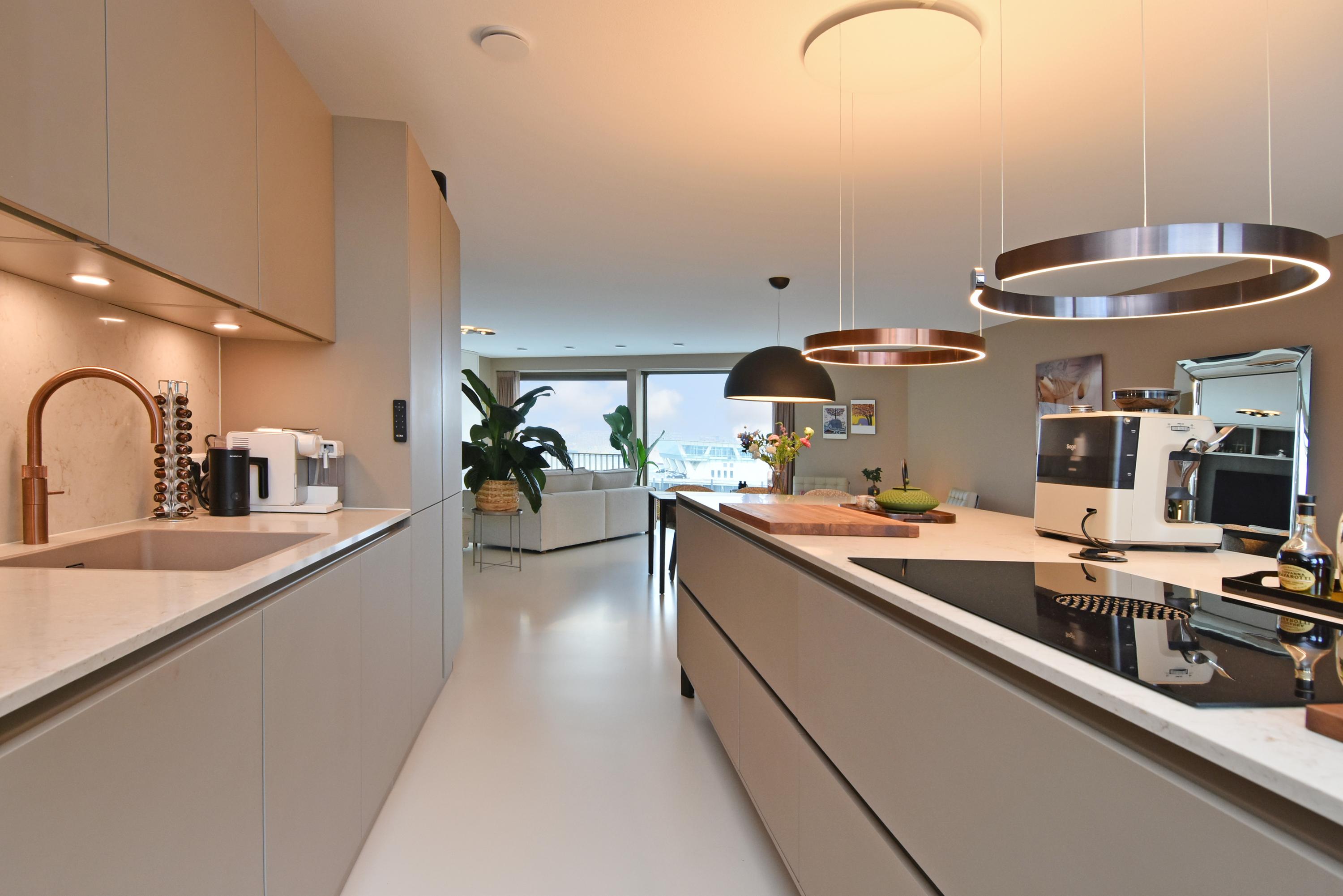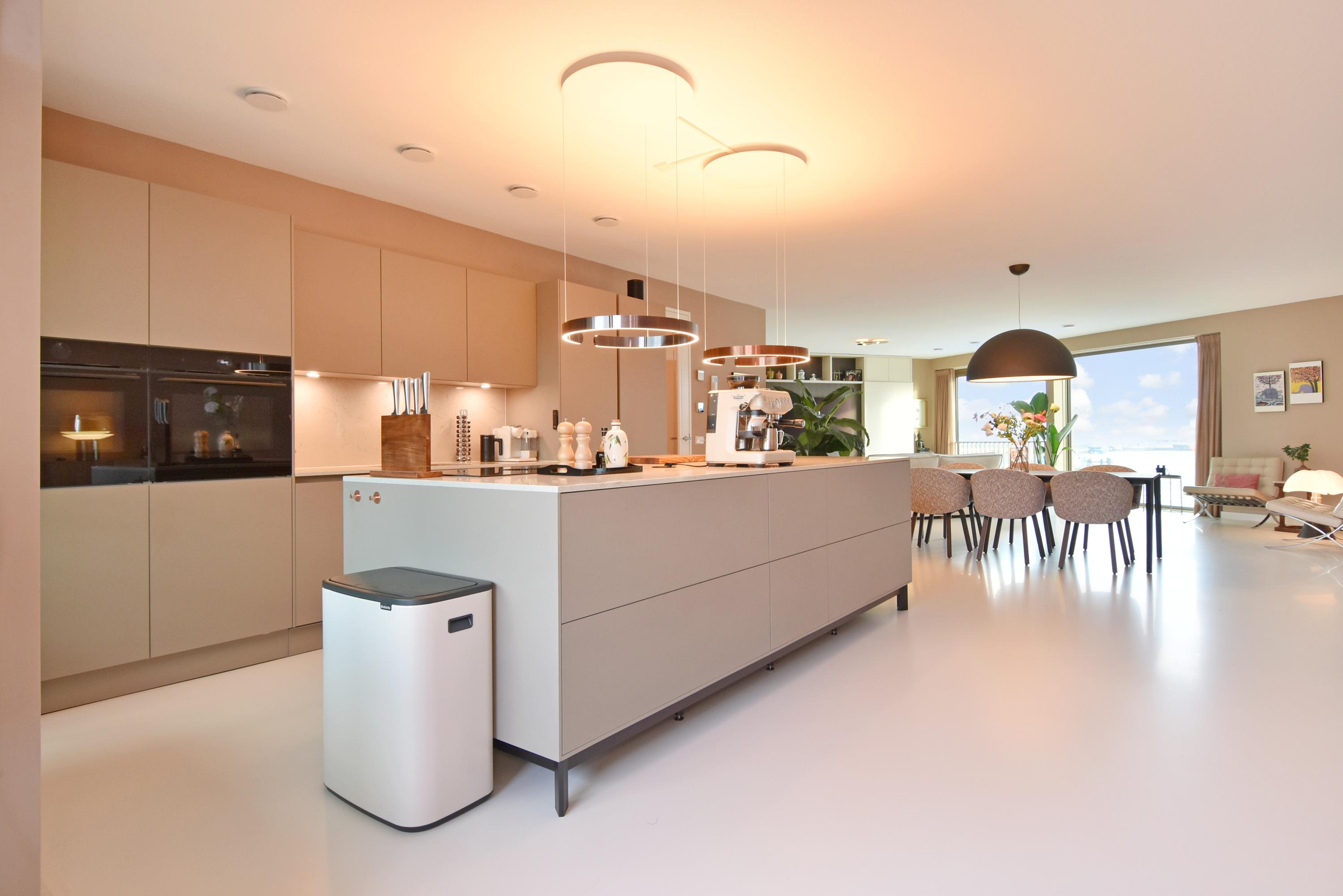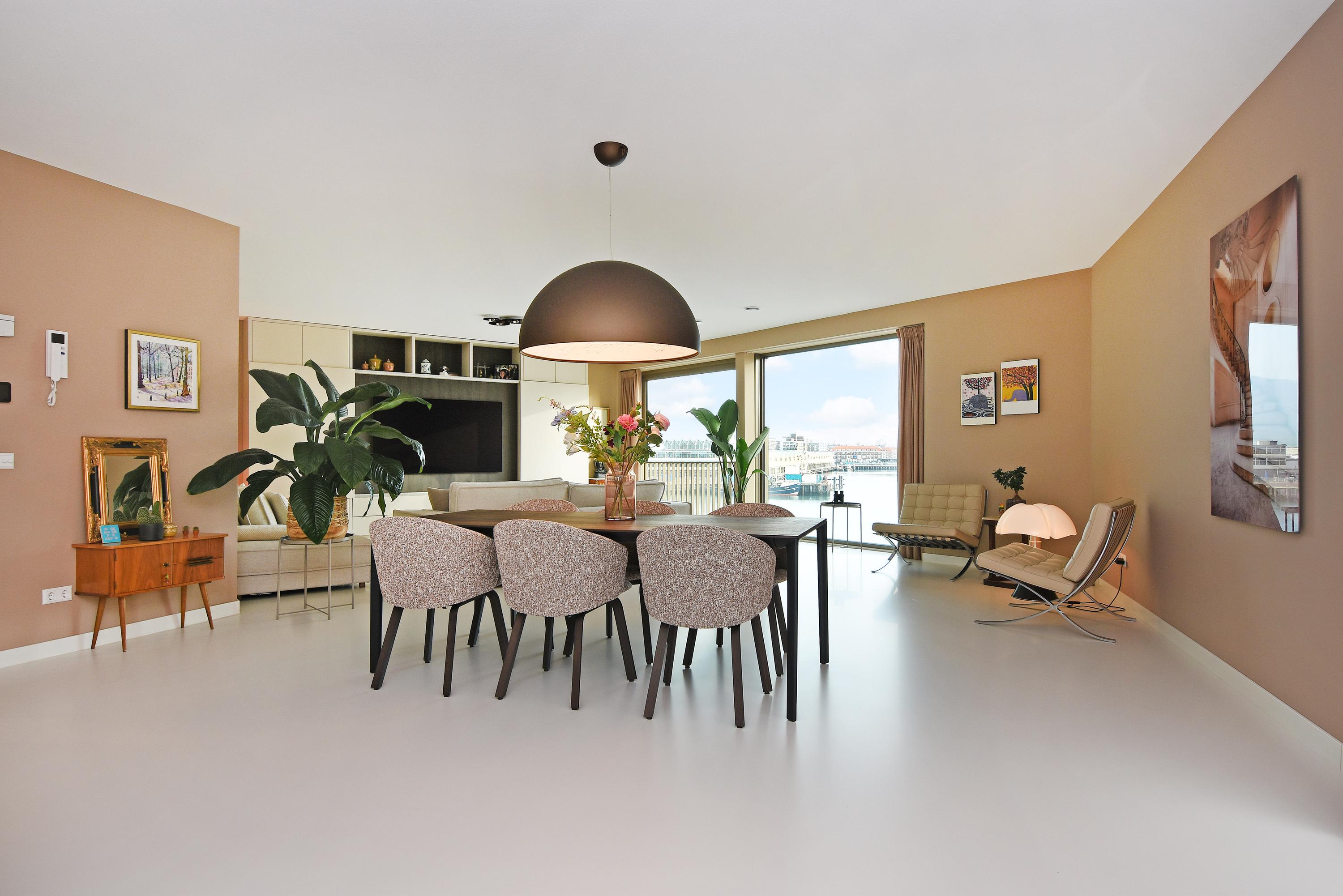 Apartment Den Haag with sea views offers a rare fusion of modern architecture and understated luxury. Situated in Scheveningen, this high-end apartment spans 135 m² and features expansive floor-to-ceiling windows that frame the panorama of the harbour and the North Sea. The living area flows seamlessly into a designer kitchen with a cooking island and integrated luxury appliances. Sliding doors invite the outdoors in, connecting the main living space to a private 29 m² balcony overlooking a landscaped courtyard, perfect for quiet afternoons or evening gatherings.