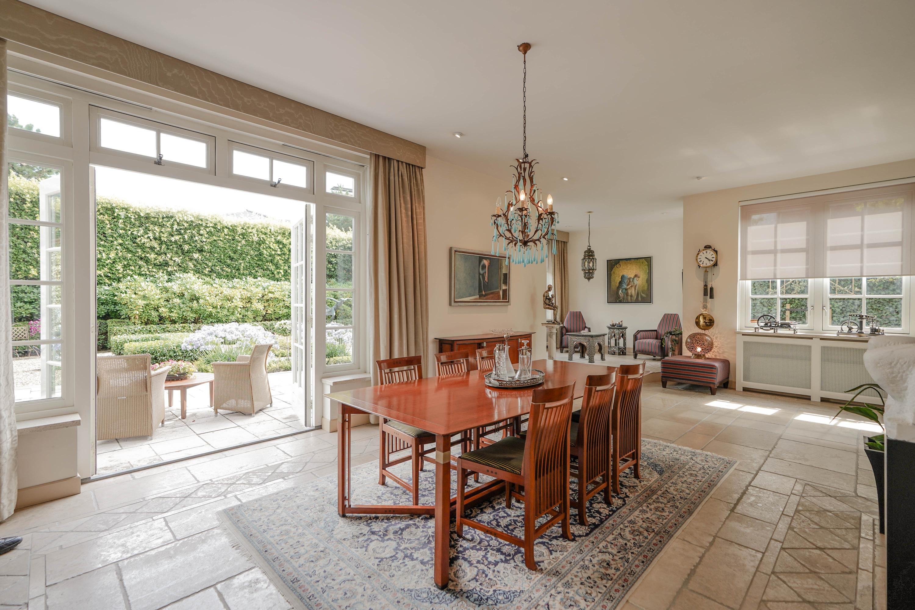 De L-vormige living heeft een plafondhoogte van 3,10 meter. De serre met verhoogd podium voegt een sfeervolle, extra dimensie toe. Een dubbele pui geeft toegang tot de tuin. De ramen op de zuid- en westkant zijn voorzien van zonwerende rolgordijnen. In het plafond zijn 15 inbouwspots aangebracht. De monumentale, Franse open haard werkt op gas.