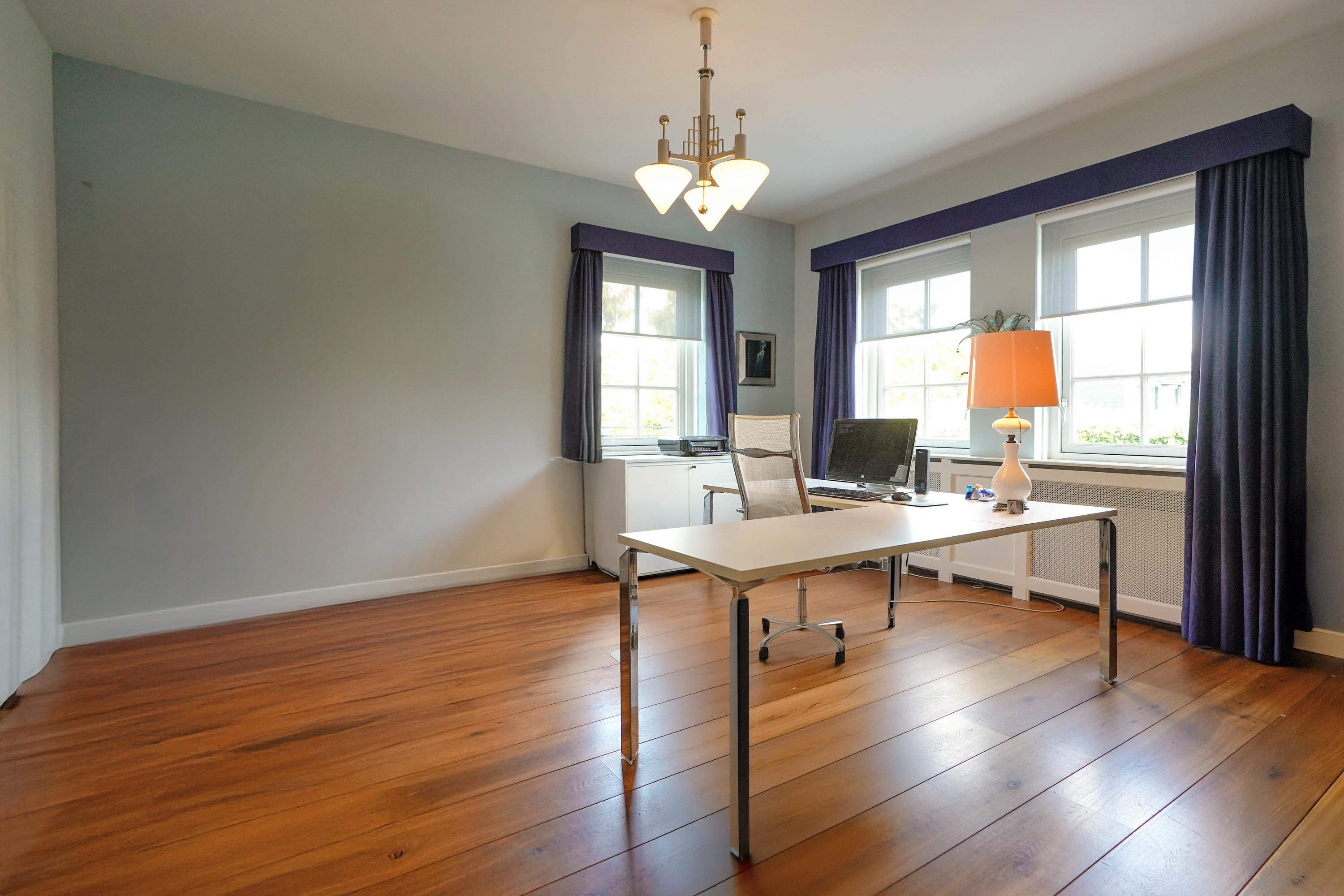 De werkkamer heeft twee ramen aan de straatkant en een zijraam aan de oprit. Zakelijke relaties kunnen gescheiden van het privé woongedeelte ontvangen worden.