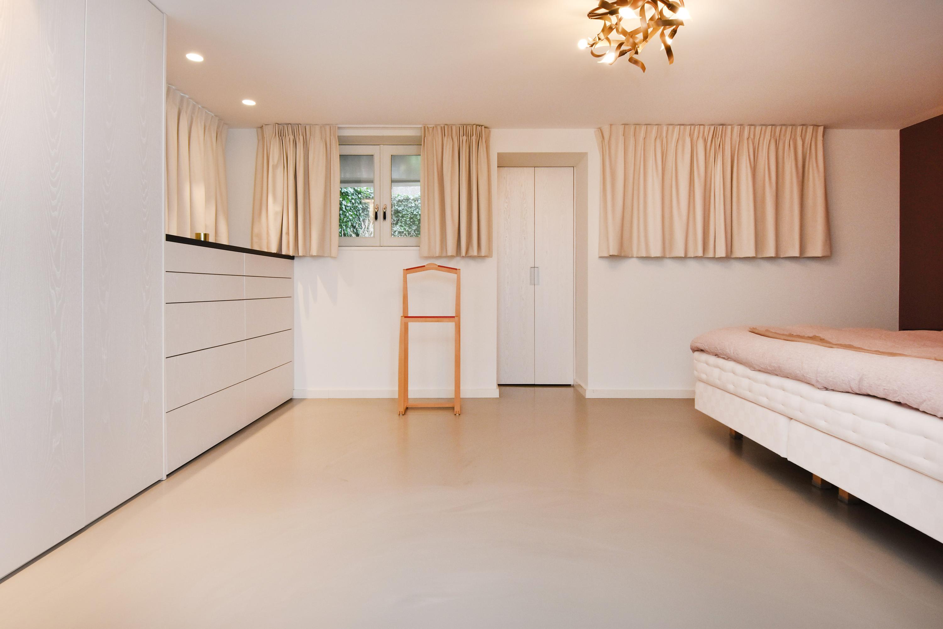 Past the front door is a hall with a modern guest lavatory and coat cupboard. This hallway leads to the expansive living room along with an interconnected dining area and open eat-in kitchen. The living area, which is above street level, is exceptionally bright thanks to the multiple nearly 4-metre-high windows that not only make the space feel even roomier, but also offer a clear vista. At the back is a balcony with stairs down to the south-facing garden with a storage shed and separate exterior entrance. There are also solar-powered awnings that can be operated from inside the apartment.