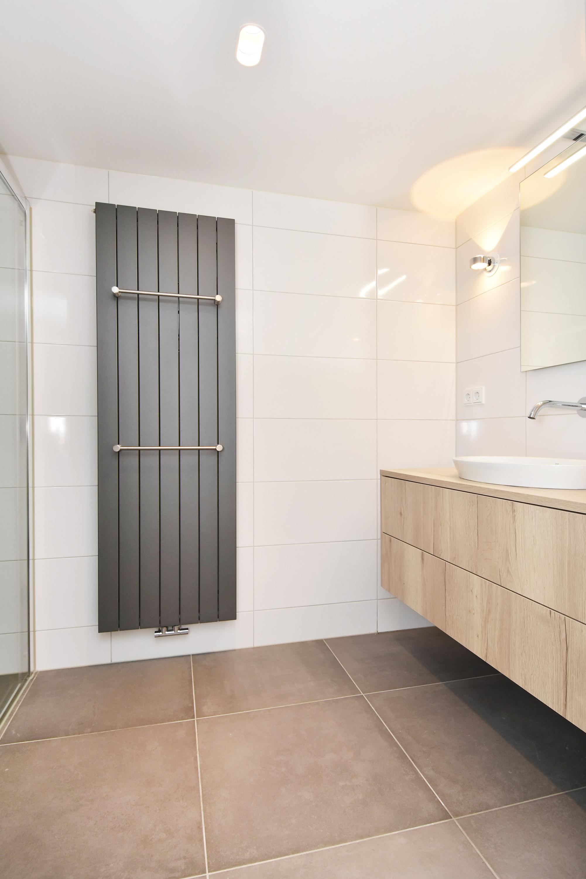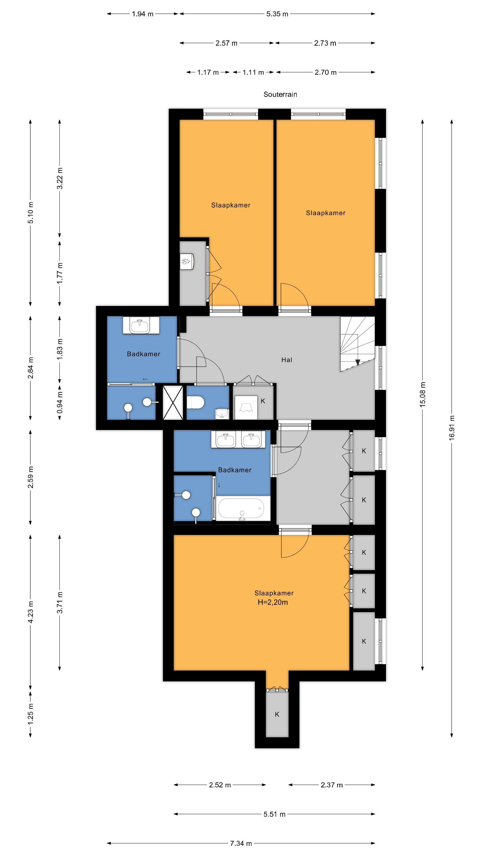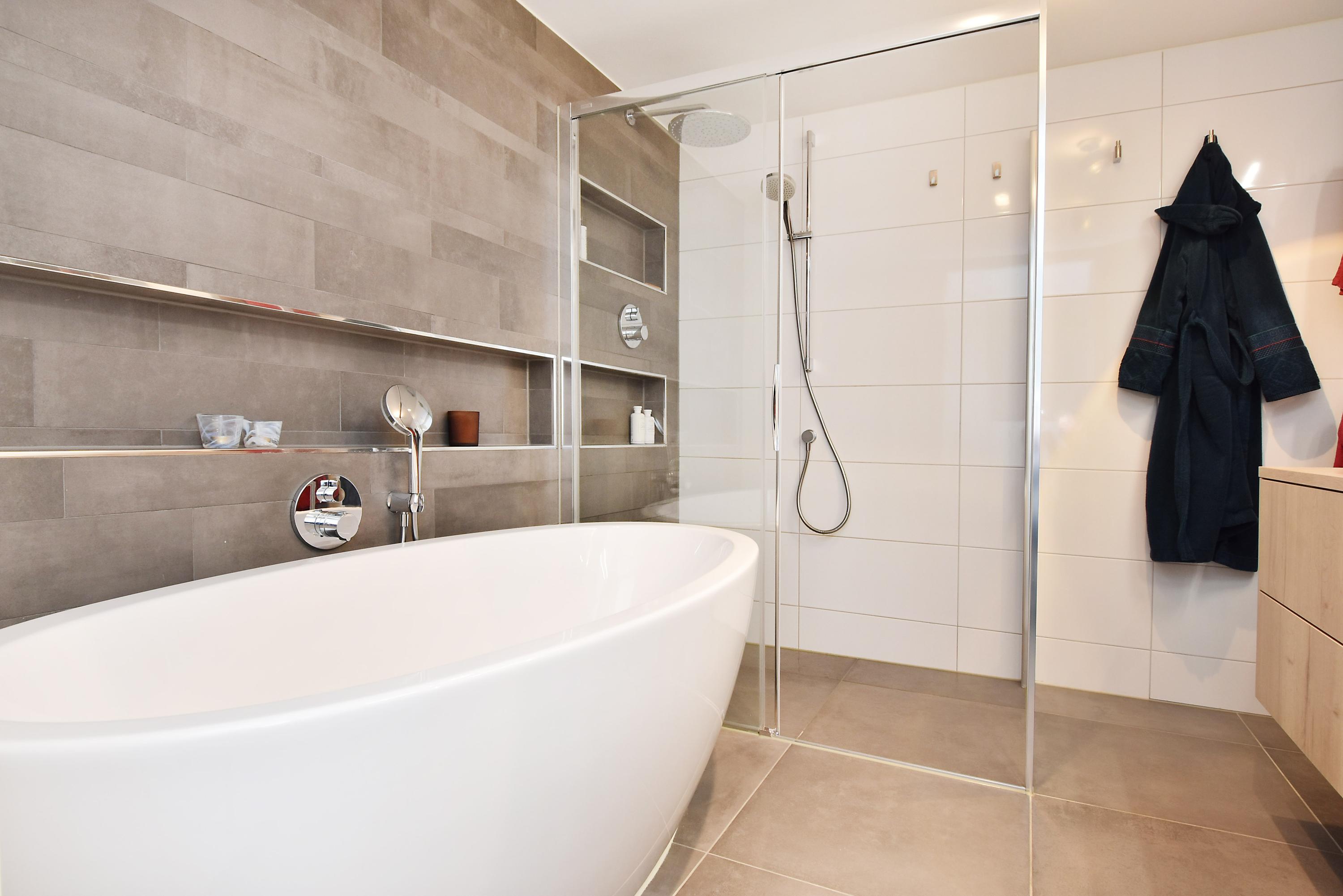 Stairs from the living room descend to the lower level, where there is a central hall with a separate modern wc and the laundry cupboard. Facing the front are 2 good-sized bedrooms, each with lovely shutters and original doors, and a bathroom with large walk-in rain shower, vanity, and heated towel rail. At the back is a dressing room with fitted wardrobes and an adjoining bathroom with a luxurious, free-standing soaking tub, big walk-in rain shower, and double vanity. The dressing room leads to the primary bedroom which features custom-made fitted wardrobes.