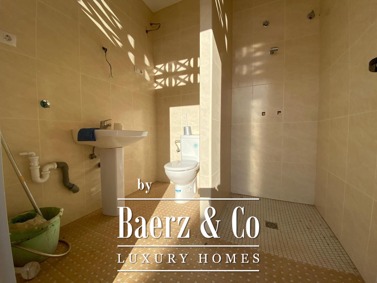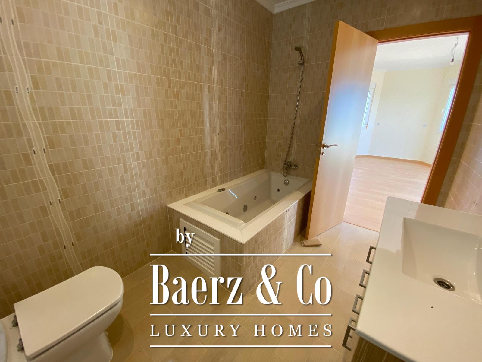 Inside, the villa’s 248 m² living space is orchestrated for comfort. The living room floods with natural light and extends toward a balcony that frames commanding mountain and sea views. The adjacent kitchen echoes this openness, its own balcony access drawing in the landscape at every meal. On this level, two bedrooms share a full bathroom, while the upper floor introduces a master suite with an en-suite bathroom, a walk-in closet, and a private balcony with unbroken vistas. An additional office space provides quiet flexibility.