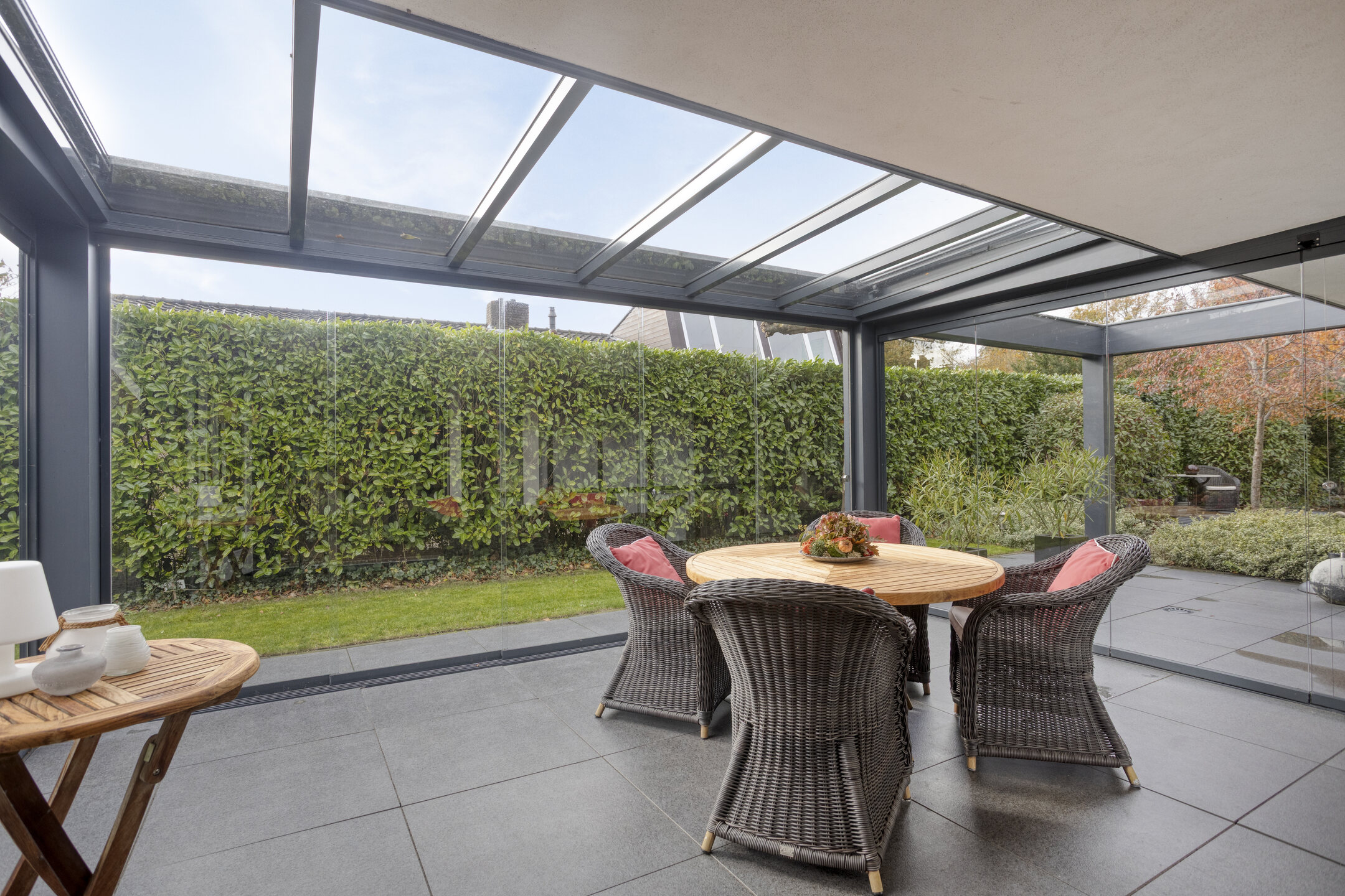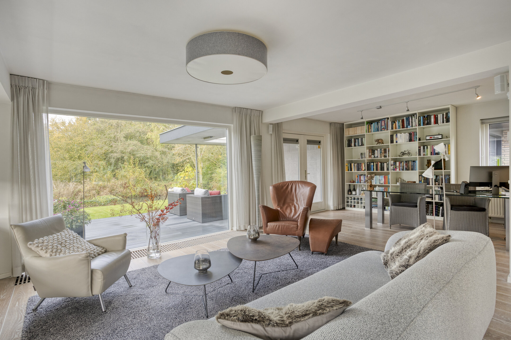 Upon arrival, a spacious hallway opens to oak floors and clean-lined glass doors. The living room and kitchen-diner are divided by a Bellfire double-sided fireplace, anchoring the space with quiet warmth. A luxury kitchen, outfitted with top-grade appliances and a Belgian bluestone worktop, offers both function and ceremony for daily living. The rear façade, defined by expansive glazing, frames the garden’s rhythm and the protected landscape of Egmonderhout beyond.
