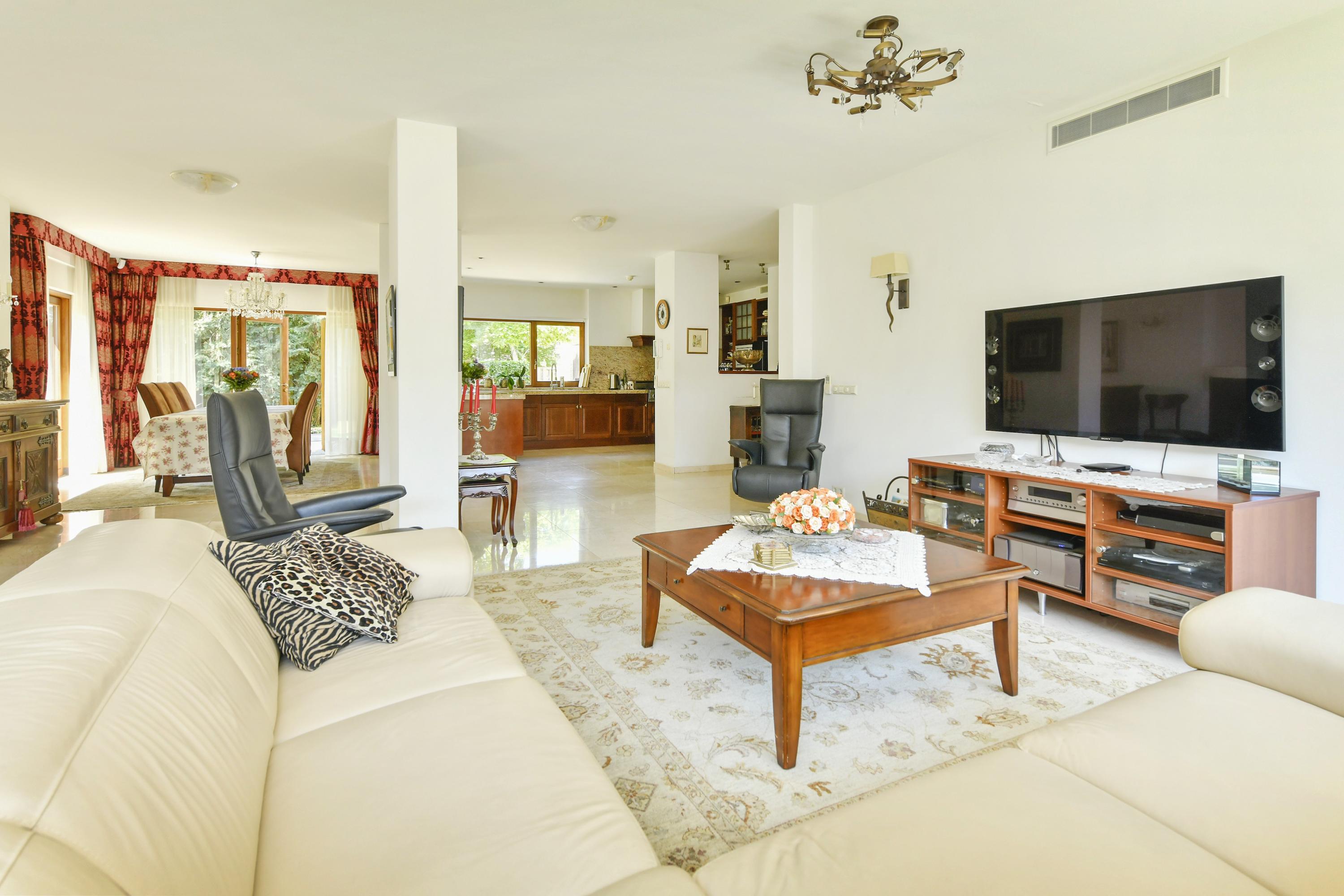 Inside, natural light fills the living room through broad windows and French doors, accentuating the open-plan layout. The kitchen, with built-in appliances, flows into the spacious living zone, establishing a convivial environment for daily life. A utility room provides practical storage and laundry connections. On the ground floor, an adaptable bedroom with en suite bathroom offers privacy for guests or serves as an office or studio.
