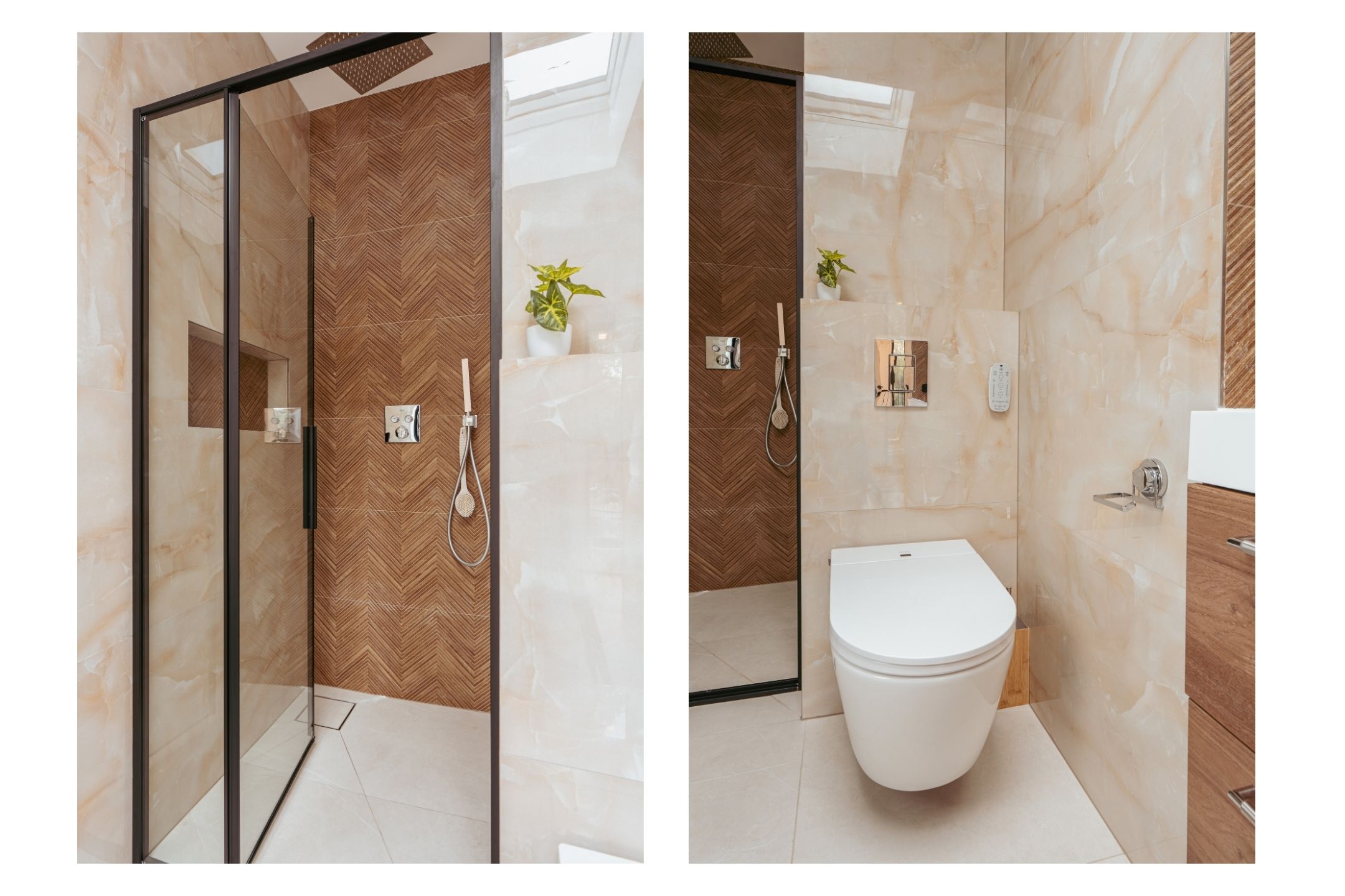 Also located on the ground floor is the impressive master bedroom with an en-suite bathroom. This high-end bathroom is fitted with a walk-in shower, double washbasin with vanity unit, and a toilet. The freestanding bathtub, positioned directly in the bedroom, adds to the luxurious, hotel-style feel. In addition, there is a comfortable guest suite, also with its own private bathroom featuring a washbasin with vanity unit, walk-in shower and toilet. A truly unique feature of this home is the fully self-contained additional living space on this floor, comprising a private living room with kitchen, bedroom and bathroom. This area is ideal for an au pair, live-in care, guests, or a home office. Furthermore, this floor offers a separate toilet, the meter cupboard, and several practical storage spaces. The beautifully landscaped garden is south-facing and includes a generous terrace with a fixed outdoor kitchen and barbecue, perfect for long summer evenings. At the rear of the garden, there is a detached garden house, which can easily be arranged as a home gym, hobby room or home office.