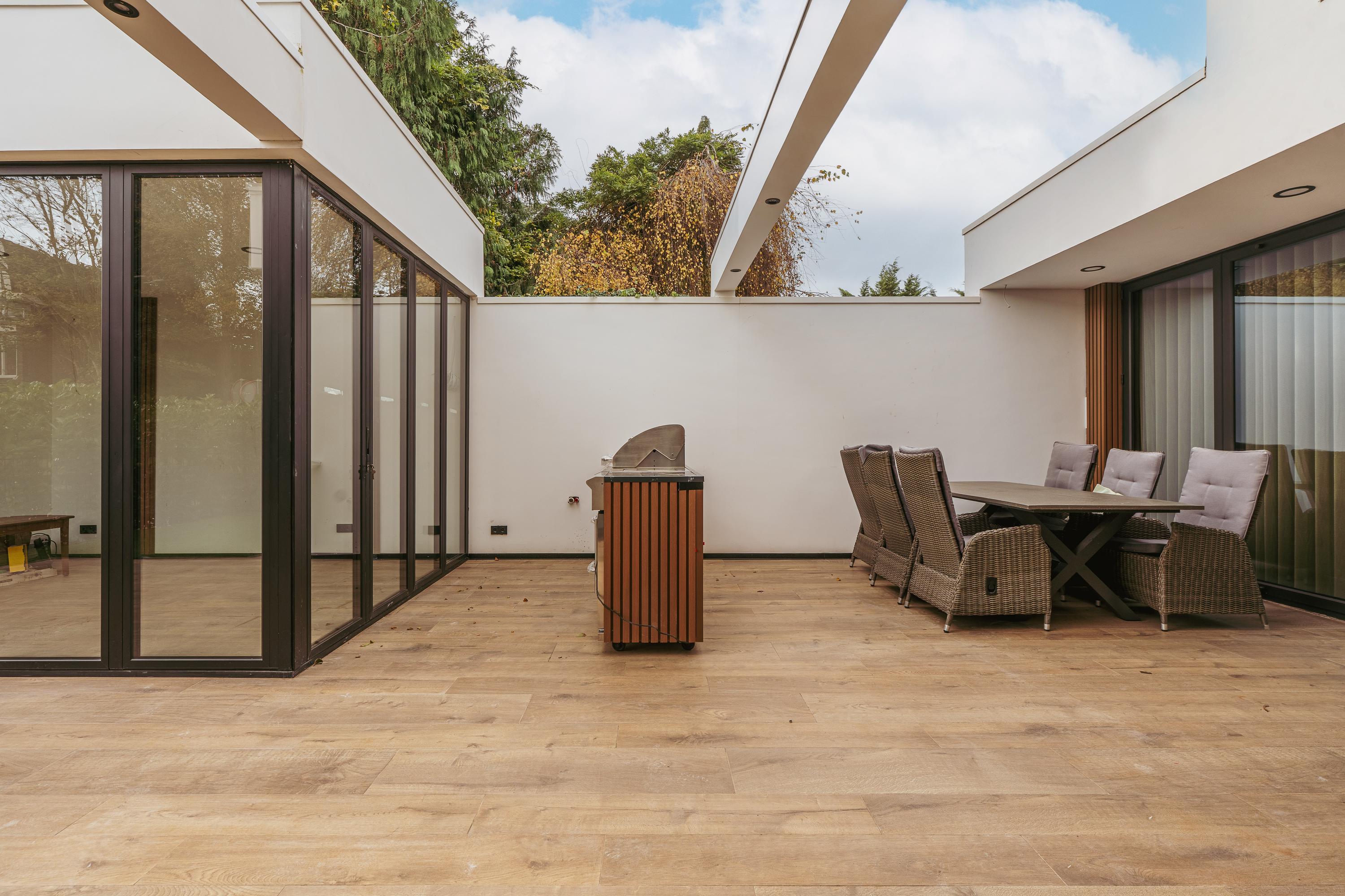 The entrance to the property is reached via the well-maintained front garden. The spacious hallway provides a welcoming first impression and leads into the generous living room, which is characterised by an abundance of natural light. Large windows and glass doors connect the living area directly to the garden terrace, creating a seamless flow between indoor and outdoor living. Adjacent to the living room is the luxurious open-plan kitchen, featuring a spacious cooking island that also serves as a cosy bar seating area. The kitchen is fully equipped and includes an oven and combi-oven, an induction hob with integrated extractor, a climate-controlled wine cabinet, Quooker, dishwasher, fridge and freezer. There is ample space for a large dining table. Behind the kitchen, you will find a spacious utility room and storage area, offering plenty of room for household appliances and pantry items.