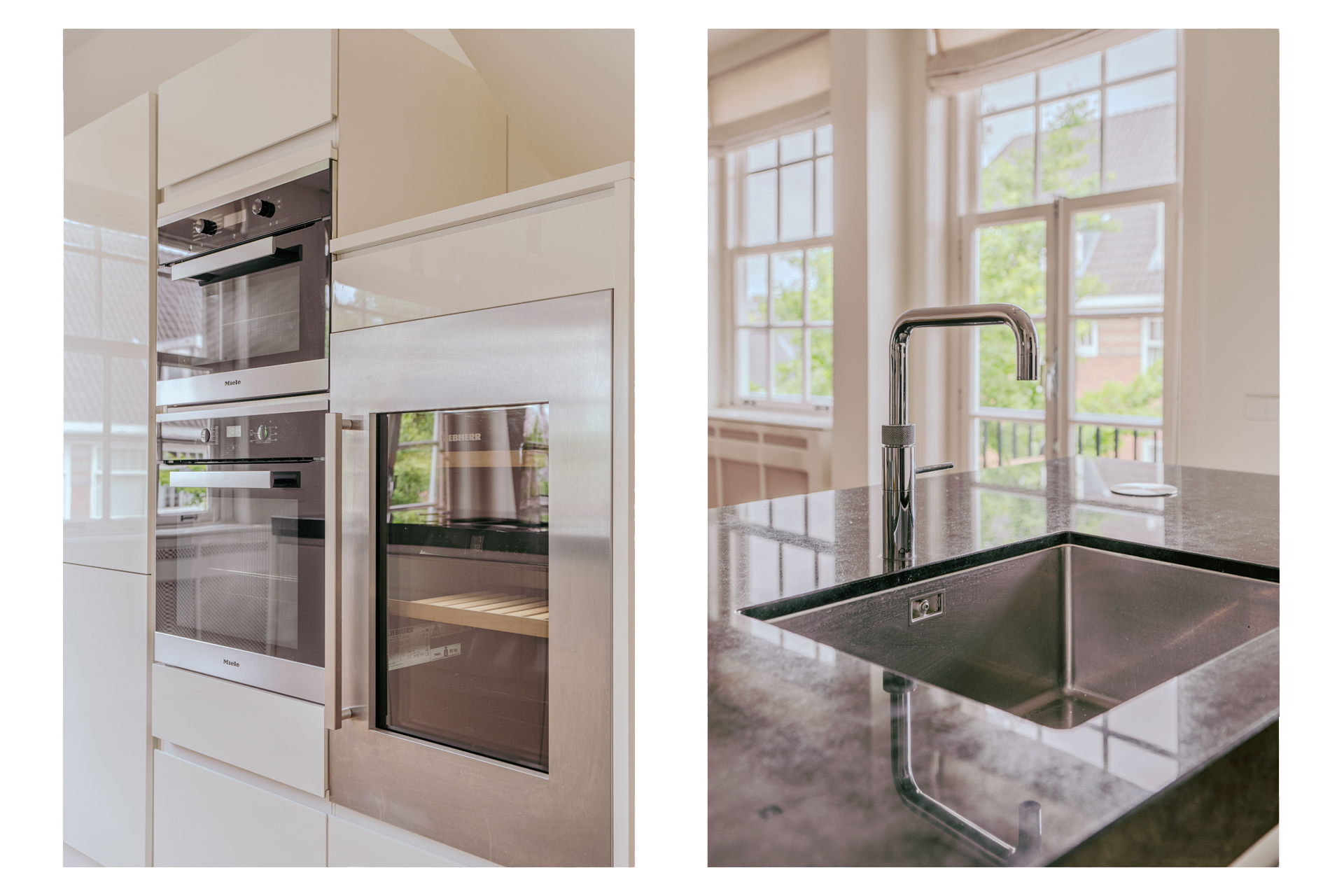 From the hall, elegant steel-framed doors open into a bright and expansive living area. At the front, you'll find a luxurious open-plan kitchen fully equipped with high-end built-in appliances: a 5-burner gas stove, oven, microwave, Quooker, refrigerator, freezer, wine cooler, and dishwasher. The generous kitchen island with bar seating is the social centerpiece of the home, ideal for relaxed evenings with family and friends.