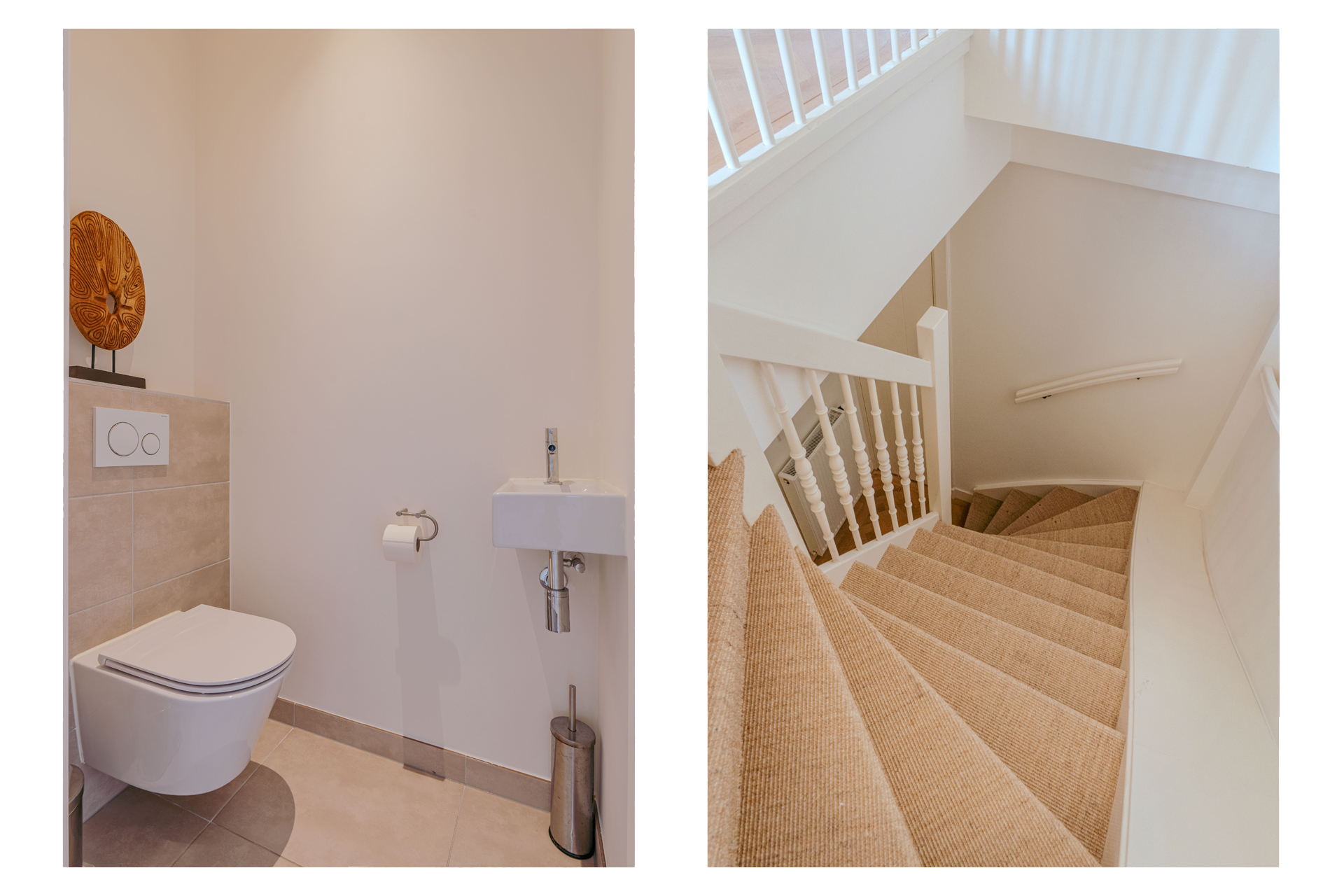 The landing—boasting impressive ceiling height reaching into the roofline, skylights, and clever storage—gives access to all rooms on this level. At the rear is a comfortable bedroom with built-in wardrobes and French doors to a sunny roof terrace. The master bedroom spans the full depth of the building and features air conditioning, custom-made wardrobes, and beautiful original wooden beams that create a warm and inviting atmosphere. Double doors open directly onto the spacious roof terrace—an exceptionally private outdoor area where you can soak up the sun in complete peace. Centrally located on this floor is the stylish bathroom, luxuriously appointed with underfloor heating, a freestanding bathtub, walk-in shower, double washbasin with cabinet, and a second toilet. Large skylights provide plenty of natural light.