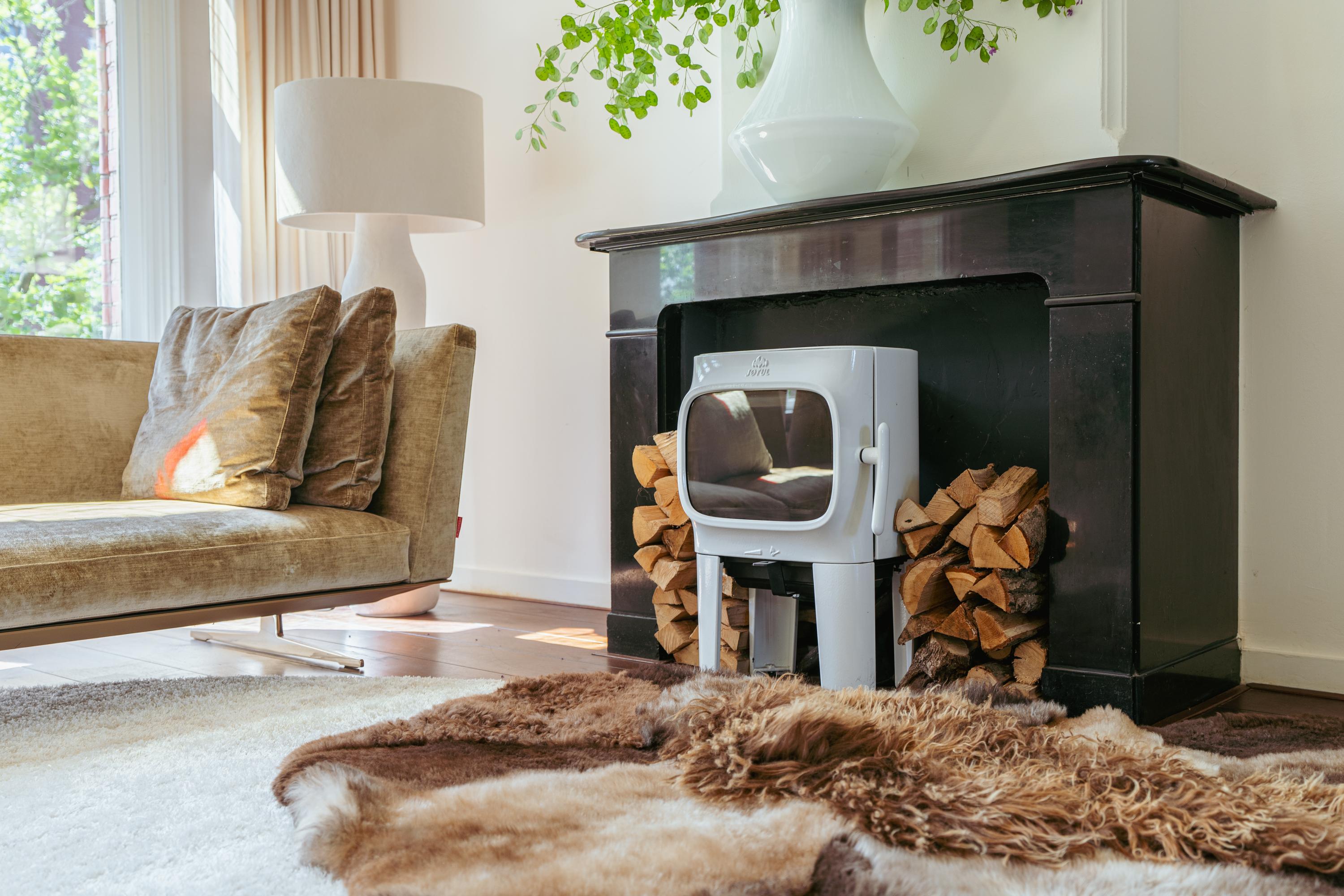 From the hallway—equipped with custom-made wardrobe cabinets—you enter the sunlit living room, complete with a wood-burning stove and an original natural stone mantelpiece. At the front of the home is a cozy study area and access to a wide, sunny south-facing balcony. Centrally located is a custom-built intermediate space with climate-controlled wine fridge, also ideal as a library or reading nook. This connects the living and dining areas via beautiful original sliding doors.