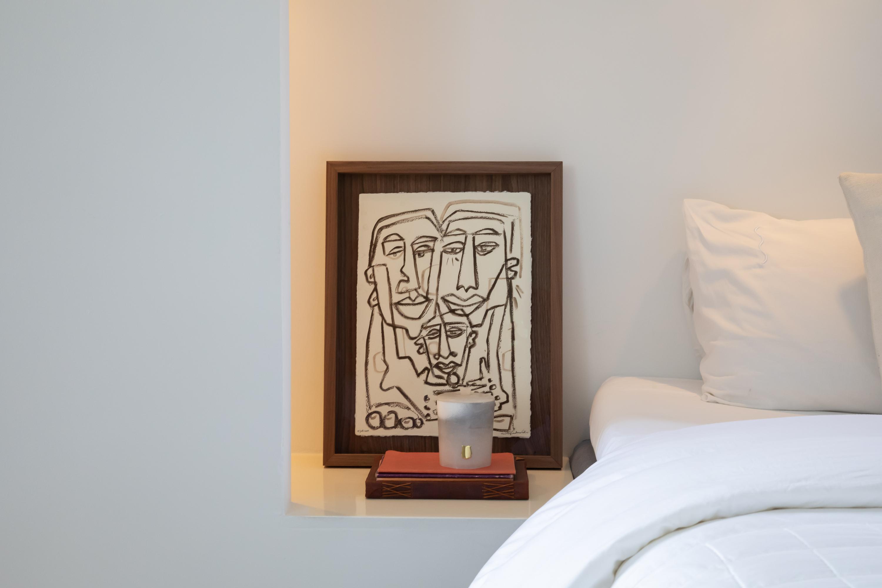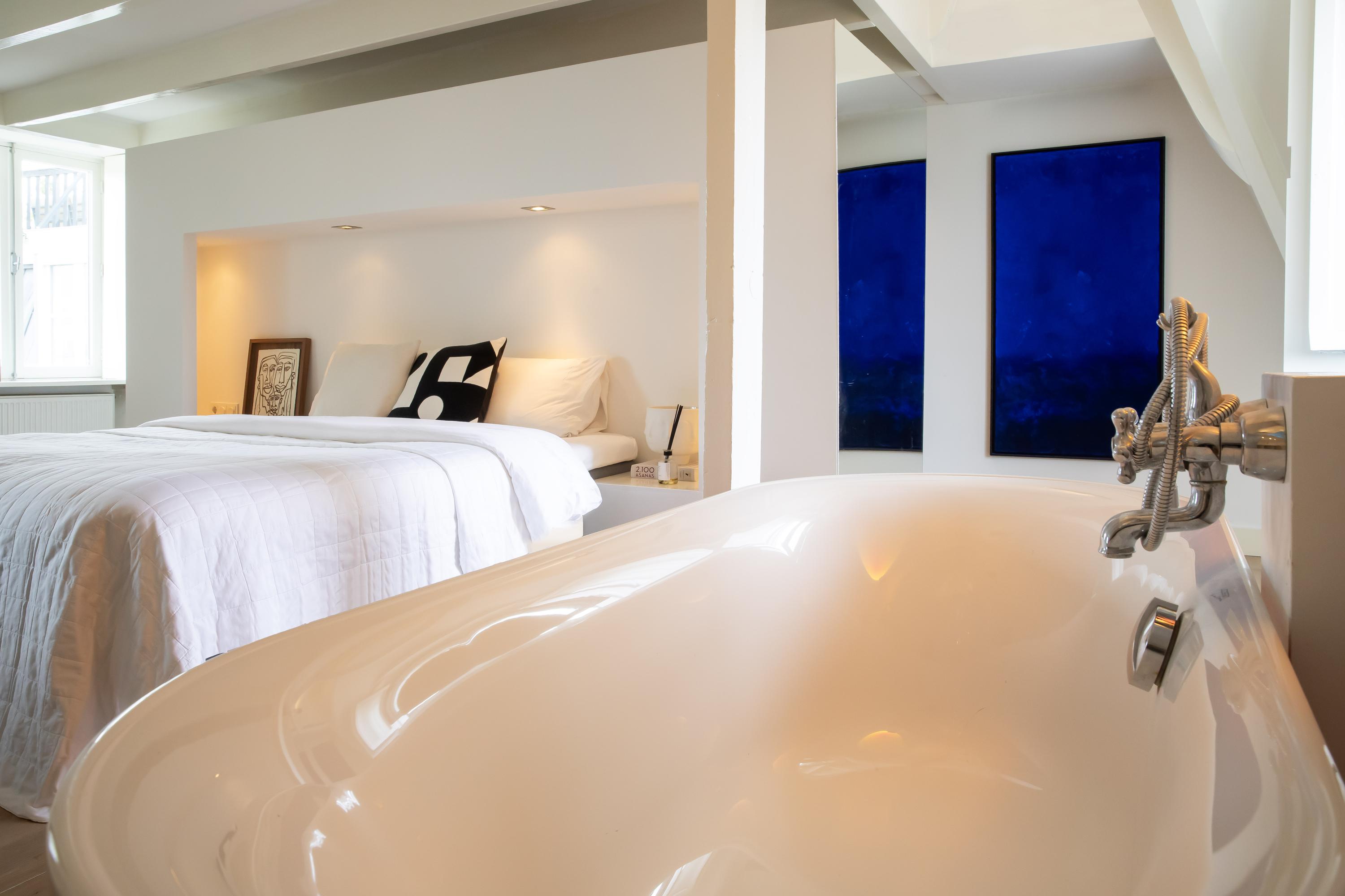 On the top floor you will find the spacious master bedroom, complete with a stylish built-in bed unit with integrated lighting, a freestanding bathtub, air-conditioning, and a characteristic beam construction. The en-suite bathroom features industrial details, a double sink with cabinet, walk-in shower, and toilet.