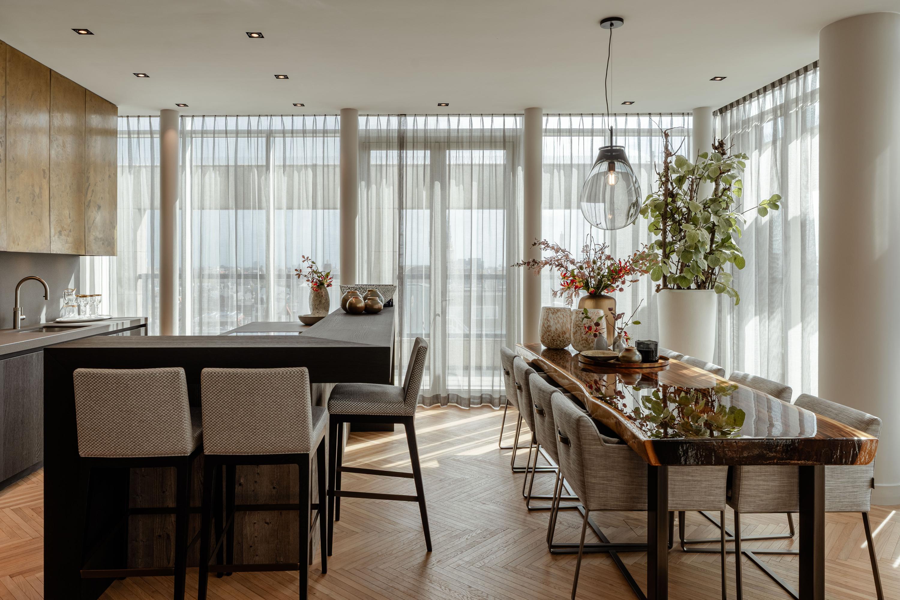 The open-plan kitchen with cooking island forms the heart of the home. Fully equipped with premium Miele appliances, including a wine cooler, steam oven, and coffee machine, it flows into the dining area and the large terrace, where you can enjoy a truly unique view over Dam Square.