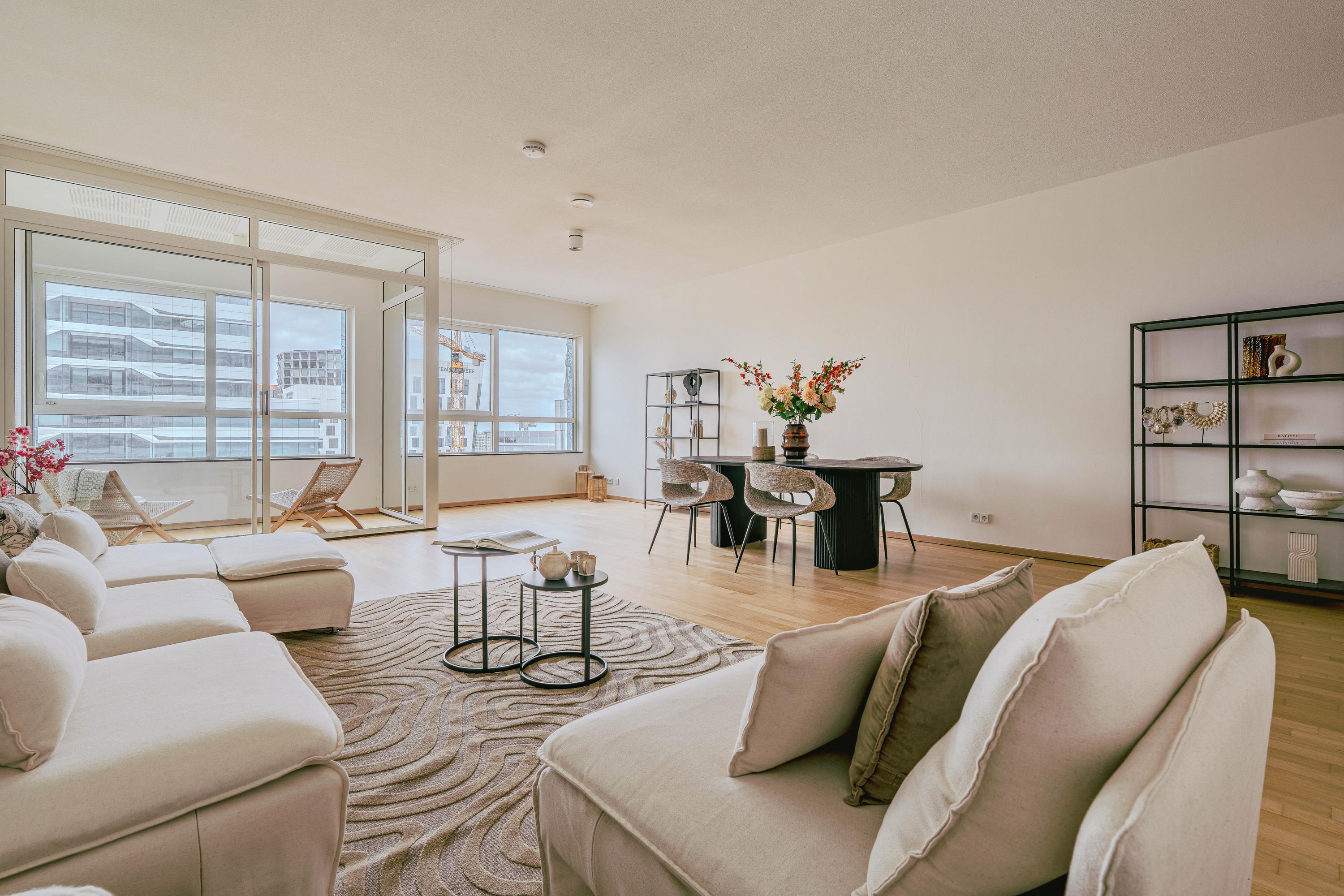 Throughout, high-quality finishes underscore the apartment’s refined stature. The open kitchen is equipped with select built-in appliances, facilitating seamless everyday living and understated entertaining. Separate utility and storage areas provide considered convenience.