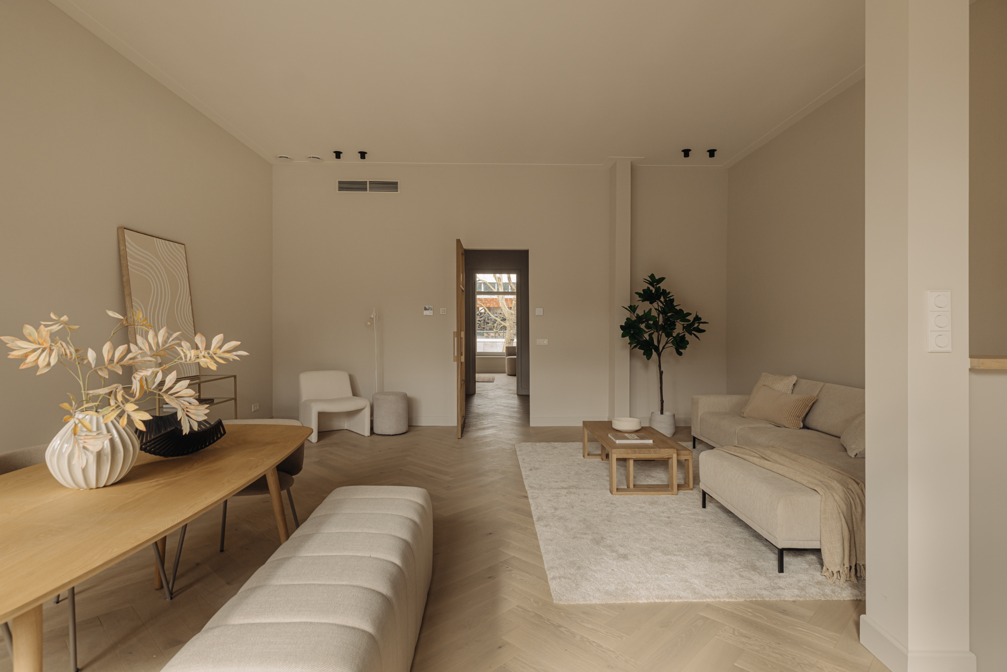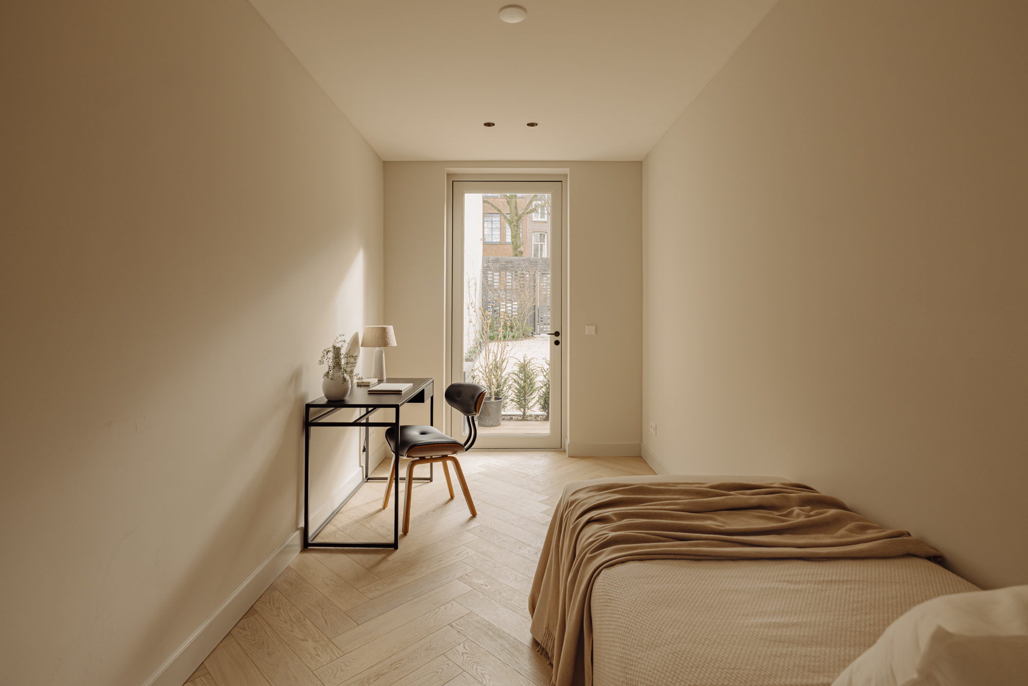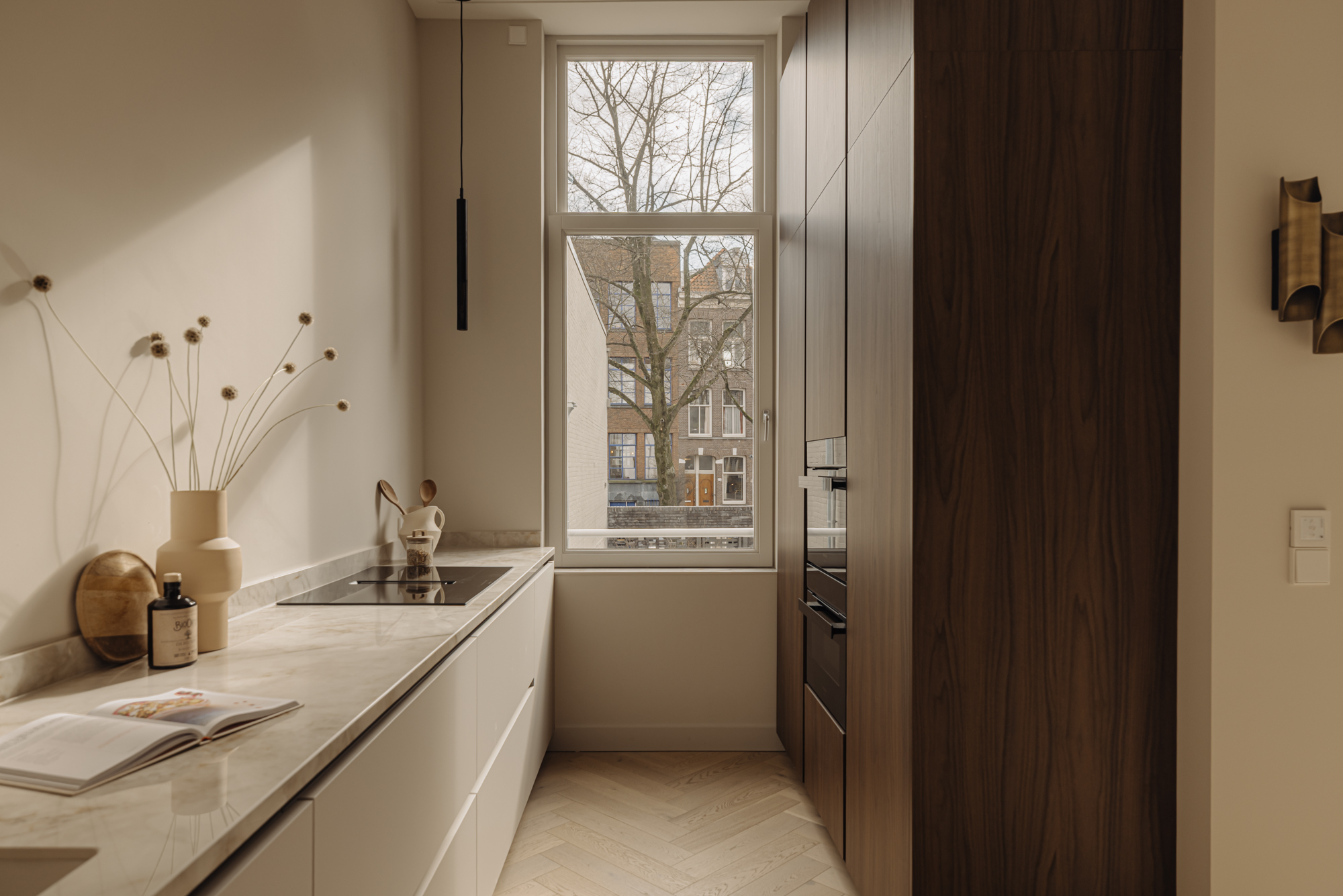 Apartment Amsterdam is presented across 182 m² of refined space, offering four bedrooms, two bathrooms, a south-facing balcony of 7 m² and an 11 m² terrace. Located in the Hemony complex on a quiet street in De Pijp, this residence is freehold and enveloped in a sense of urban calm. The double ground-floor layout welcomes you with high ceilings, luxury herringbone flooring and a palette of warm, subtle tones. The Italian-designed kitchen features white cabinetry combined with walnut accents and marble worktops, blending visual clarity with practical storage and top appliances.