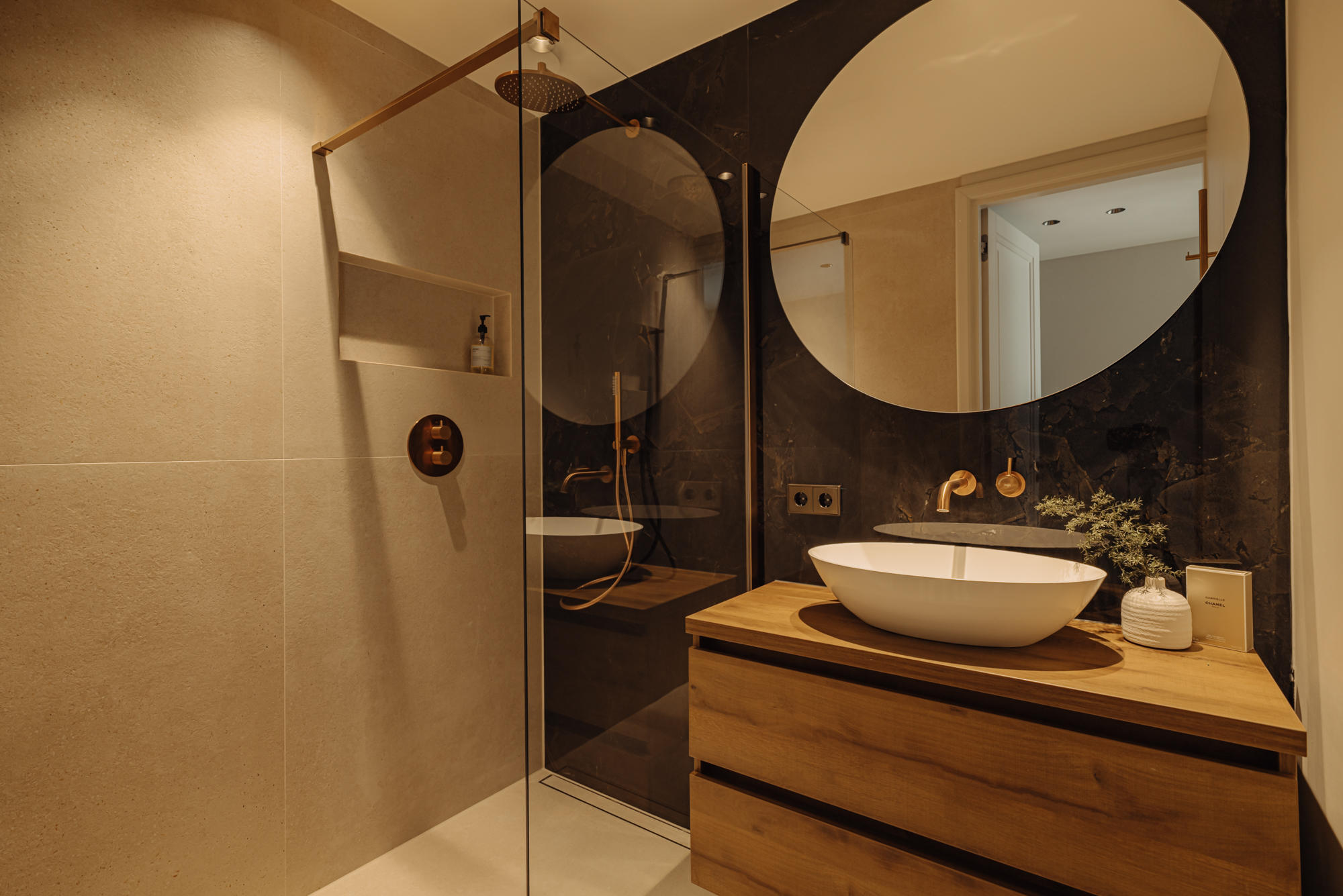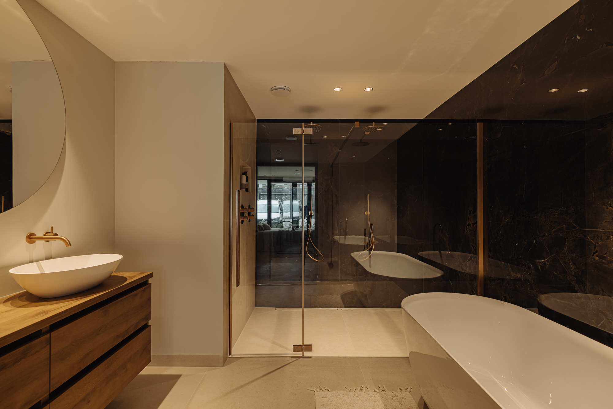 Natural light filters into spacious living areas and bedrooms, with French doors opening to the balcony and terrace. The apartment’s two levels are connected by an internal staircase, offering a master suite with an en-suite bathroom that includes a double walk-in shower and bath. Climate is expertly managed by underfloor heating, air conditioning and an advanced heat recovery system, supporting the property’s A+++ energy class. Comprehensive insulation, triple glazing and sustainable features, including solar panels, reflect a meticulous approach to comfort and efficiency.