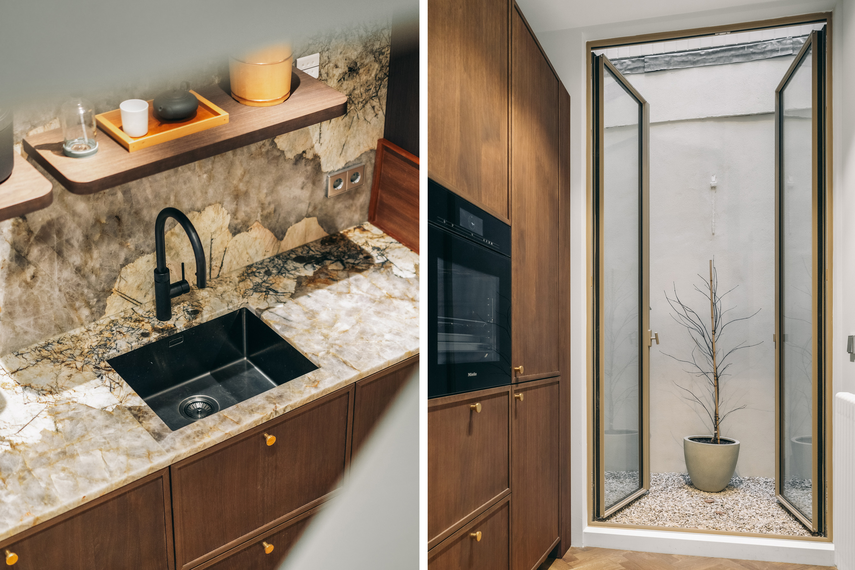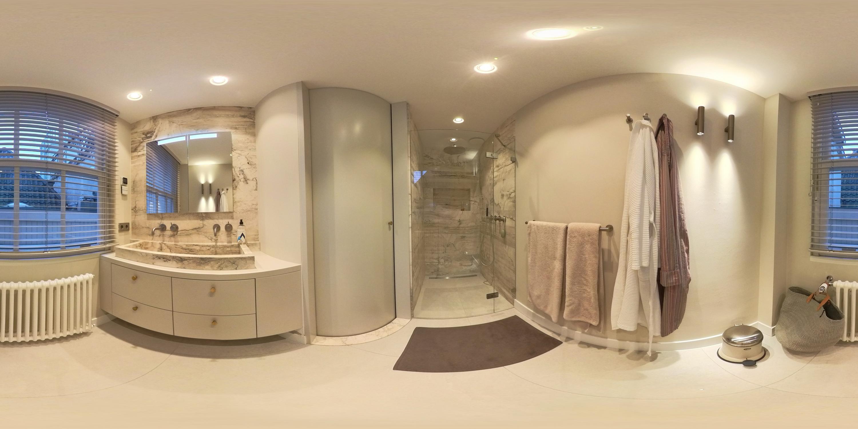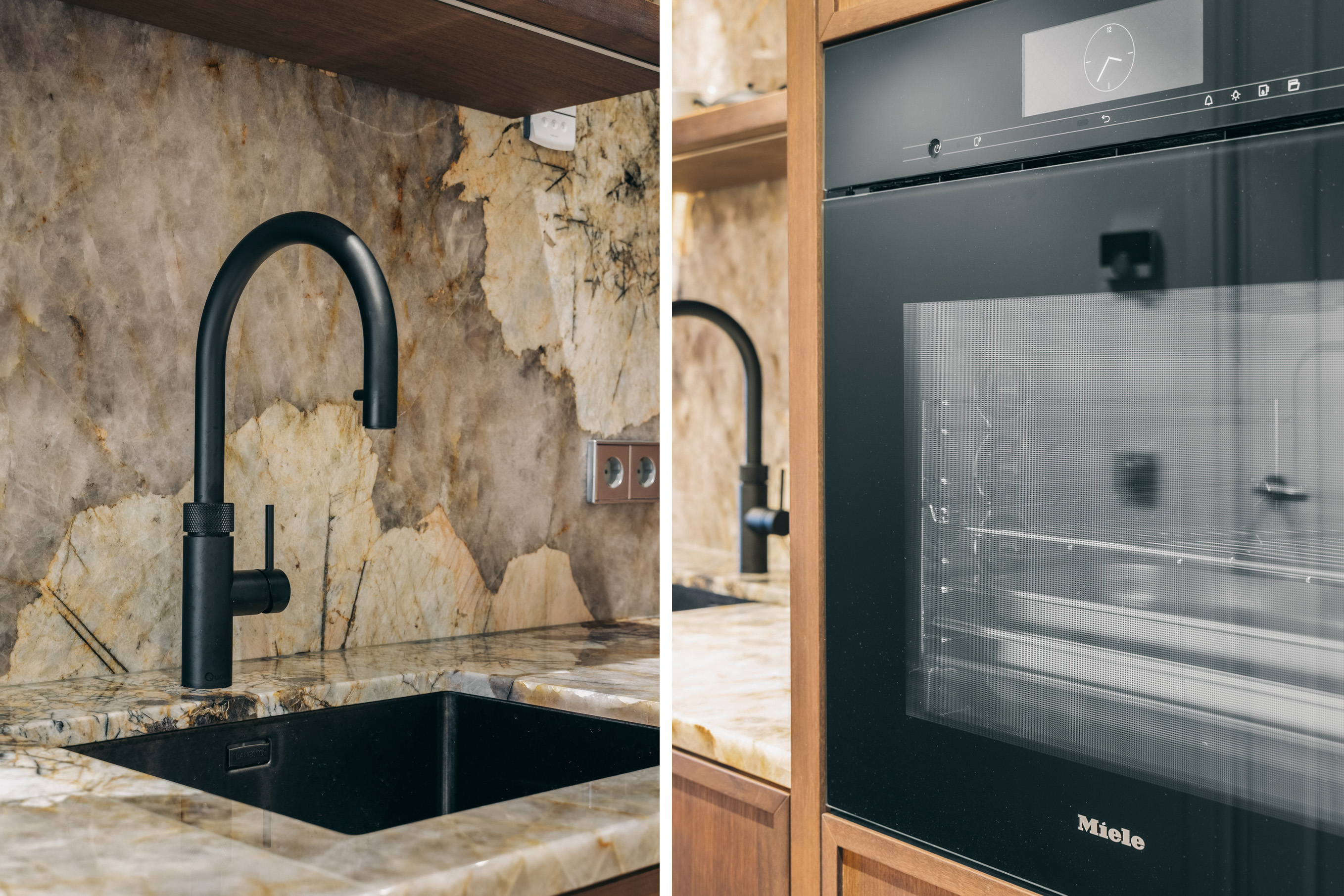 - Sanitary areas finished with travertine walls and ceramic floor tiles;