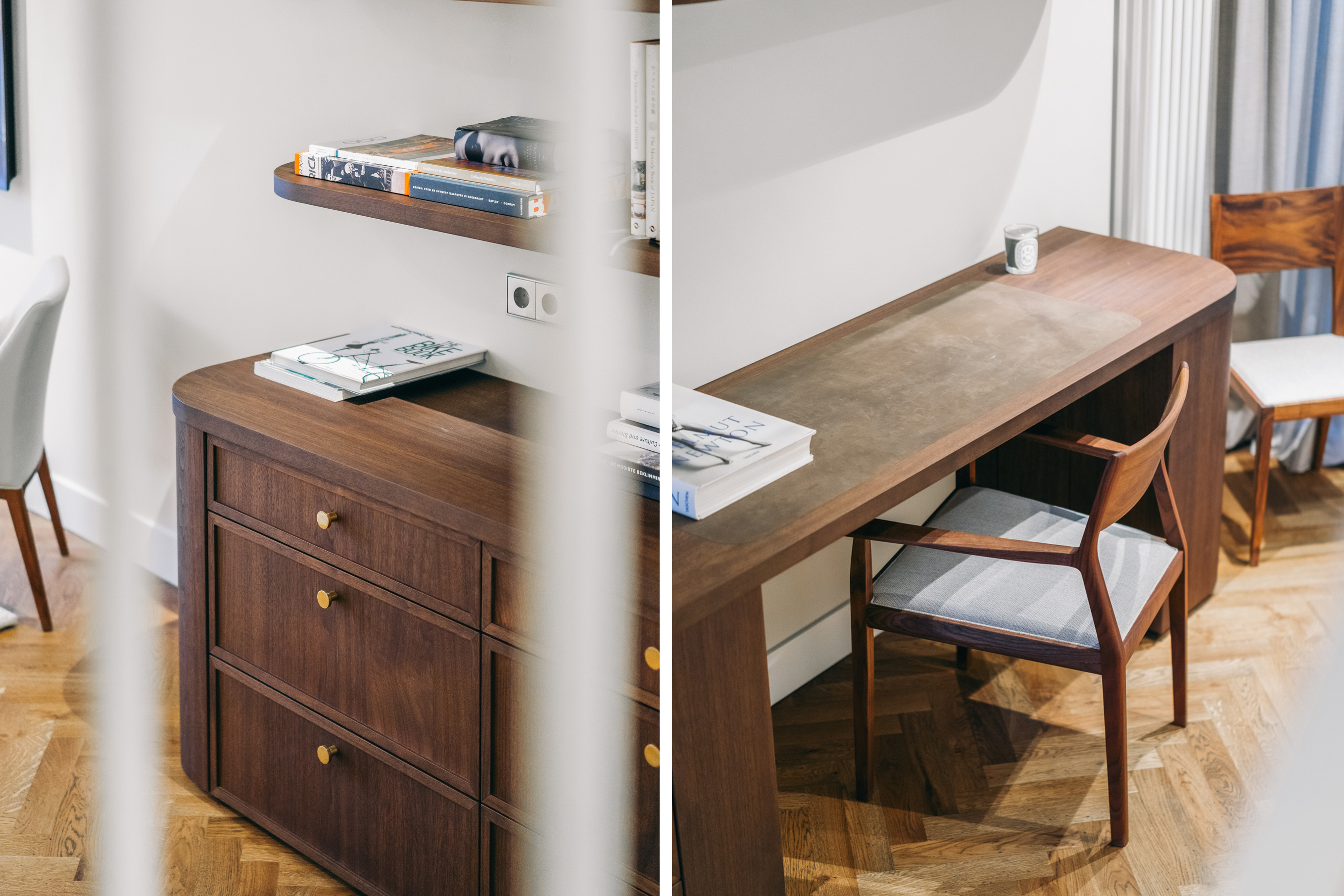 Along the wall, there is a custom-built cabinet with an integrated desk, finished in warm walnut veneer, providing generous storage and an elegant appearance. This bespoke solution makes the space highly suitable as a workspace, reading room, or reception area.