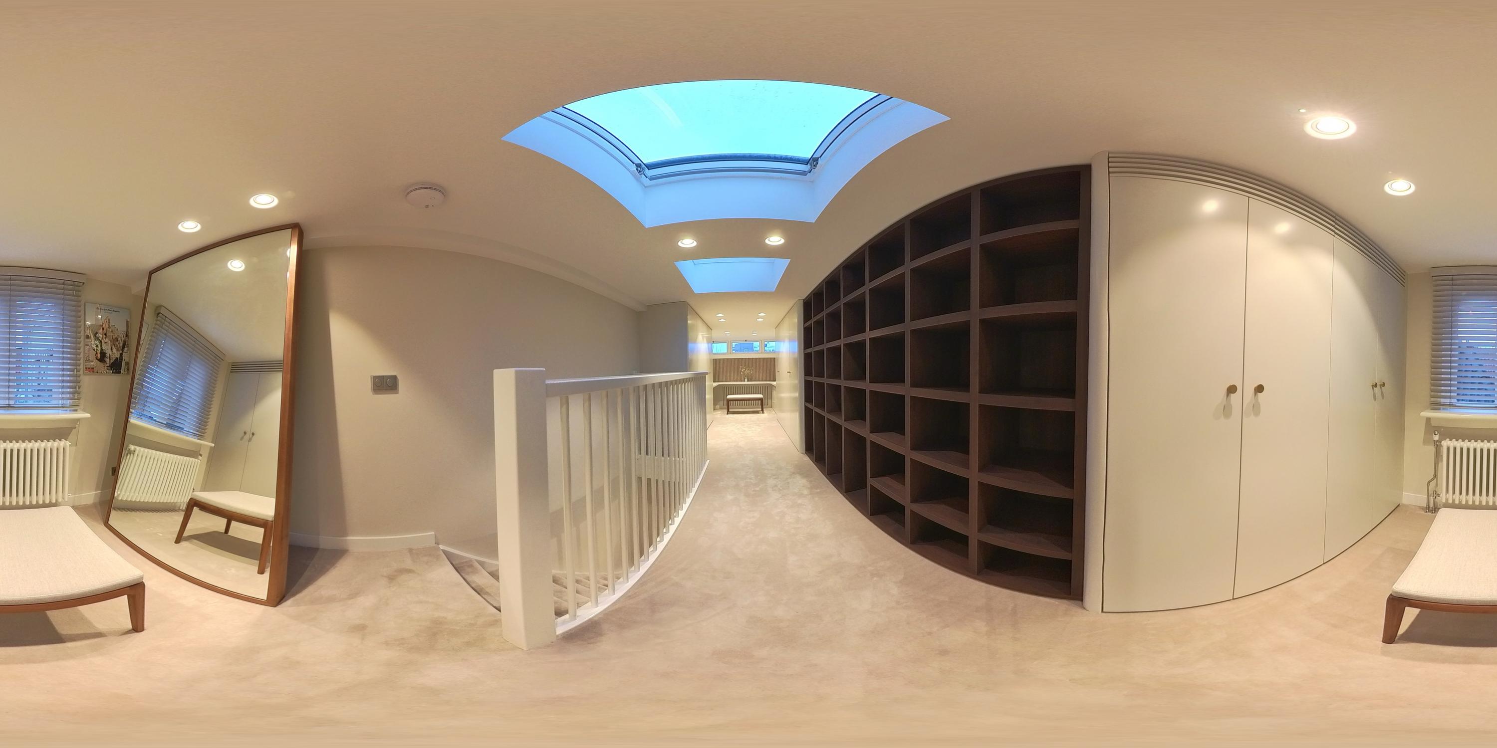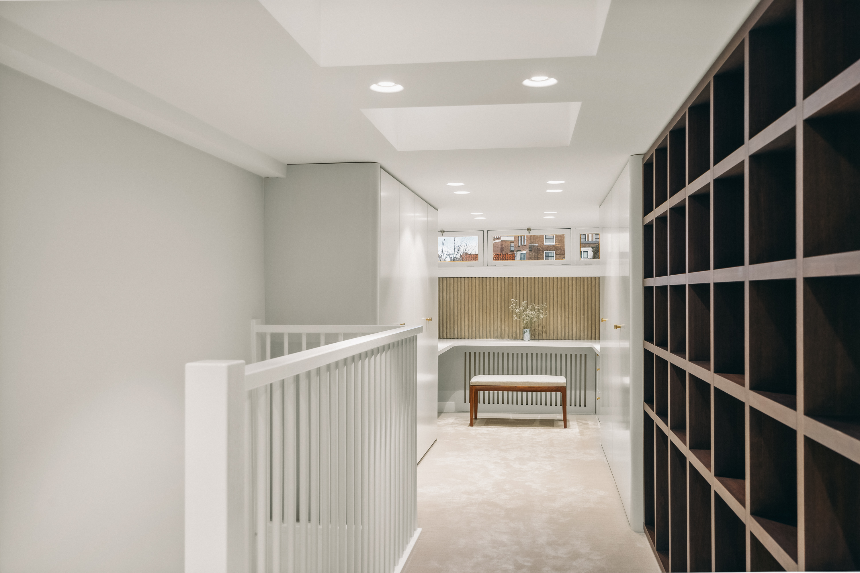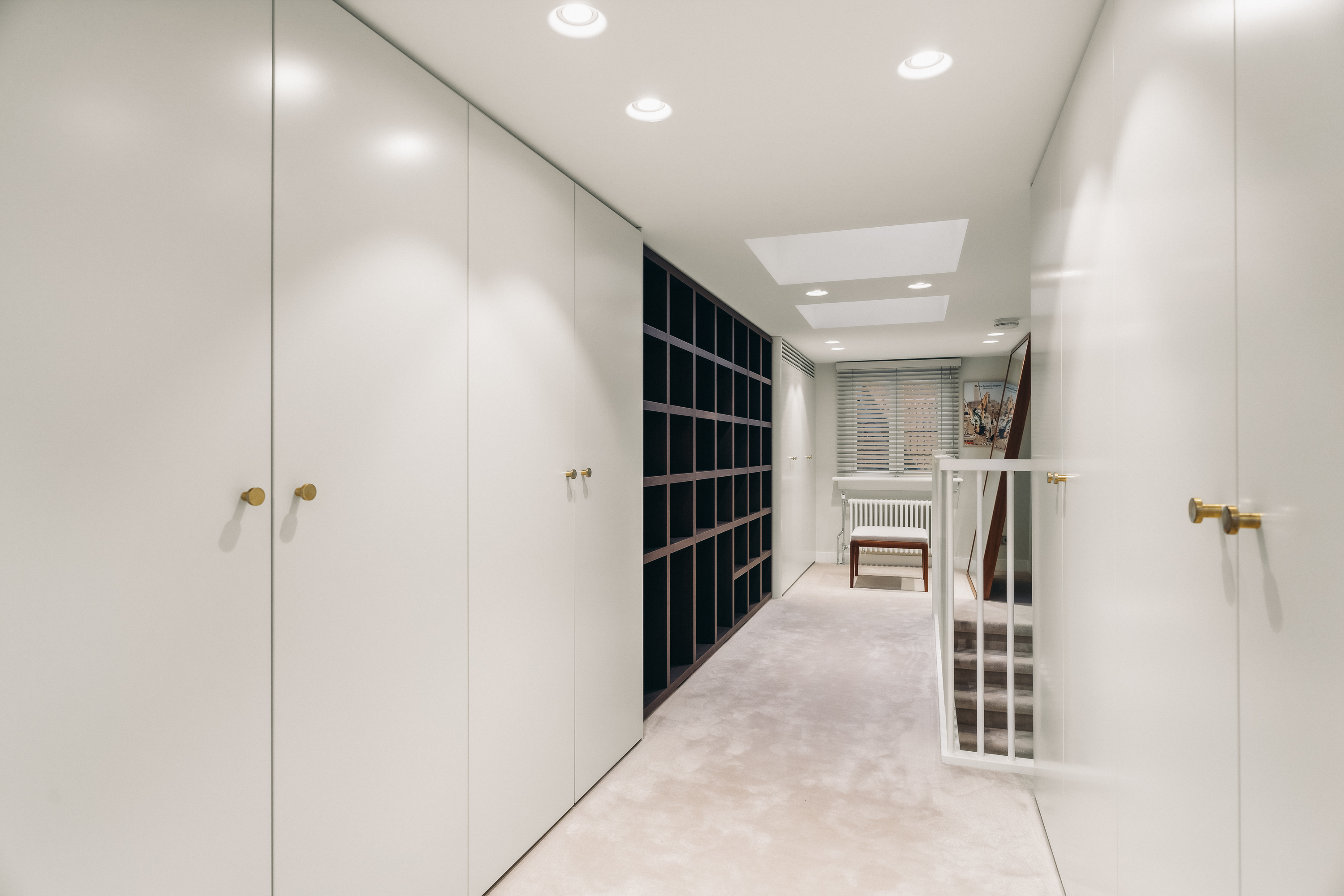 The third floor is arranged as a generous walk-in wardrobe with custom-built closets, a distinctive wall finish, and a skylight providing natural light. The space is also fitted with air conditioning.
