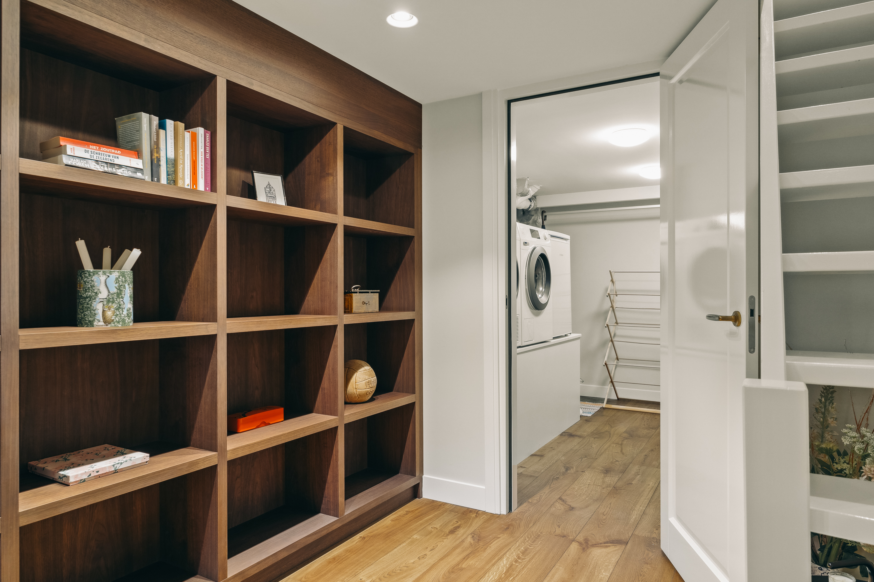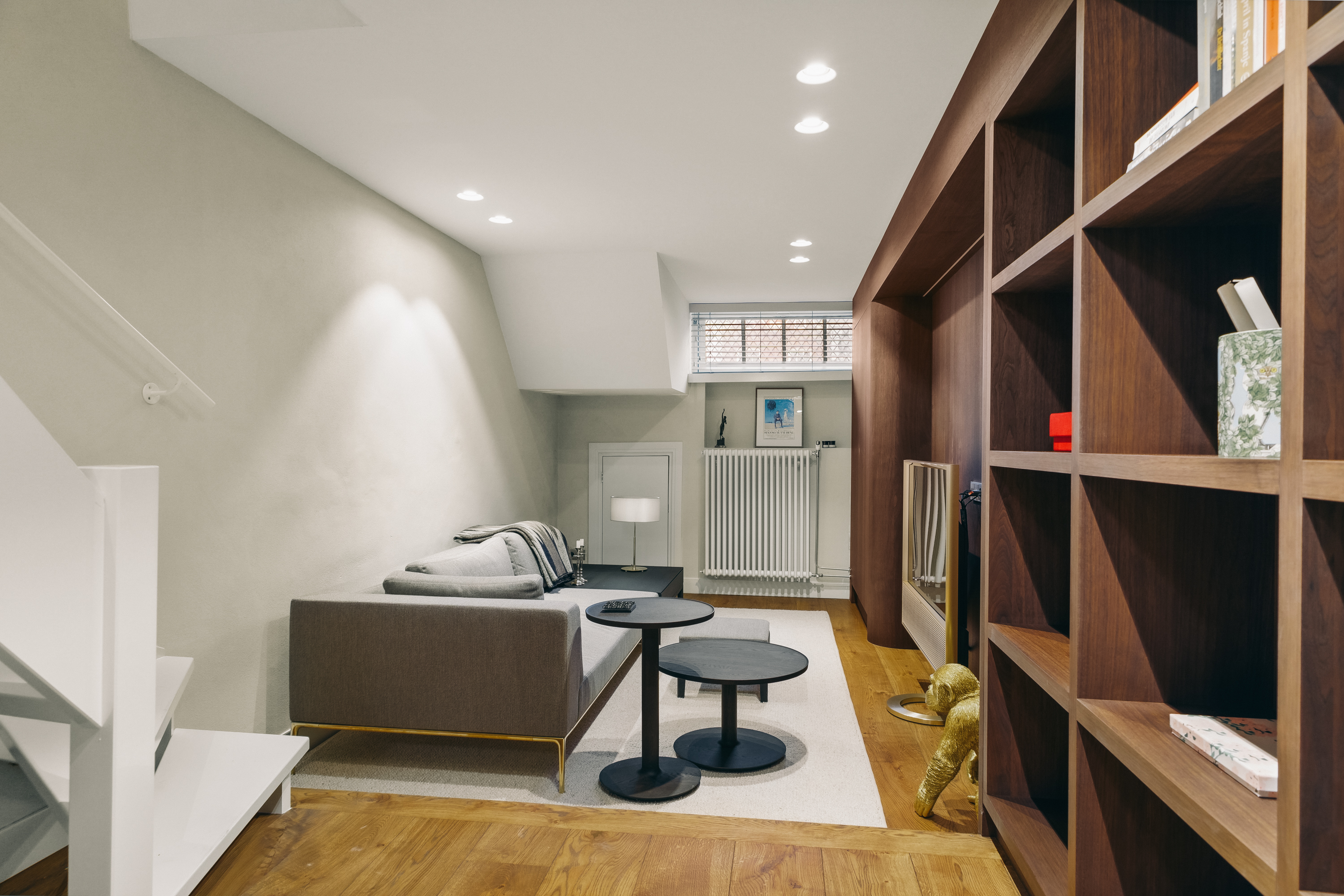 The lower ground floor is arranged as a comfortable and atmospheric living space, ideal as a second lounge. The room features custom-built cabinetry in warm wood tones and offers a calm, sheltered ambiance.