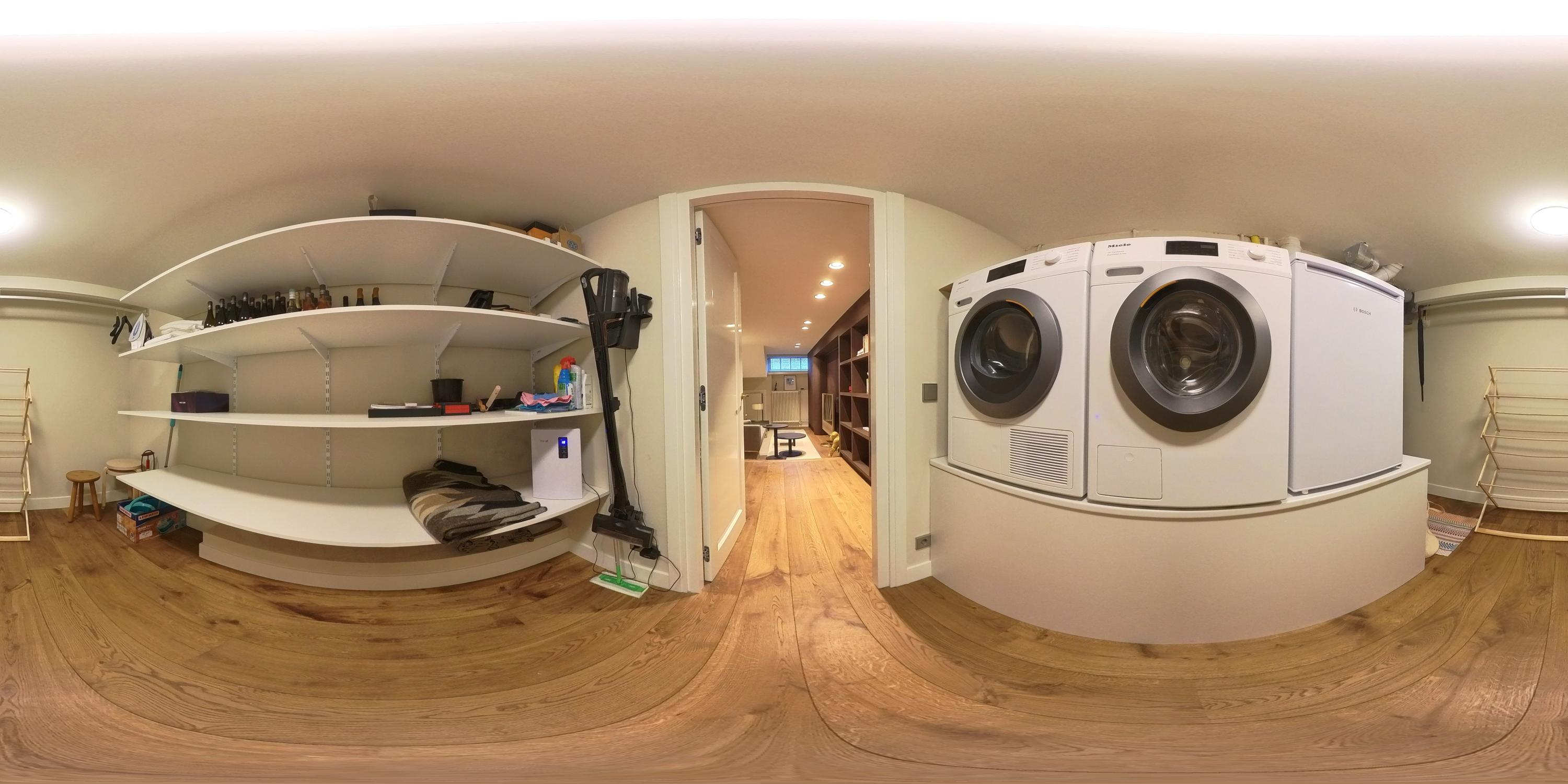 At the rear, there is a spacious storage room equipped with connections for a washing machine and dryer, as well as the technical installations, including a hydrofoor (pressure system) and water softener. This area also provides ample storage space.