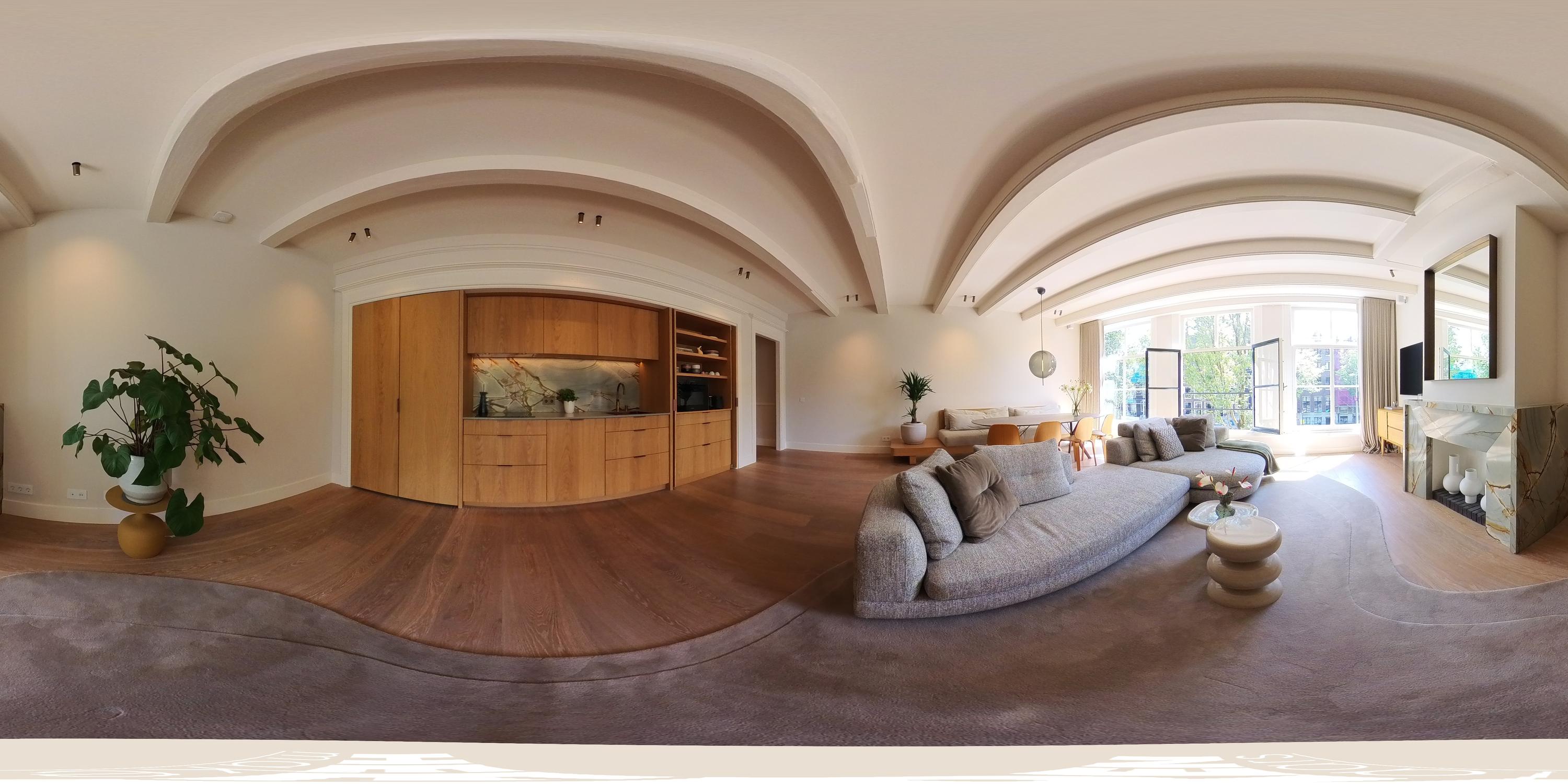 Aan de voorzijde bevindt zich de prachtige en breed opgezette woonkamer met grote raampartijen en fenomenaal uitzicht over de Herengracht. De ruimte wordt gekenmerkt door veel lichtinval en een bijzonder detail: de schouw en de achterwand in de keuken zijn uitgevoerd in hetzelfde kleurrijke marmer, wat zorgt voor een luxe en stijlvolle uitstraling.