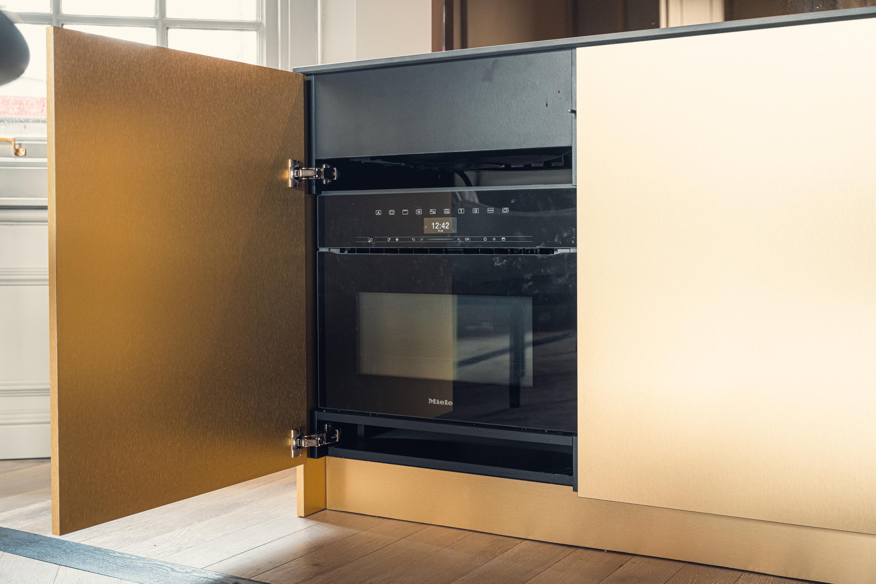 At the rear is the modern kitchen, finished in a gold-toned color that contrasts beautifully with the warm wooden flooring and neutral walls. The kitchen is equipped with high-quality Miele built-in appliances, Quooker, Bora induction cooktop, and offers ample cupboard space. With its open connection to the living room, the space remains light and inviting—perfect for those who enjoy cooking and entertaining.
