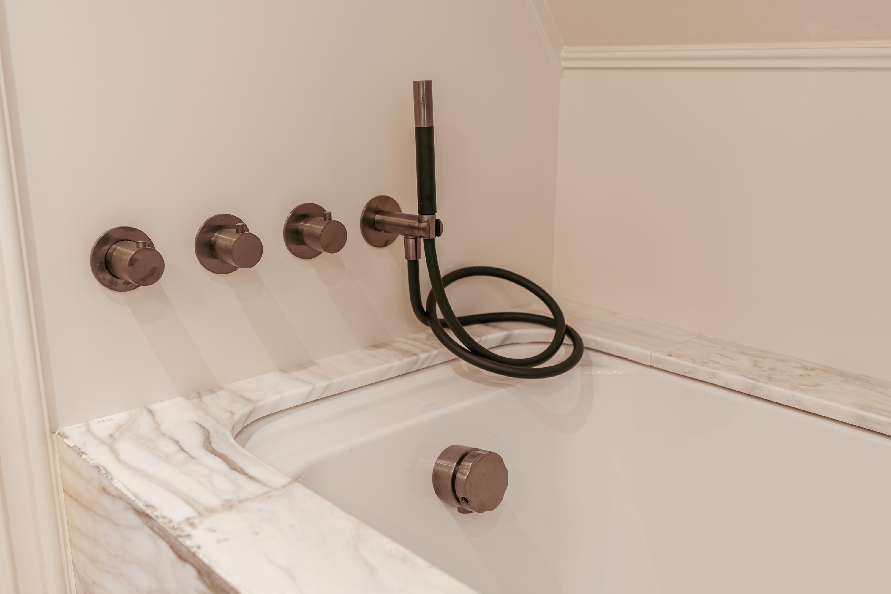 A stylish steel-framed glass door leads to the hallway with separate WC and a practical utility room. Adjacent is a generous bathroom with double vanity, freestanding bath, and walk-in rain shower – all finished in elegant marble.