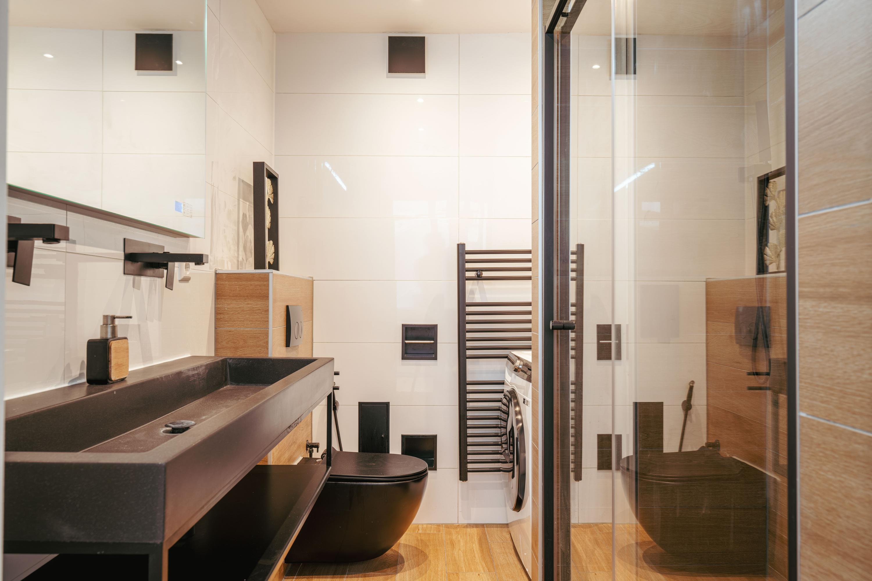 On the top floor are two more generous bedrooms, also divided between the front and rear. The second bathroom is centrally located and equipped with a double washbasin with cabinet, a double rain shower and a toilet - ideal for larger families or guests.