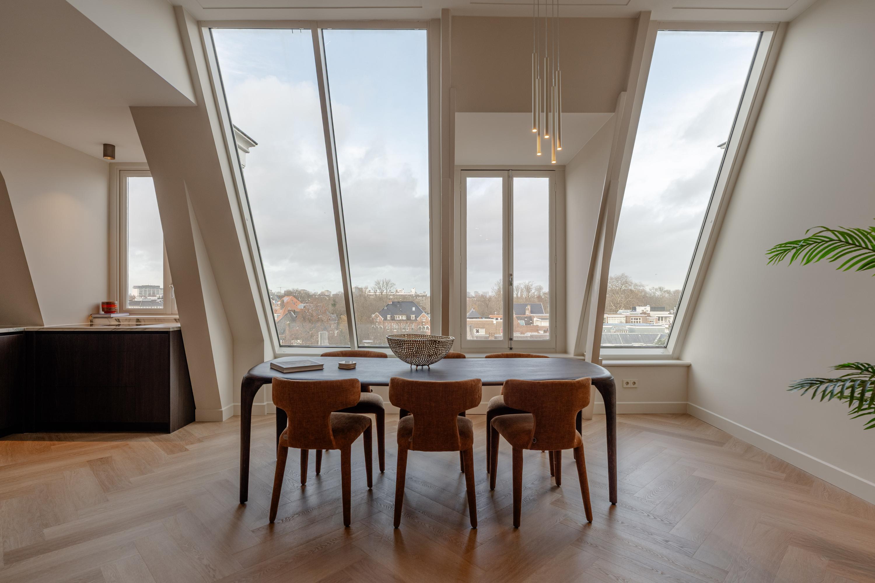 This luxurious apartment is located on the fourth floor and is characterised by a spacious and light-filled design, featuring high ceilings and striking, angled skylights at the rear. These large windows give the apartment a distinctive character and provide exceptional natural light throughout the day, along with open, green views across the city. The living room and kitchen are situated at the rear of the apartment and together form one generous living space. The unique roof structure, combined with the large skylights, creates an open and architecturally interesting atmosphere with abundant daylight and attractive sightlines. There is ample space for both a comfortable seating area and a large dining table. The luxurious kitchen is finished in a sleek and timeless design and integrates seamlessly with the living area. It is equipped with an induction hob, sink with Quooker, combi oven, climate cabinet, dishwasher, separate refrigerator and freezer, and offers generous workspace and storage capacity. At the front of the apartment are two well-proportioned and quietly located bedrooms. The master bedroom features an en-suite bathroom fitted with a walk-in shower and a double washbasin with vanity unit. Centrally located on the landing is the second bathroom, also equipped with a walk-in shower and a washbasin with vanity unit. In addition, there is a separate toilet and practical built-in storage. The roof terrace is accessible via an internal staircase. This spacious terrace offers a high level of privacy and has been structurally prepared for the installation of a jacuzzi, including a double electrical group. Provisions have also been made for an outdoor shower (water connection) and for the installation of an outdoor kitchen (water and electricity connections), making this outdoor space a valuable extension of the living comfort.