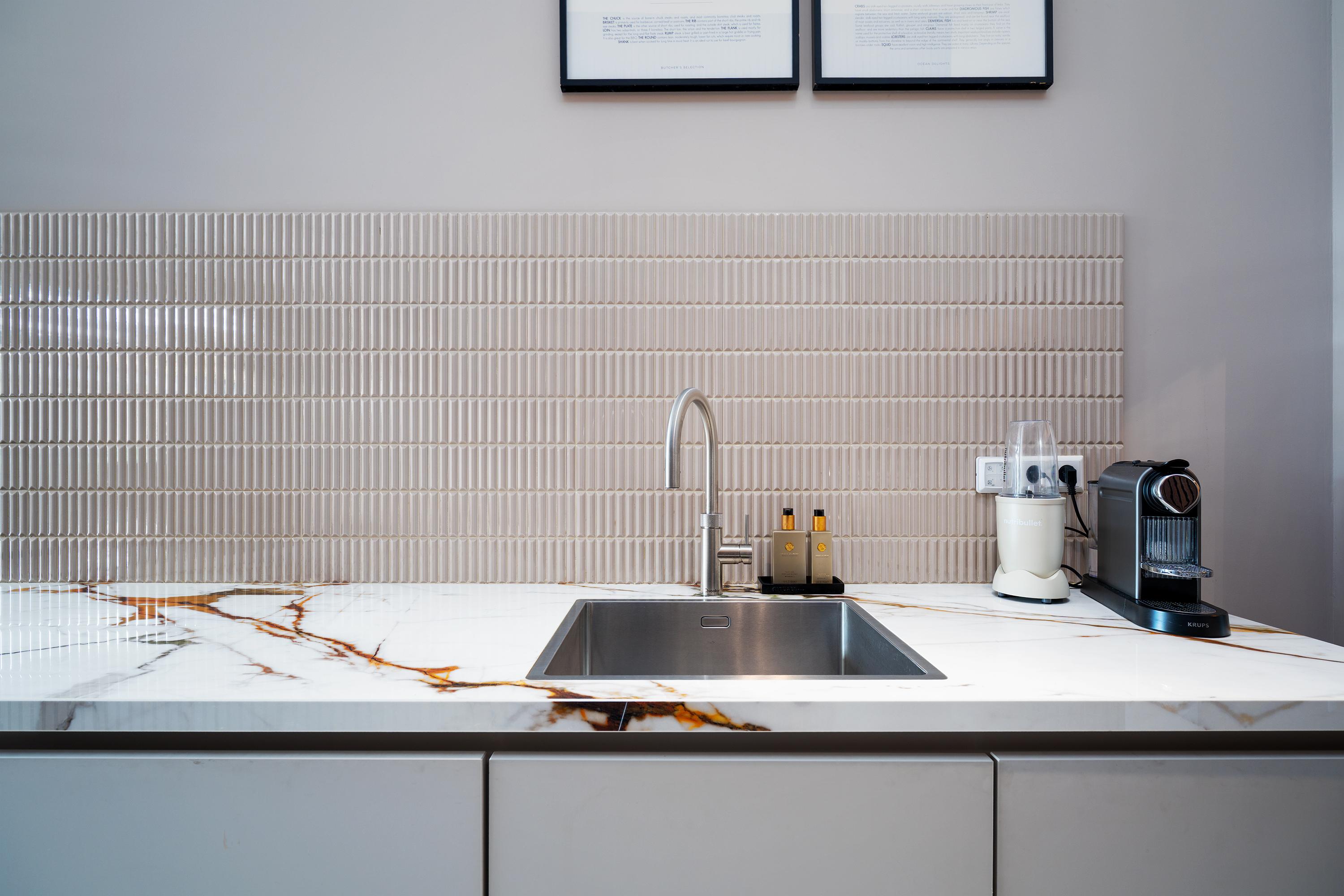 The kitchen offers far more than just a wine cooler. Custom-built wooden cabinetry frames the sleek kitchen equipped with a Quooker tap, BORA induction cooktop, and premium AEG appliances including a combination steam oven, fridge-freezer, and dishwasher. The timeless marble countertop adds a touch of elegance. The kitchen flows seamlessly into the living area, with the poured concrete floor — complete with underfloor heating and cooling — continuing throughout. The custom staircase, featuring a cinewall and electric fireplace, acts as a central design feature.