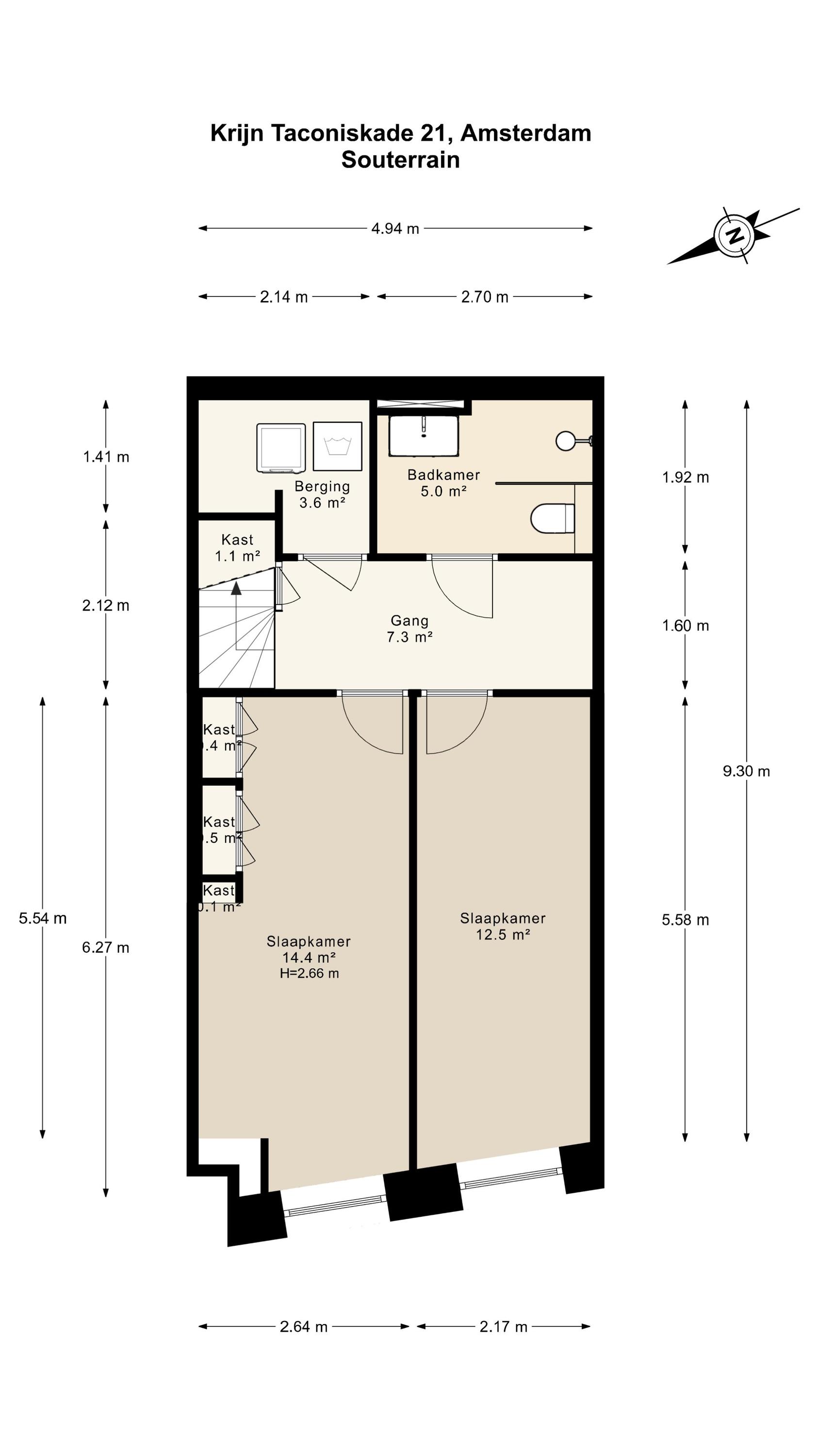 Spacious central hallway, utility room with washer/dryer setup in custom-built cabinetry (both AEG machines available for takeover), master bedroom with a high-end custom wardrobe by De Maatfabriek, second bedroom/guest room, modern bathroom with walk-in shower, second toilet, and washbasin. This level is ideal for sleeping or working, with ample natural light and windows that open in both bedrooms.
