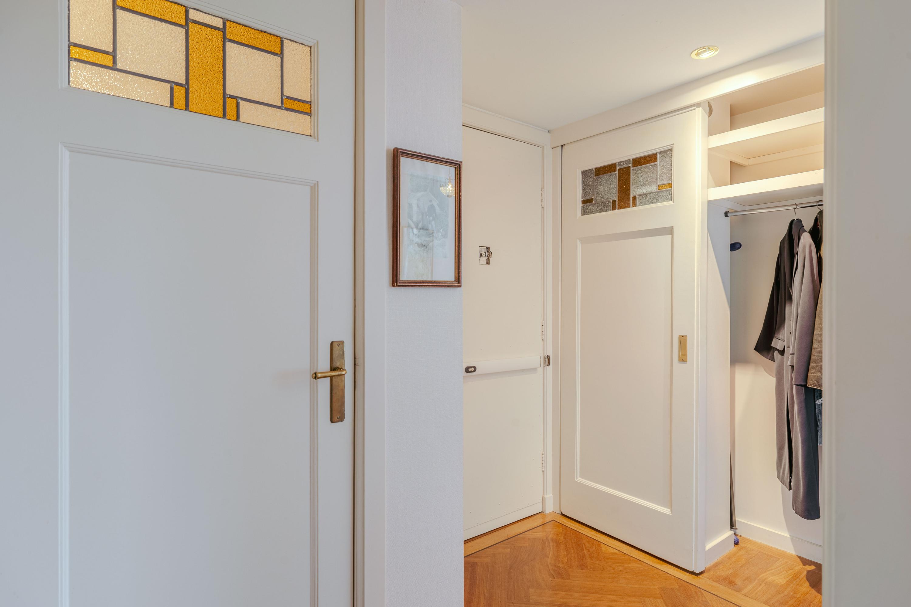Spacious entrance hall providing access to all rooms. There is a coat closet in the hall, along with the meter cupboard and a separate toilet with a small sink. At the front, a generously sized bedroom features a walk-in closet and several built-in wardrobes. At the rear, the large main bedroom opens through French doors onto the west-facing balcony, offering views of the beautifully landscaped and well-maintained inner gardens of Minervalaan and Michelangelostraat.
