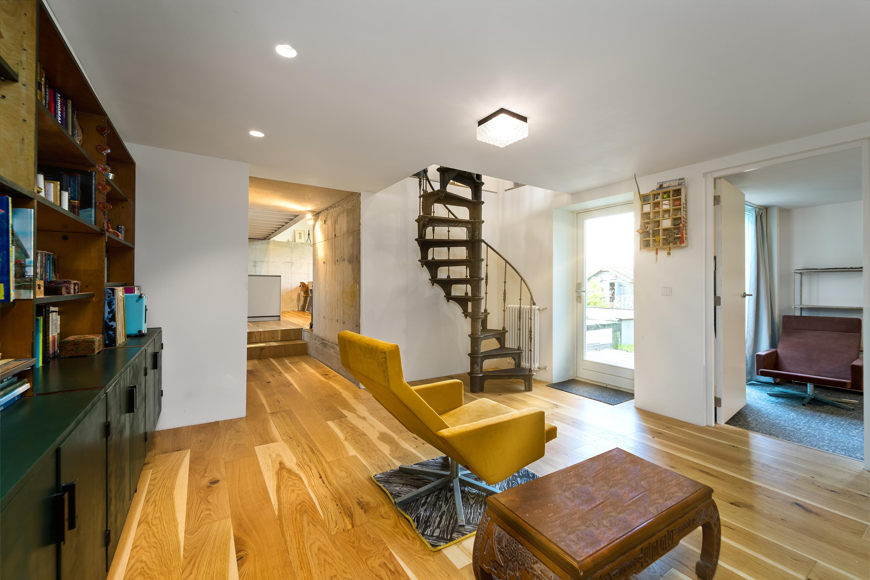 Inside, the home is just as cool. Old and modern materials were used in the new construction/renovation. Tough wooden construction beams, raw concrete, oak floorboards, classic member radiators and the steel spiral staircase are some examples.