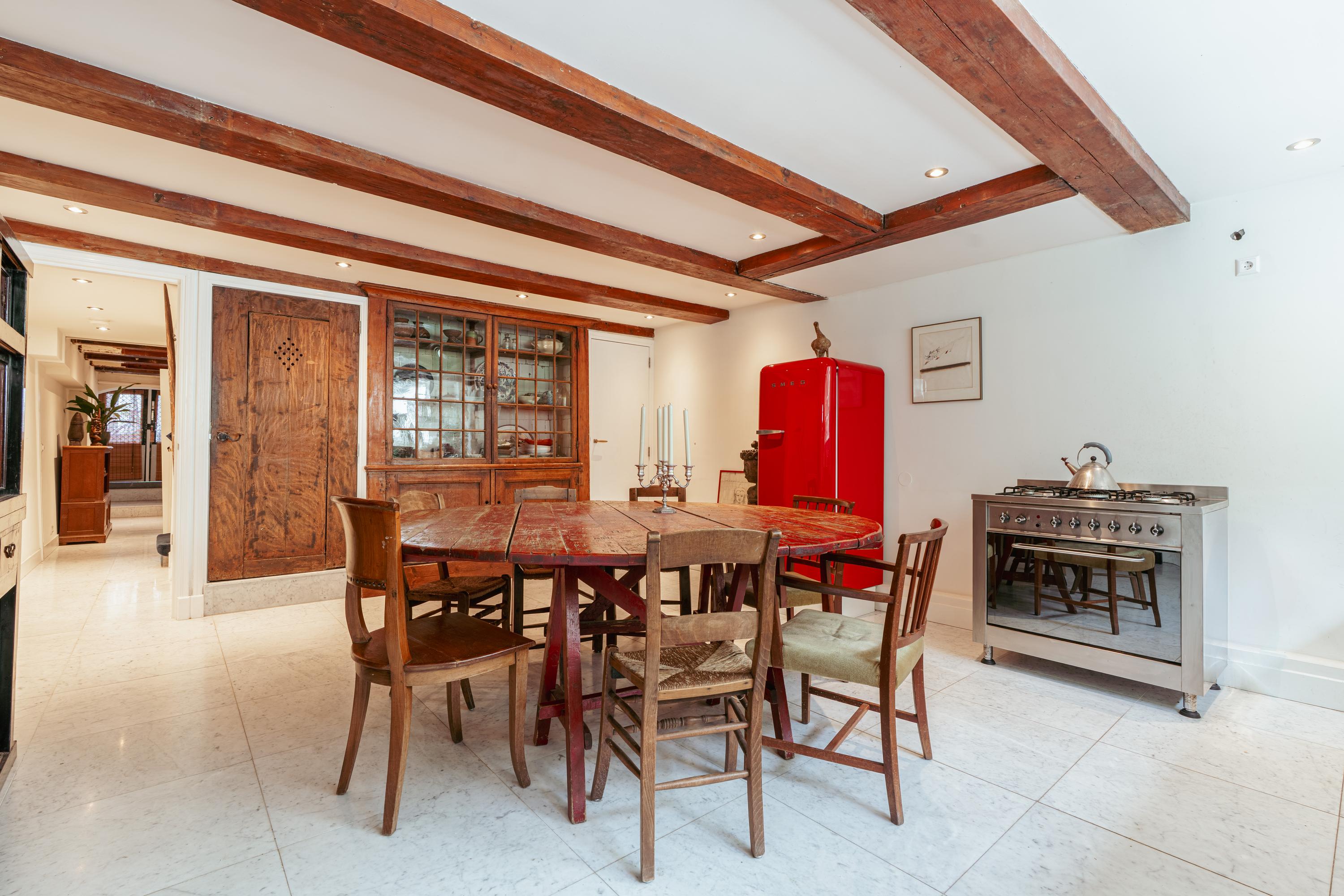 The basement is reached via the internal staircase and is spacious and functionally laid out. At the rear is the dining room with adjoining kitchen. The kitchen is located on the garden side and offers direct access to the deep rear garden, creating a pleasant connection between indoor and outdoor living. The kitchen is equipped with a Quooker, dishwasher, a freestanding gas stove with oven and a fridge-freezer combination. In addition, the kitchen features beautiful built-in wooden cabinets, ideal for extra storage space. From the kitchen there is access to a separate room with connections for a washing machine and dryer.