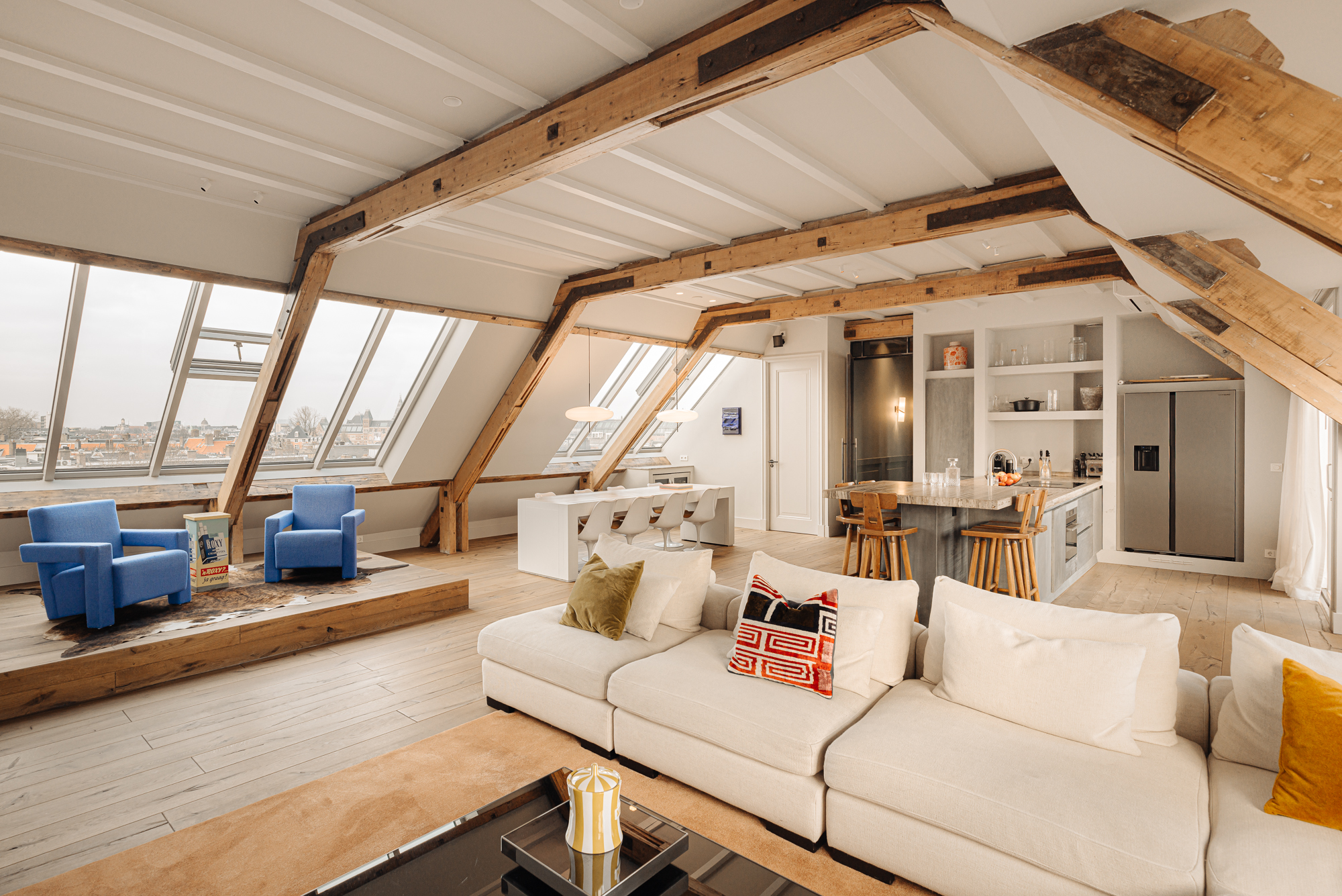 Upon entering, you immediately notice the spacious and light-filled design of the apartment. The living room features a charming south-facing balcony and large windows on both sides, allowing plenty of natural light and offering a panoramic view of the city. The visible wooden beams add character, while the elevated seating area creates a cosy space to relax. An air conditioning unit is installed above the kitchen, which boasts a large cooking island with a natural stone worktop and high-end built-in appliances, including a four-burner induction hob with extractor, a dishwasher, a fridge-freezer combination, a Quooker, and a built-in wine climate cabinet. A stylish raised bar area is integrated into the kitchen island. The dining area comfortably accommodates a large table, benefiting from ample natural daylight through the expansive windows.