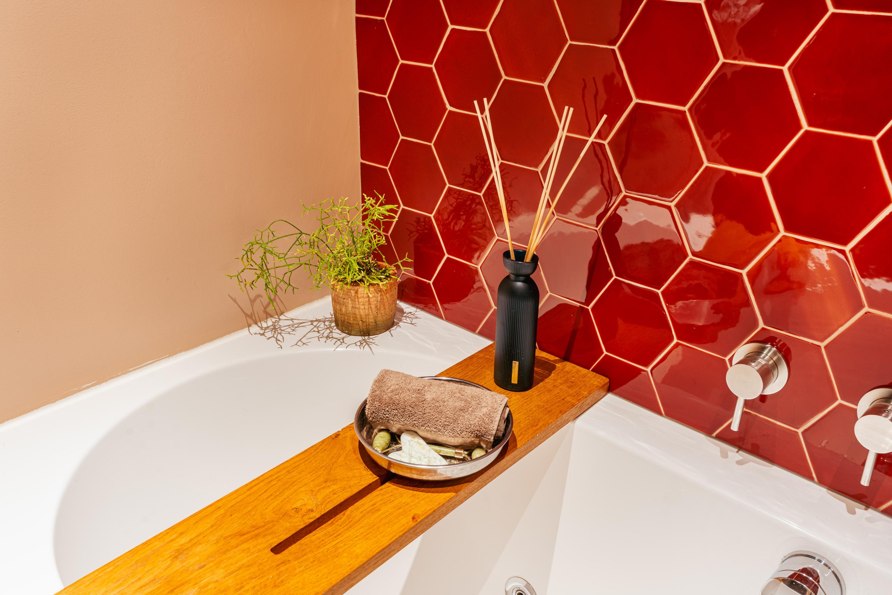 The bathroom is stylishly designed in warm brown shades with a striking red hexagon tile accent. It features a whirlpool bathtub, a separate walk-in rain shower, a vanity unit with ample storage drawers, a wall cabinet, a designer radiator, and underfloor heating. A wonderful place to unwind.