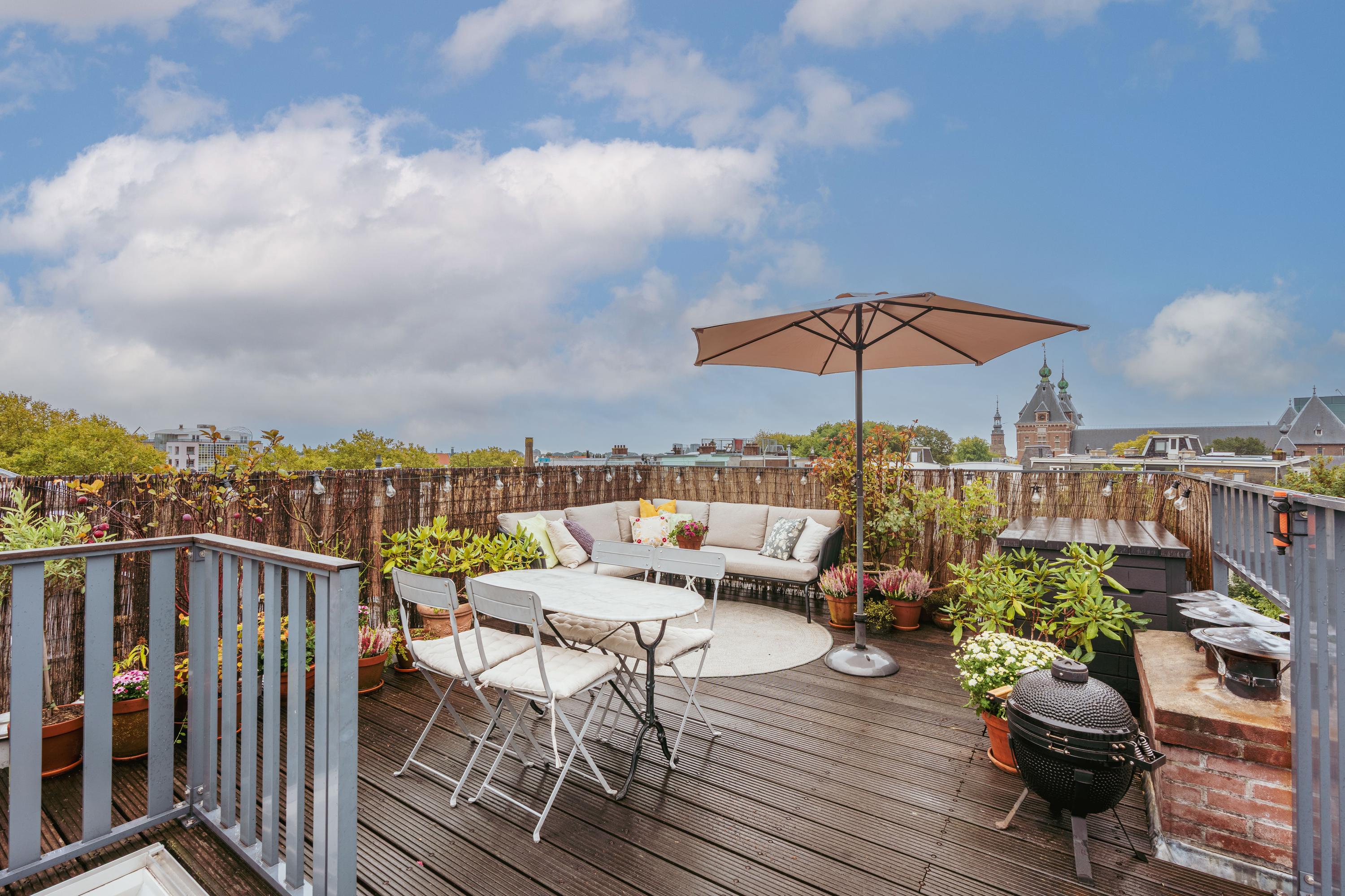 A fixed staircase leads to the unique roof terrace of approx. 26 m² – a true oasis in the city. Spacious enough for both a dining table and lounge area, and surrounded by greenery, it offers privacy, peace, and sweeping views over Amsterdam.
