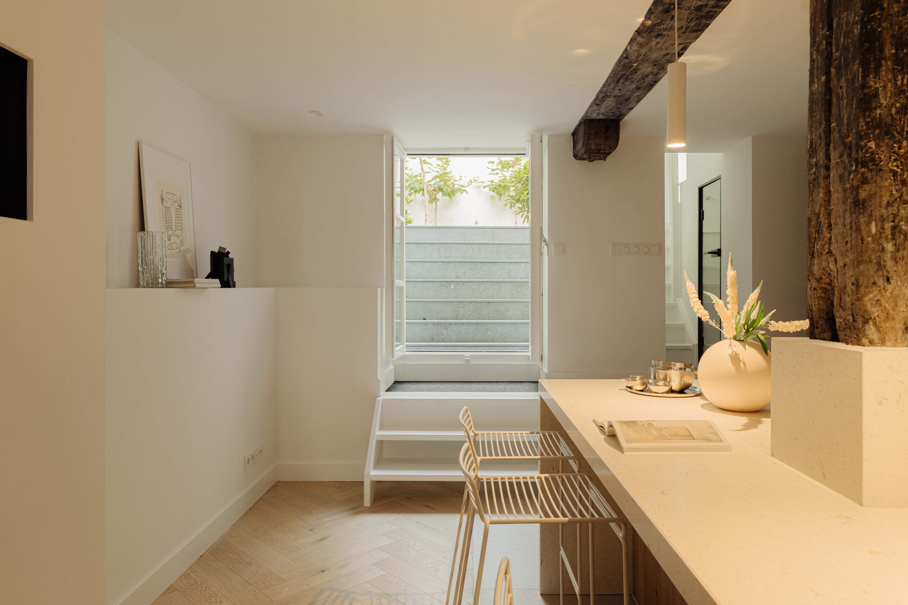 The first and second floors host a series of bedrooms, each finished with serene materials and custom wardrobes. The principal suite faces the canal with a French balcony, a freestanding bathtub, and an ensuite crafted in natural stone and wood. Additional bedrooms look onto inner gardens, suited for guests or flexible living. The third floor includes two further rooms; the rear space accesses the rooftop terrace overlooking the city’s historic skyline.
