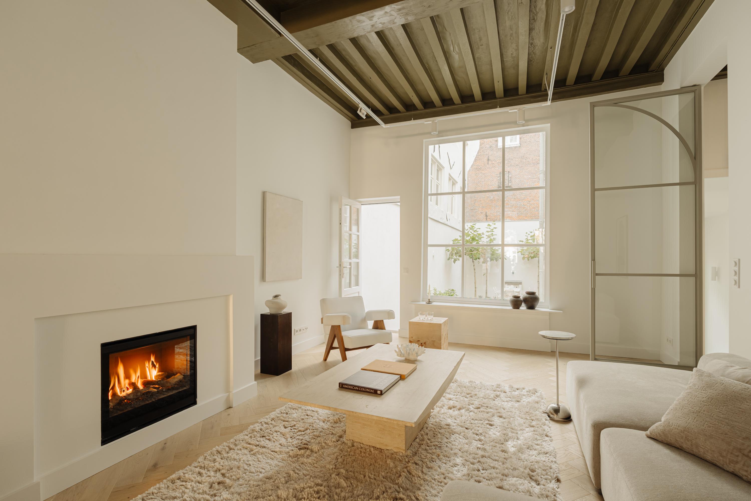 From the hall, you enter the living area. With a ceiling height of over 3.4 metres, original exposed beams, large windows and a beautiful view over the Singel, this is an impressive space where warmth and grandeur meet naturally. Two fireplaces on this floor add an extra sense of homeliness and refinement.