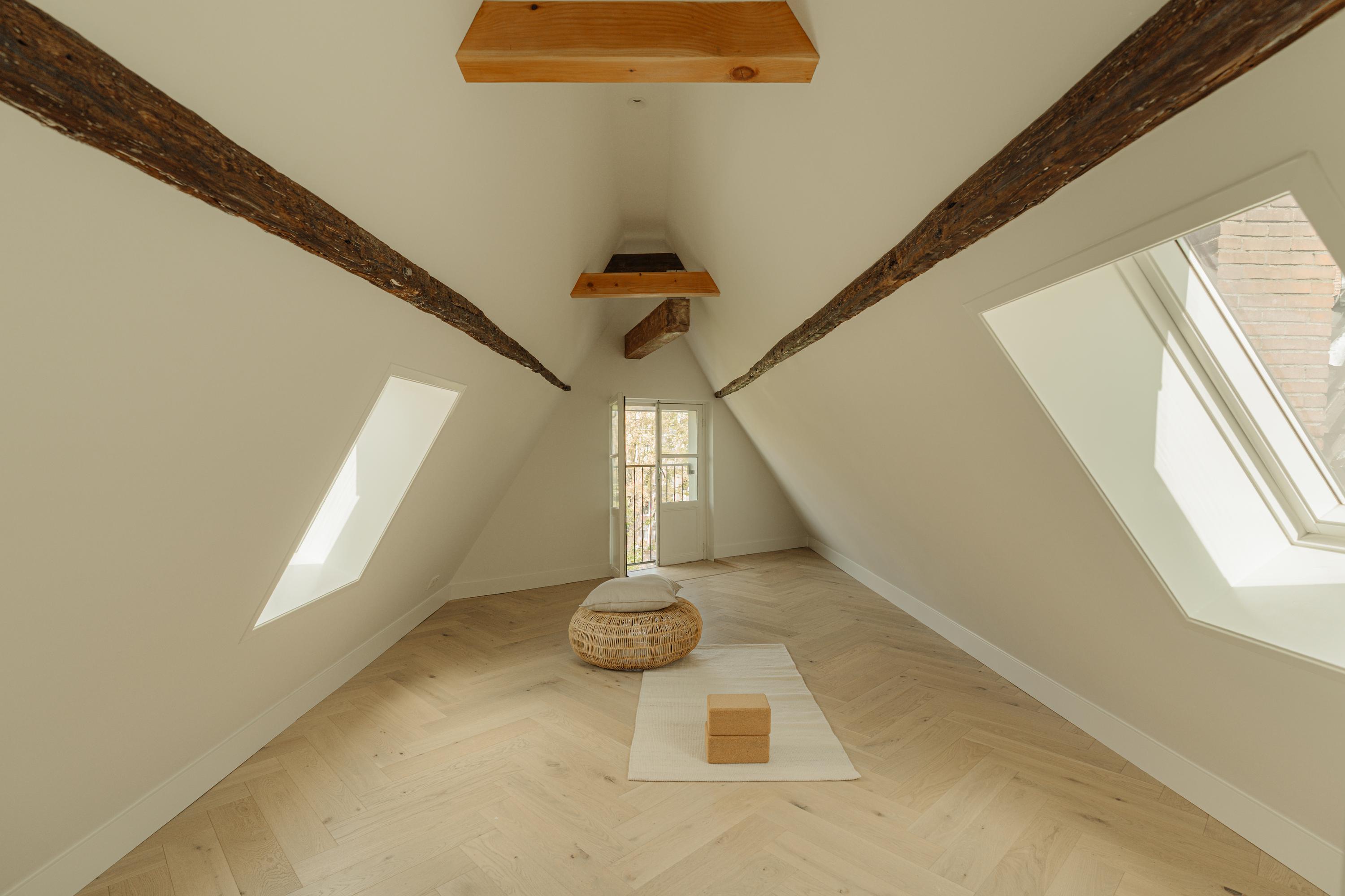 The top floor is divided into two separate rooms. The room at the front is ideal as an additional bedroom or study. The rear room features a pantry with wine cooler and access to the rooftop terrace, where you can enjoy the sun and views over Amsterdam’s historic rooftops and the Dominicus Church — a perfect spot to unwind with a drink.