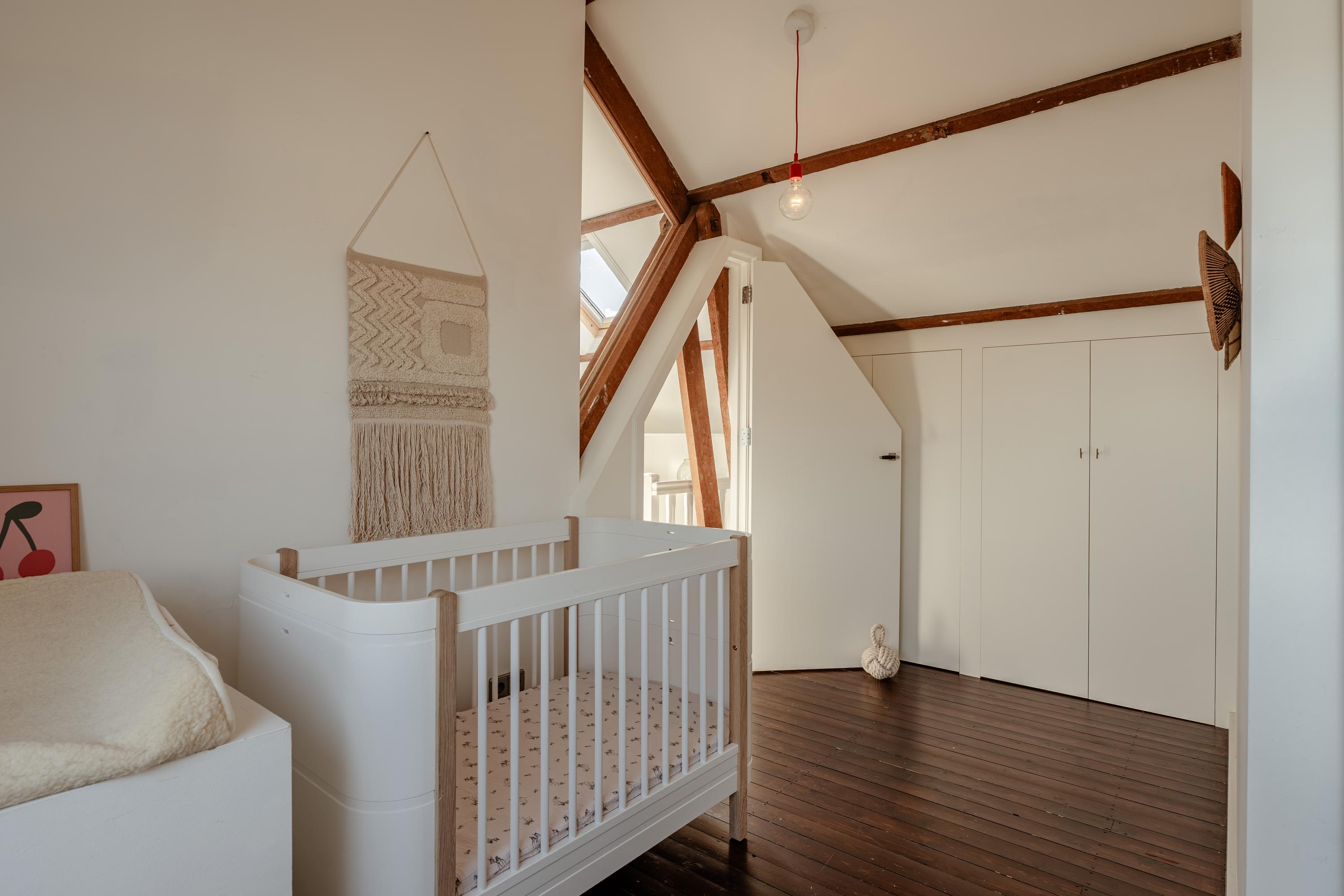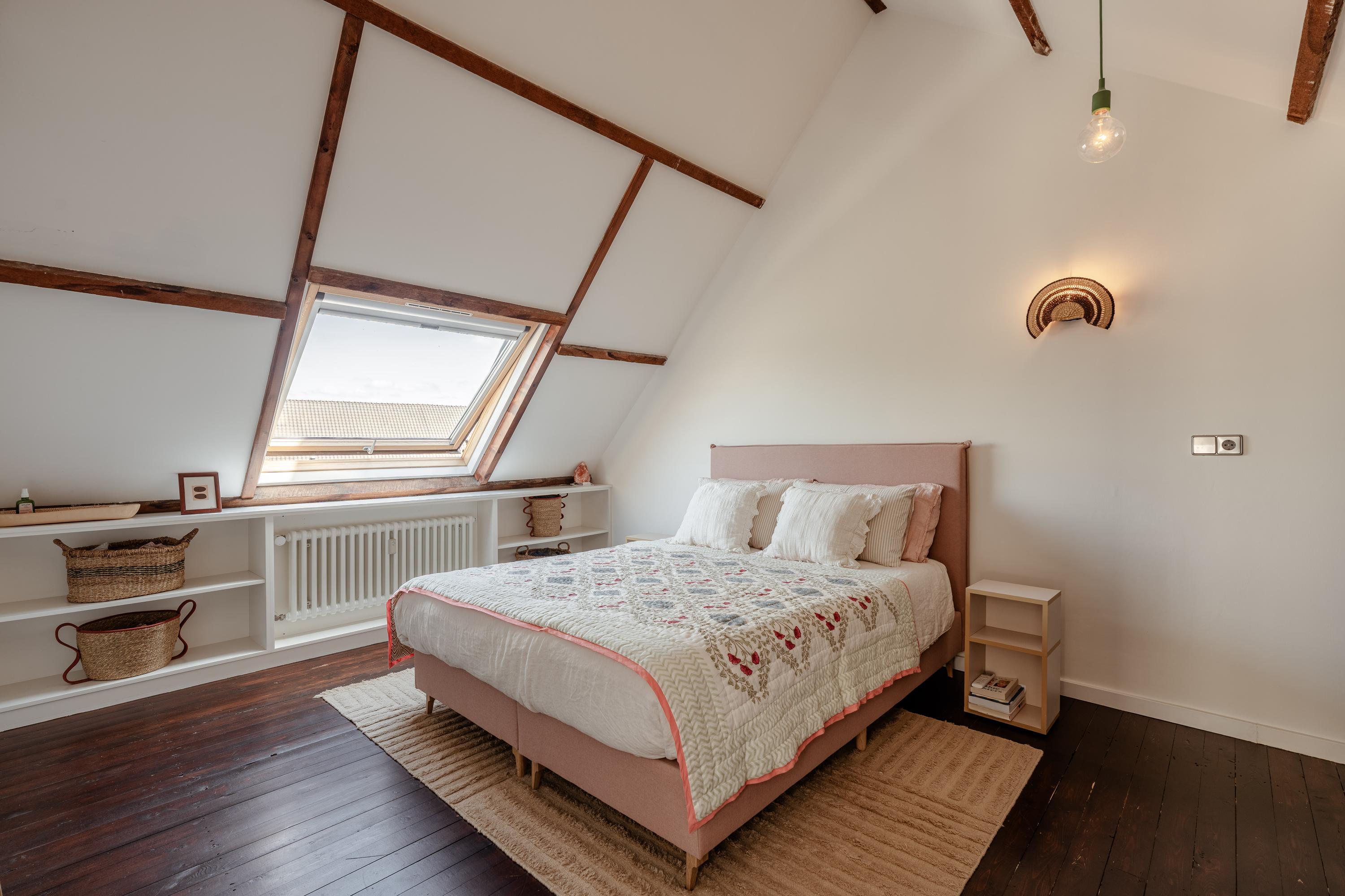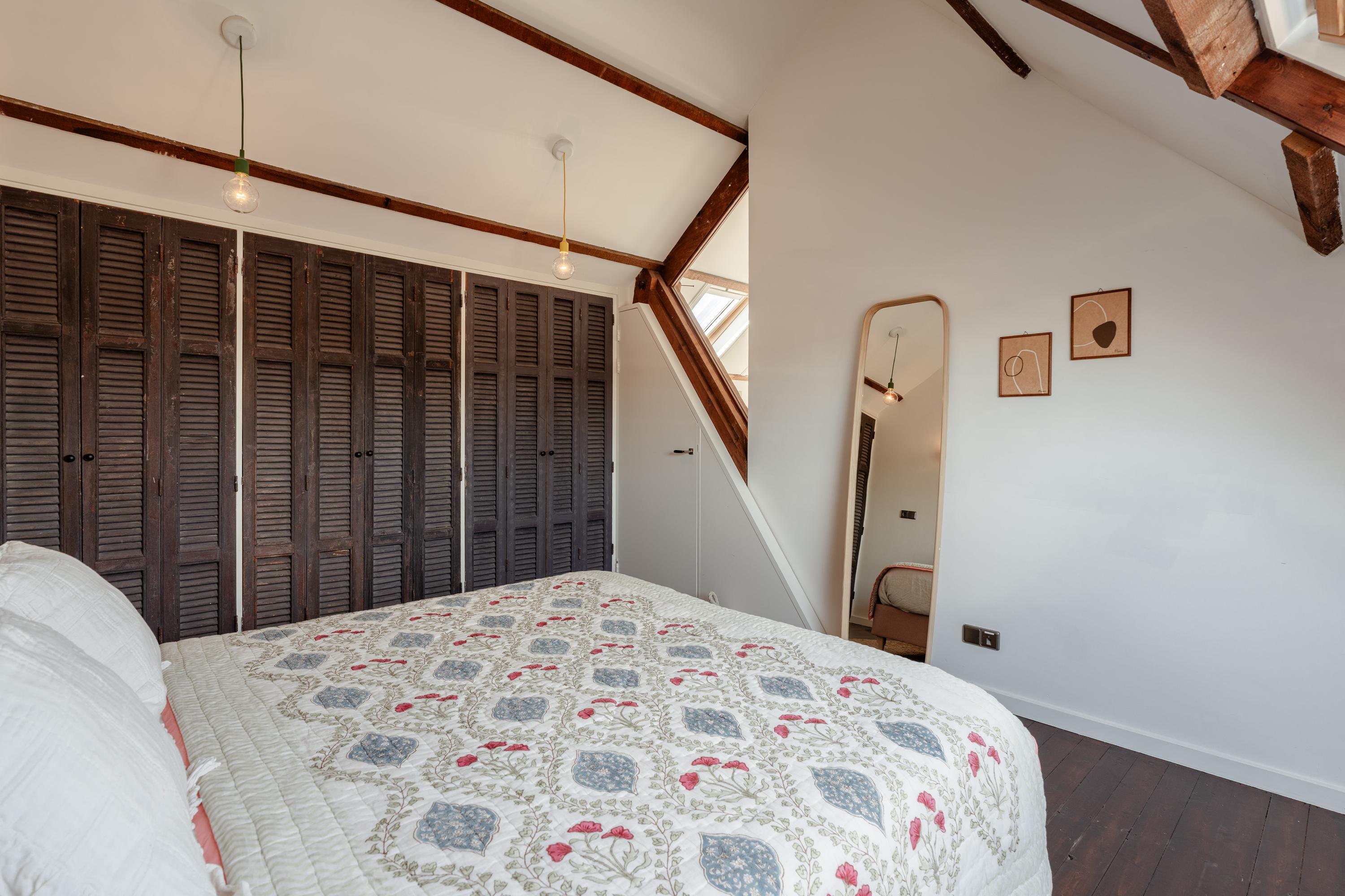 The fourth floor reveals a tranquil terrace of approximately 32 m², a rare expanse in the city, adjoining a private bedroom suite with its own bathroom. A spacious laundry, two further bedrooms—one with built-in storage—enhance flexibility and privacy. The attic, accented by exposed beams and multiple skylights, provides two additional rooms, bespoke storage solutions, and an inviting sense of retreat.