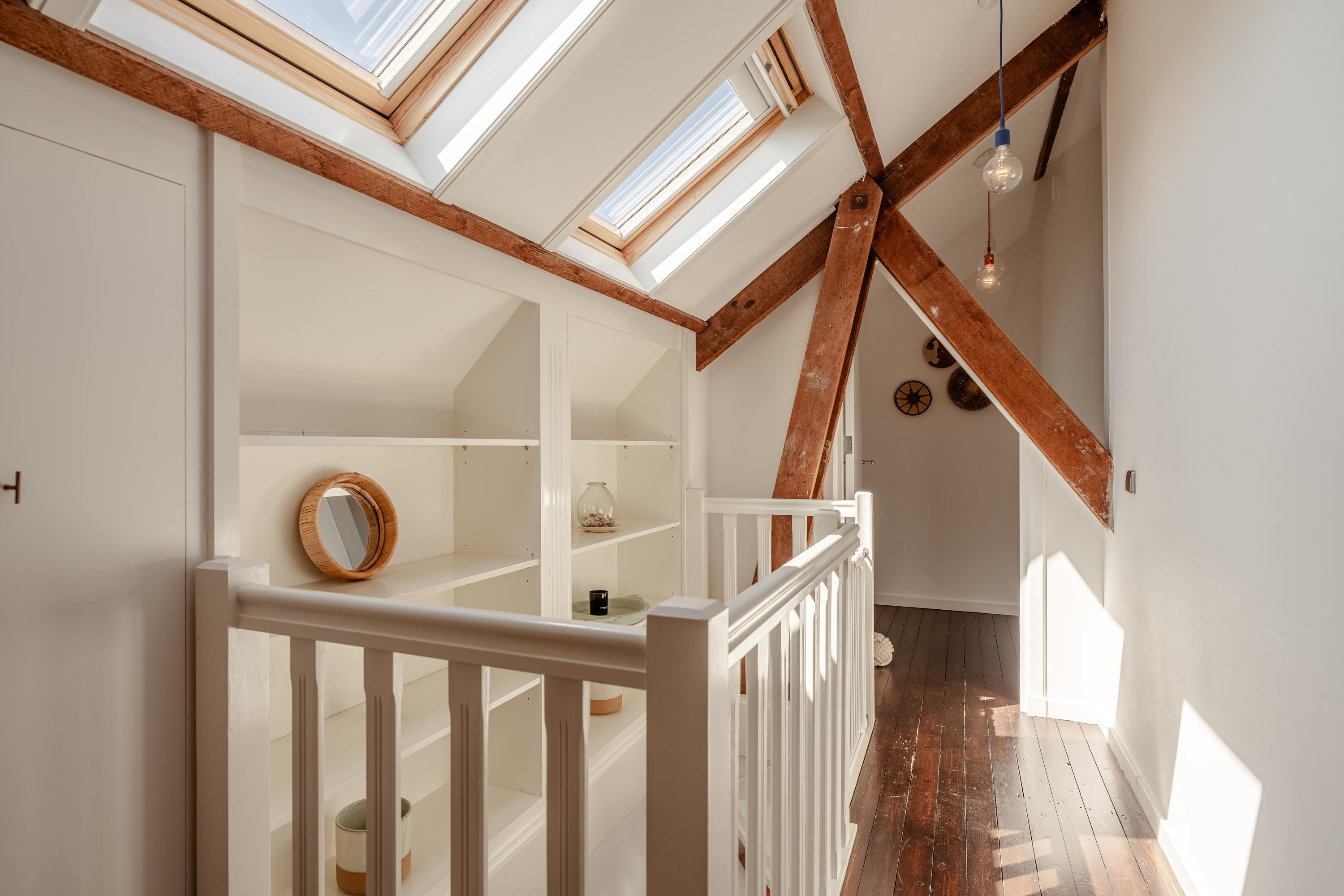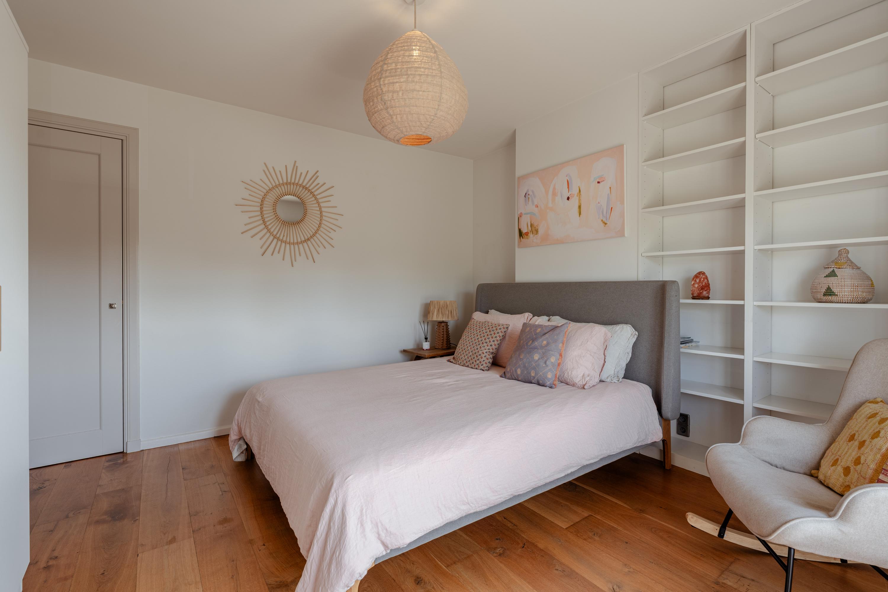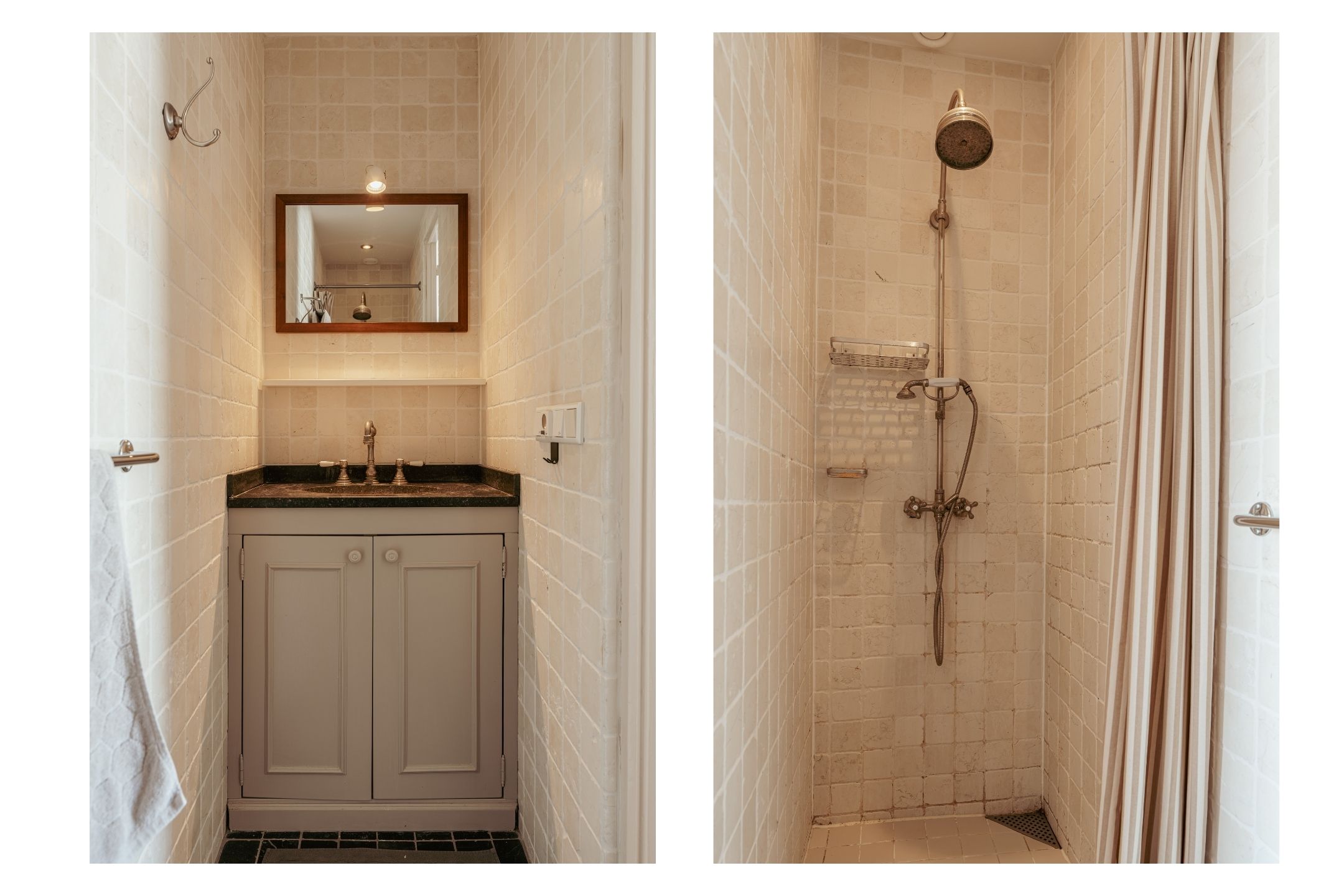 The fourth floor reveals a tranquil terrace of approximately 32 m², a rare expanse in the city, adjoining a private bedroom suite with its own bathroom. A spacious laundry, two further bedrooms—one with built-in storage—enhance flexibility and privacy. The attic, accented by exposed beams and multiple skylights, provides two additional rooms, bespoke storage solutions, and an inviting sense of retreat.