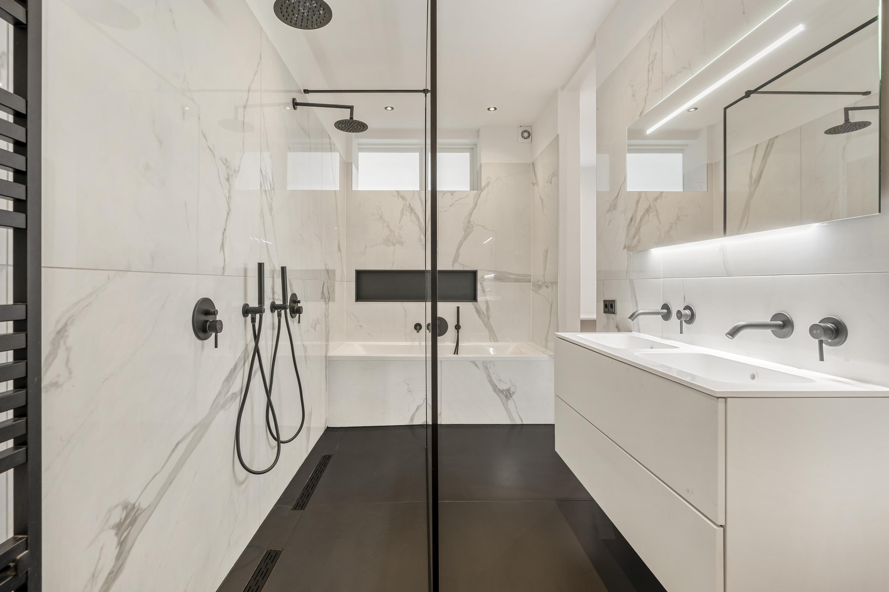 Private front door, with a draft porch leading to the spacious central hall. Exceptionally bright living room with a playful bay window at the front. At the rear is the open kitchen, equipped with all modern conveniences (fridge, freezer, dishwasher, oven, microwave), and access to the terrace, which borders a beautifully maintained communal garden. Both generously sized bedrooms are accessible from the hall. The master bedroom is located at the rear, includes access to a walk-in closet and a large bathroom (also accessible from the hall) with double rain shower, bathtub, double washbasin, and toilet. The guest toilet is separately accessible from the hall. From the hall, there is also access to the laundry closet and adjacent storage cupboard. In the basement of the building, the apartment comes with a spacious storage room.