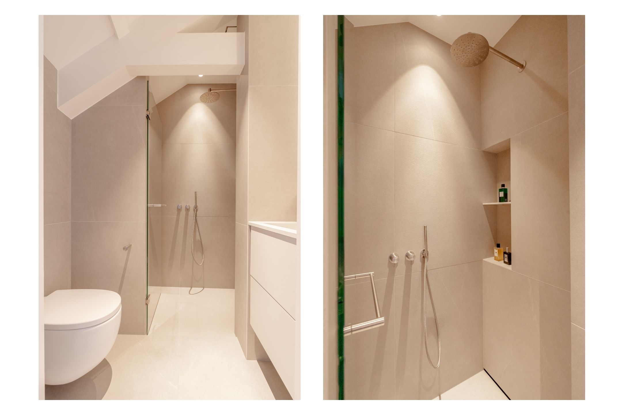 The spacious master bedroom, accessible from the living room, exudes calm and luxury. Exposed beams add character, while smart built-in storage solutions under the sloped ceilings ensure optimal use of space. Air conditioning is also installed here for maximum comfort. The adjoining en-suite bathroom is generously sized and finished to a high standard, featuring a double vanity, freestanding bathtub, walk-in rain shower, and toilet.