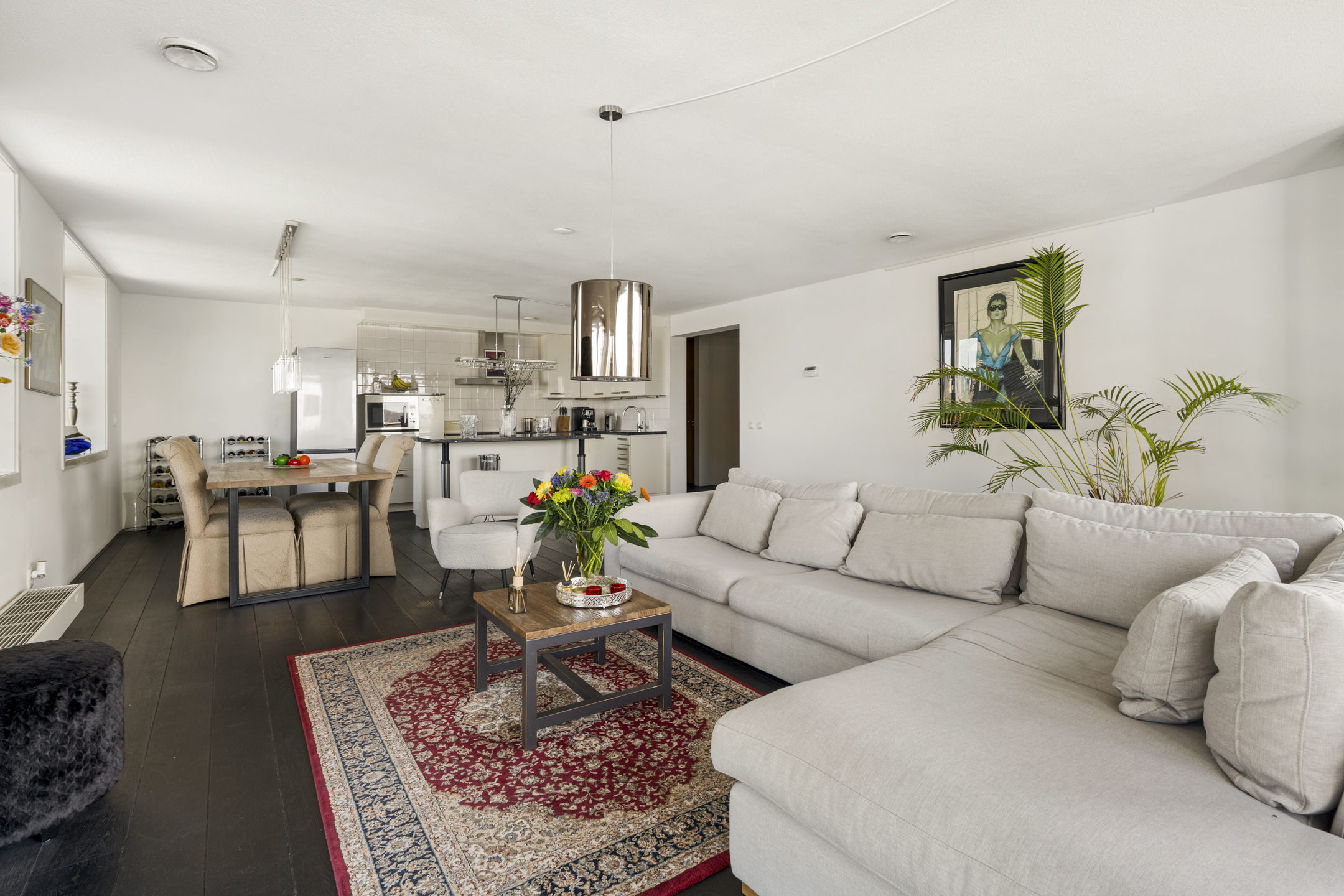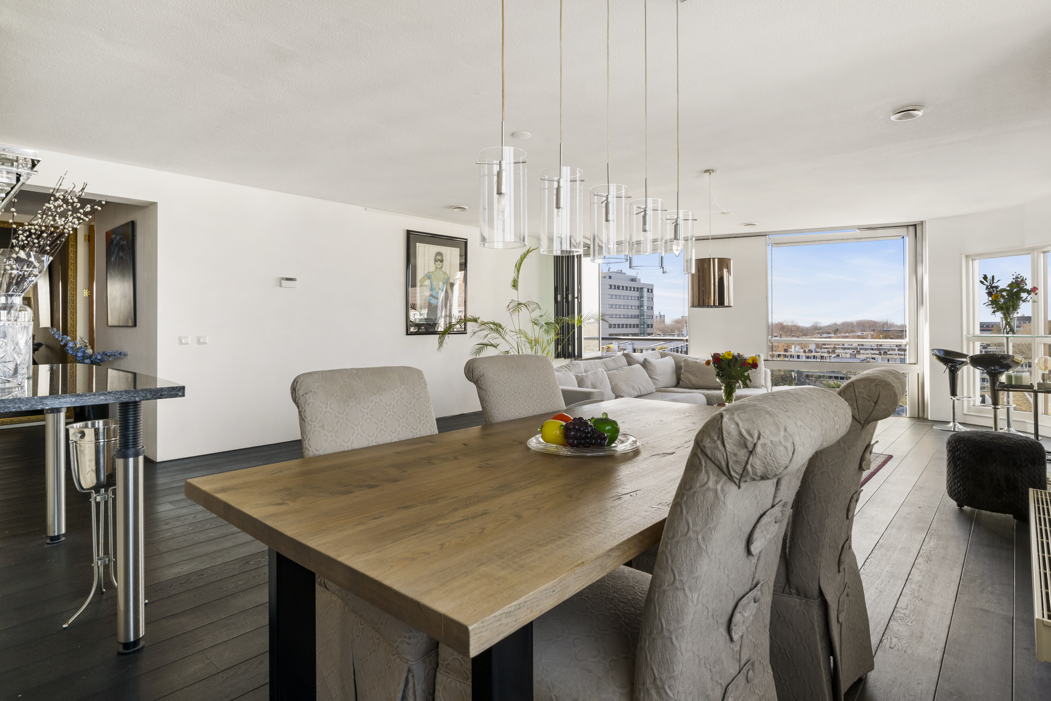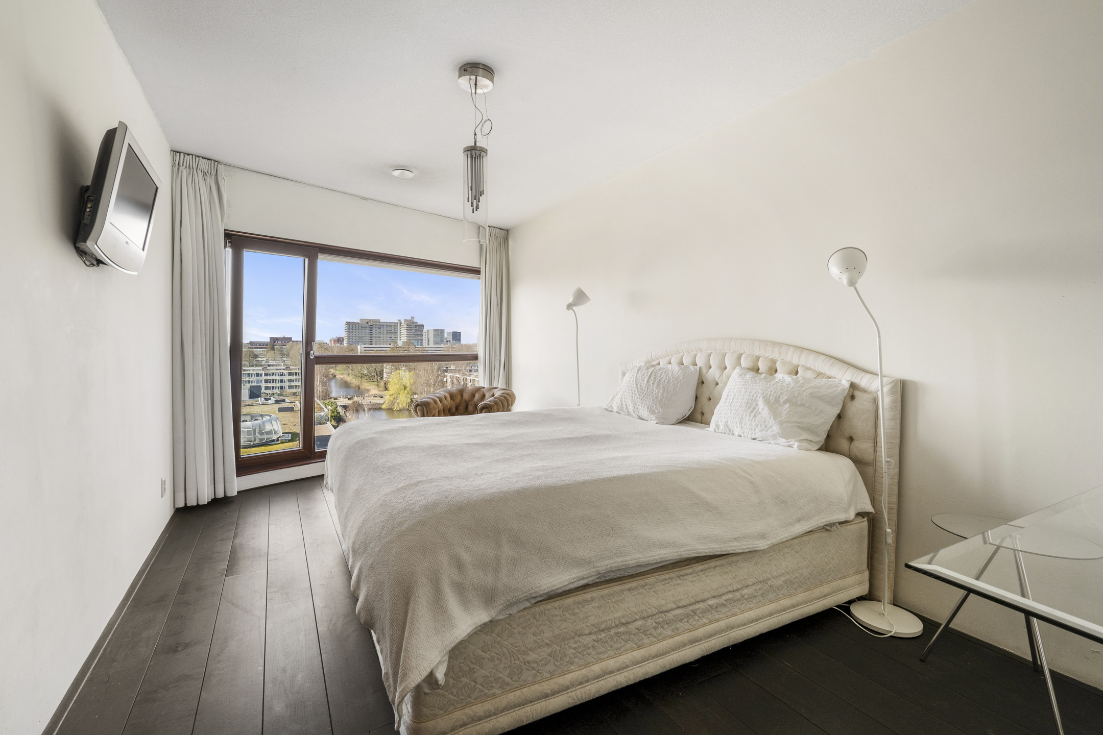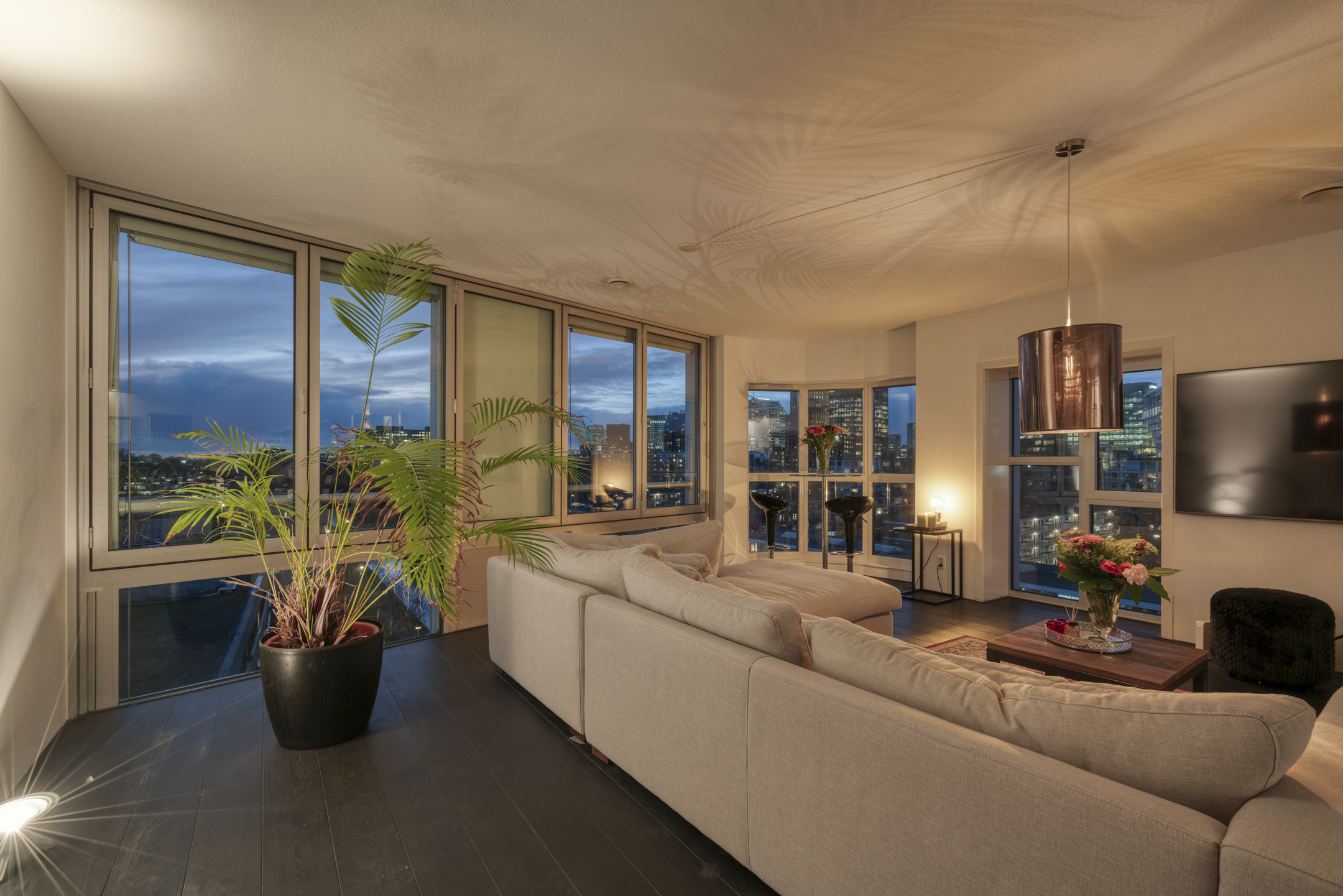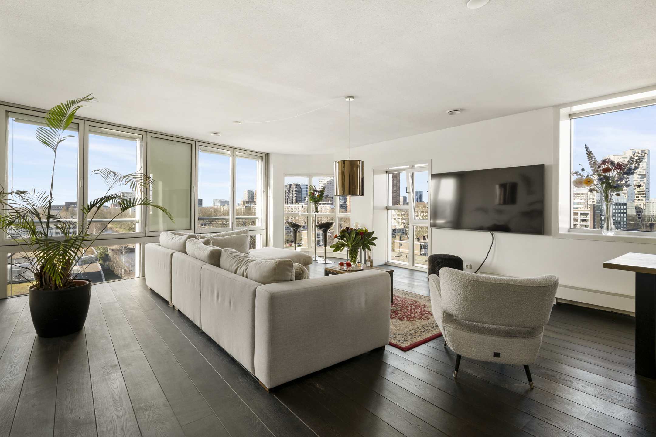 Apartment Amsterdam on the seventh floor of the Gelderhof complex offers 117 m² of refined living space and panoramic views over the water and the Zuidas skyline. This corner residence is designed for abundant natural light, with southwest and north-facing floor-to-ceiling windows that frame the city and waterfront vistas. The property features two spacious bedrooms, currently configured as a main suite with walk-in closet, a luminous living area with glass walls and fold-away façade, and a high-spec kitchen with island, solid oak parquet, and built-in appliances, all executed with clarity and purpose.