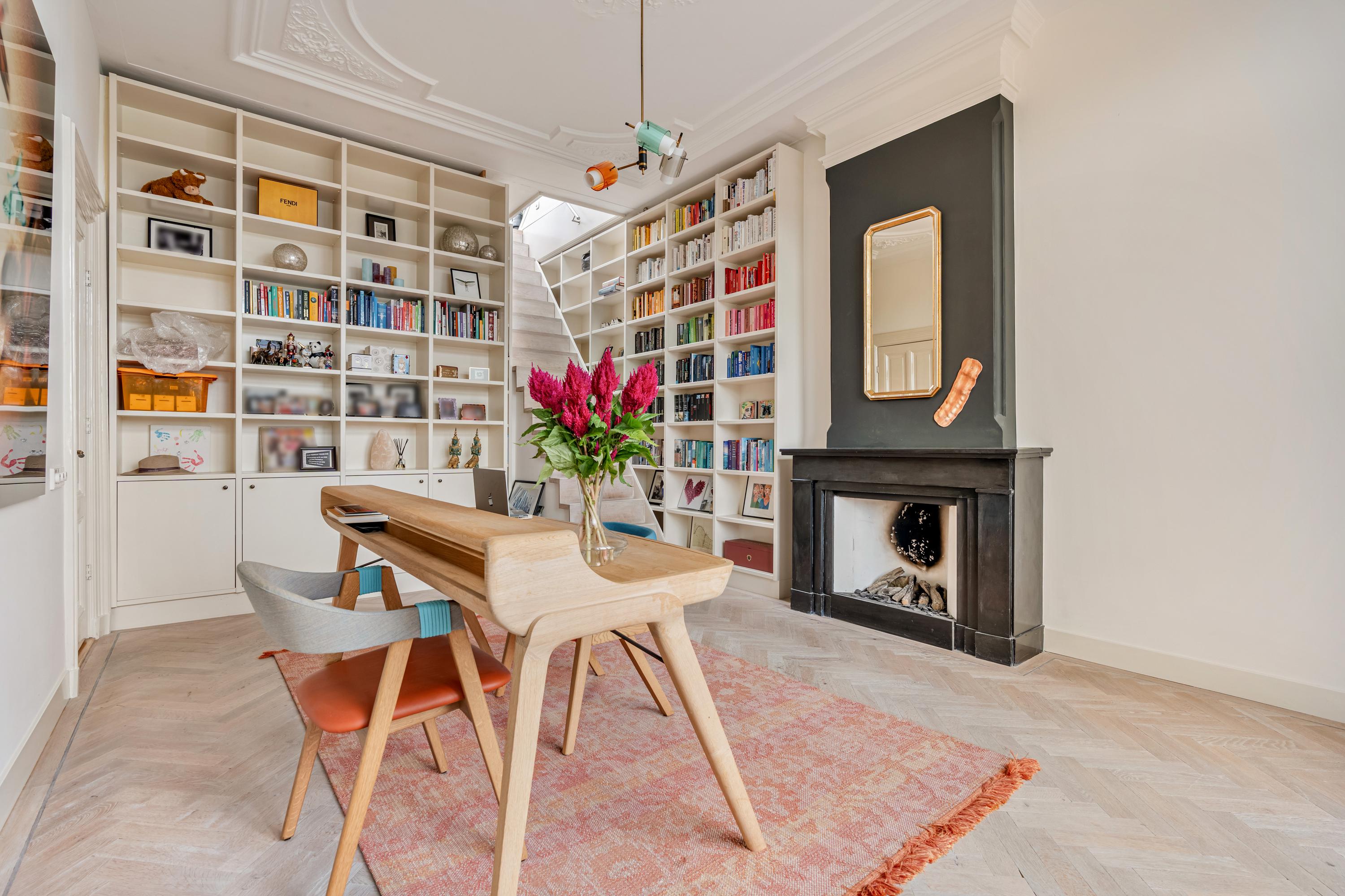 On the third floor, there is a spacious landing with a separate toilet and several rooms, including two bedrooms at the rear, one of which features built-in wardrobes, a fireplace and access to the sunny south-facing balcony. From this room, French doors lead to the generous roof terrace of approximately 58 m², where you can enjoy the sun and panoramic views of the city all day long. This room is currently used as an office but can easily be converted into an additional bedroom, guest room or studio.