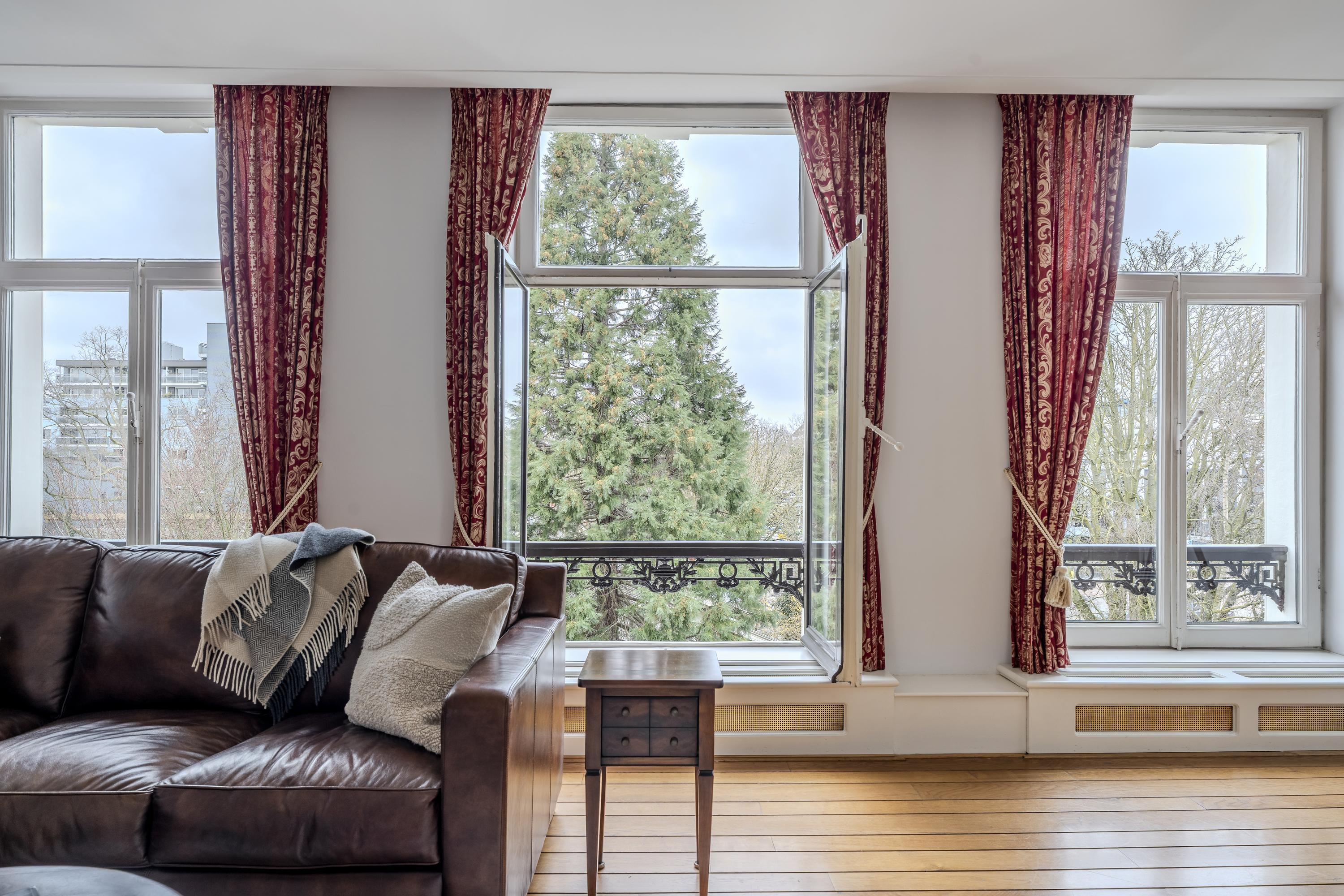 Apartment Amsterdam Vossiusstraat offers a rare confluence of space, privacy, and enduring craftsmanship along one of Amsterdam's most revered addresses. This 130 m² duplex resides in a monumental building directly adjacent to Vondelpark, enveloping you in verdant views and the cultural pulse of Oud-Zuid. From the expansive living room with fireplace and wide French balconies, the lushness of the Vondelpark and the curve of the Singelgracht become part of daily rhythm. The dining area, with an open kitchen and island, flows onto a south-east facing balcony of approximately 4 m², where morning light reveals glimpses of the Rijksmuseum and the energy of P.C. Hooftstraat below.