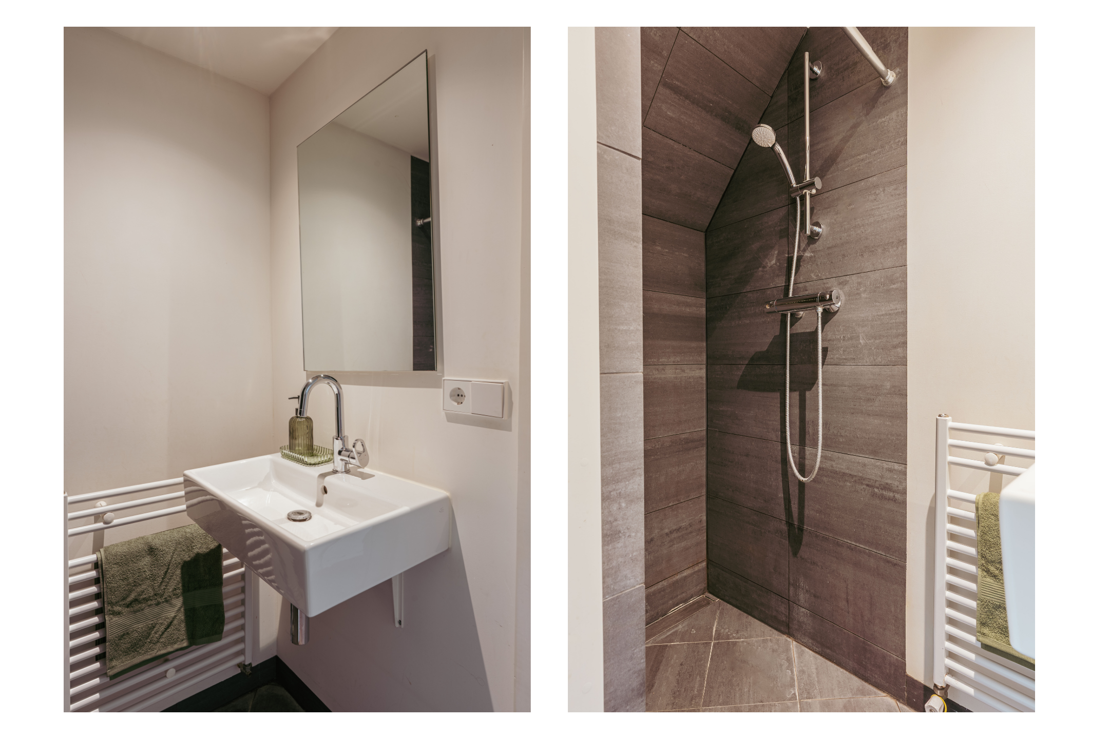 An open staircase in the living room leads to the first floor, which also has its own entrance via the communal staircase. The spacious hallway provides ample space for a coat area and additional storage. Here, you will find the first bathroom, fitted with a walk-in shower, washbasin unit, and a separate WC with a small sink.