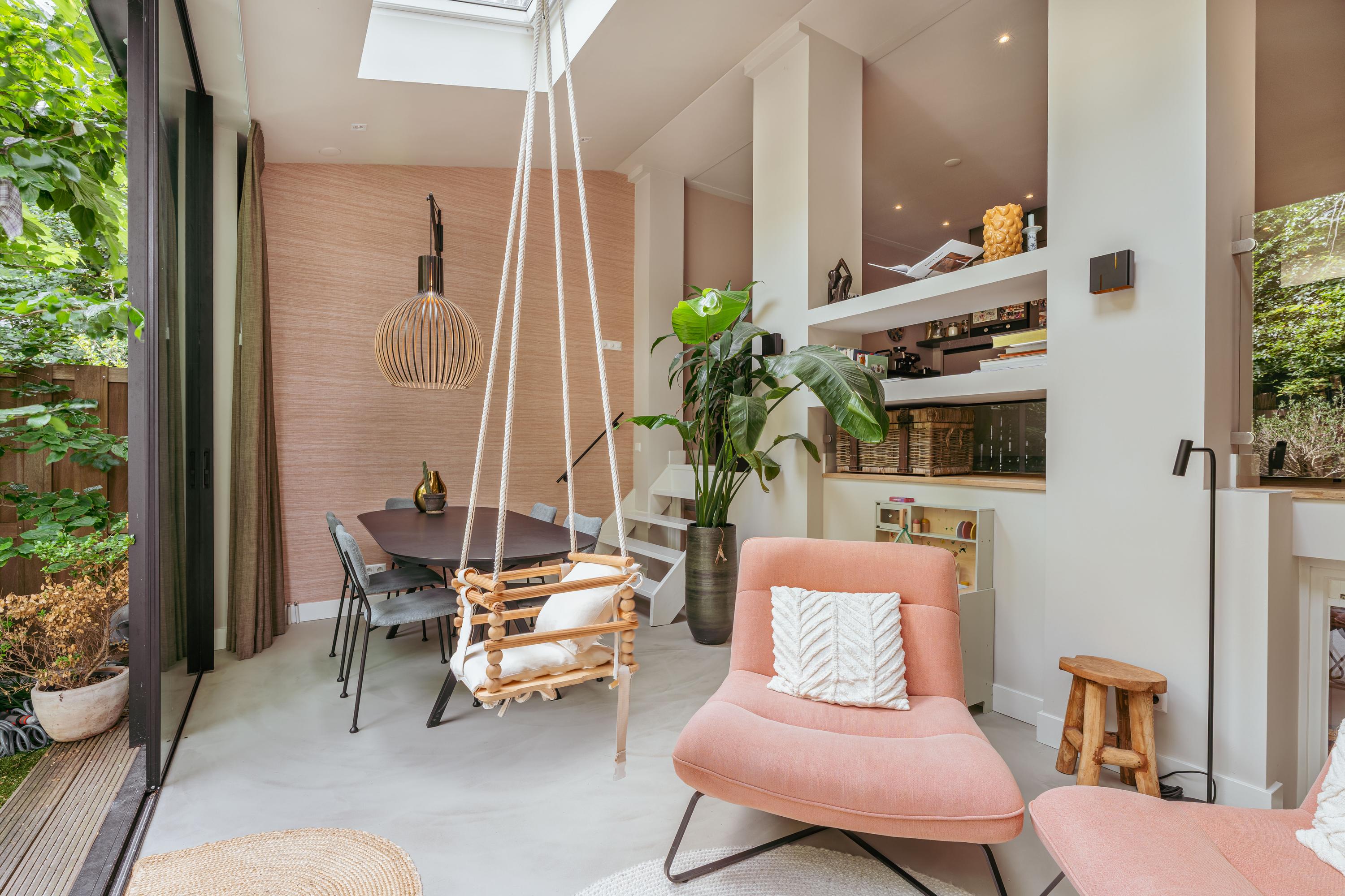 A few steps down, you enter the recently constructed extension with skylights, which allow plenty of natural light to flood the space. This area currently serves as an atmospheric dining room, with an additional seating area arranged around a modern gas fireplace. Floor-to-ceiling sliding glass doors lead to the beautifully landscaped east-facing garden of approx. 32 m², complete with a practical storage shed.