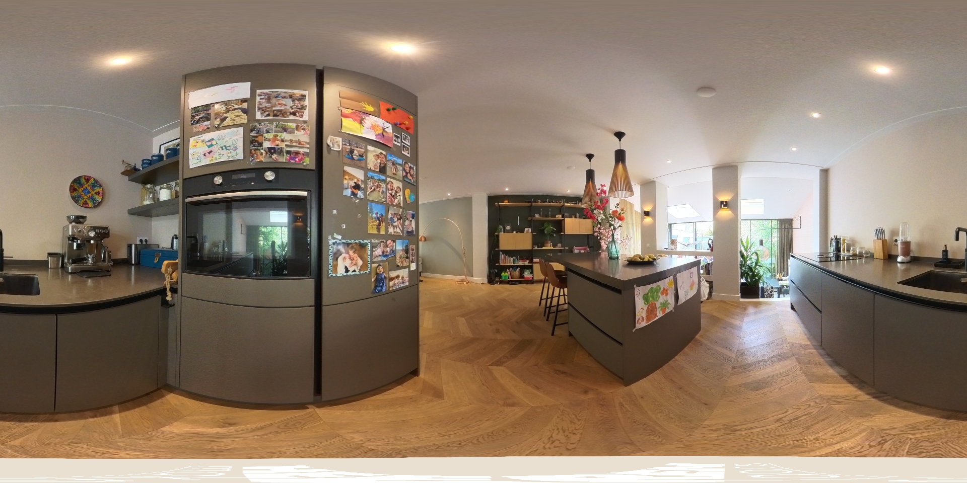 At the front of the property, you'll find the spacious living room, easily large enough to accommodate a comfortable seating area. Centrally located is the open kitchen, featuring a stylish cooking island and cozy bar area. The kitchen is equipped with high-quality built-in appliances, including a 4-burner induction hob with integrated extractor, dishwasher, fridge/freezer combination, combi-oven, and a Quooker.