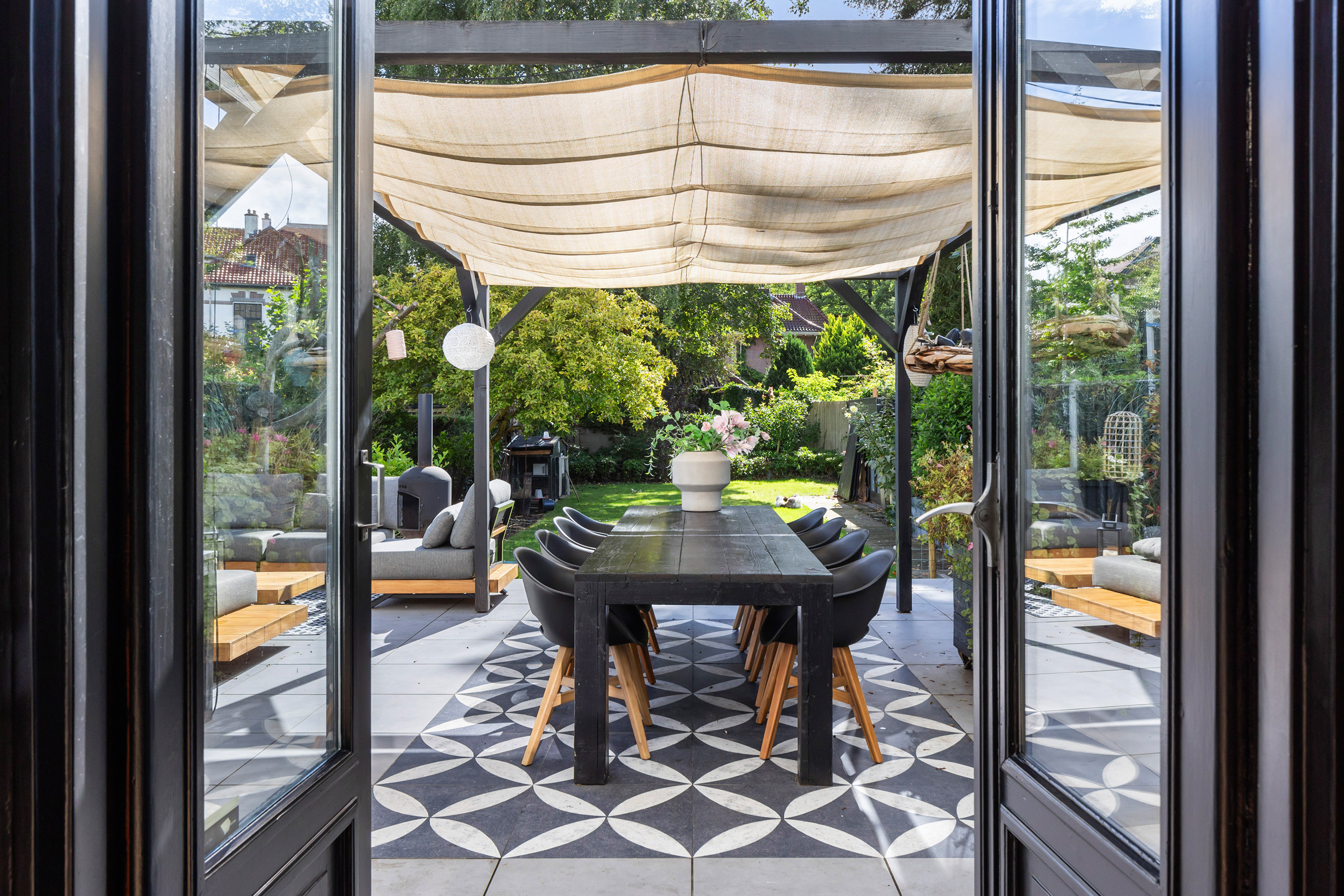De achtertuin is circa 30 meter diep, volledig besloten en gelegen op het zuidwesten. Dankzij de volgroeide bomen en het groen rondom geniet u hier van optimale privacy. Het royale terras biedt ruimte voor zowel een grote loungeset als een eettafel, zodat u op elk moment van de dag van zon of schaduw kunt genieten. Verder is er een gazon, een kippenren en een houten berging aanwezig.
